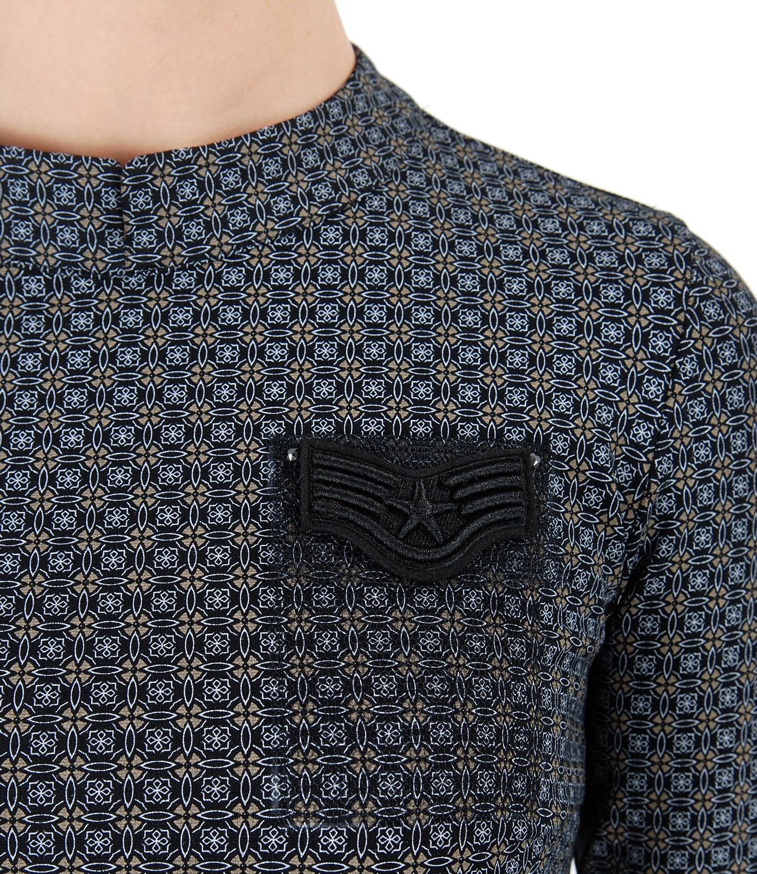Elegant dress made of fabric with geometric print, unlied, with tunic collar, long sleeves and tulle pocket embellished with crystals. Closes with hidden zipper on the middle back.