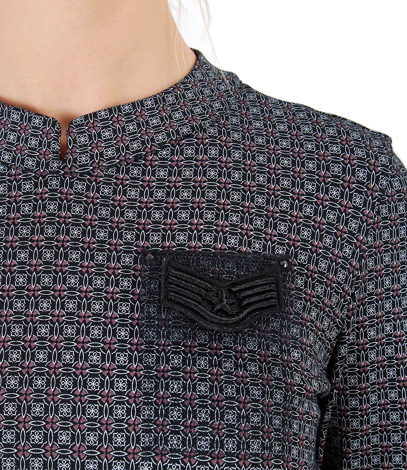 Elegant dress made of fabric with geometric print, unlied, with tunic collar, long sleeves and tulle pocket embellished with crystals. Closes with hidden zipper on the middle back.