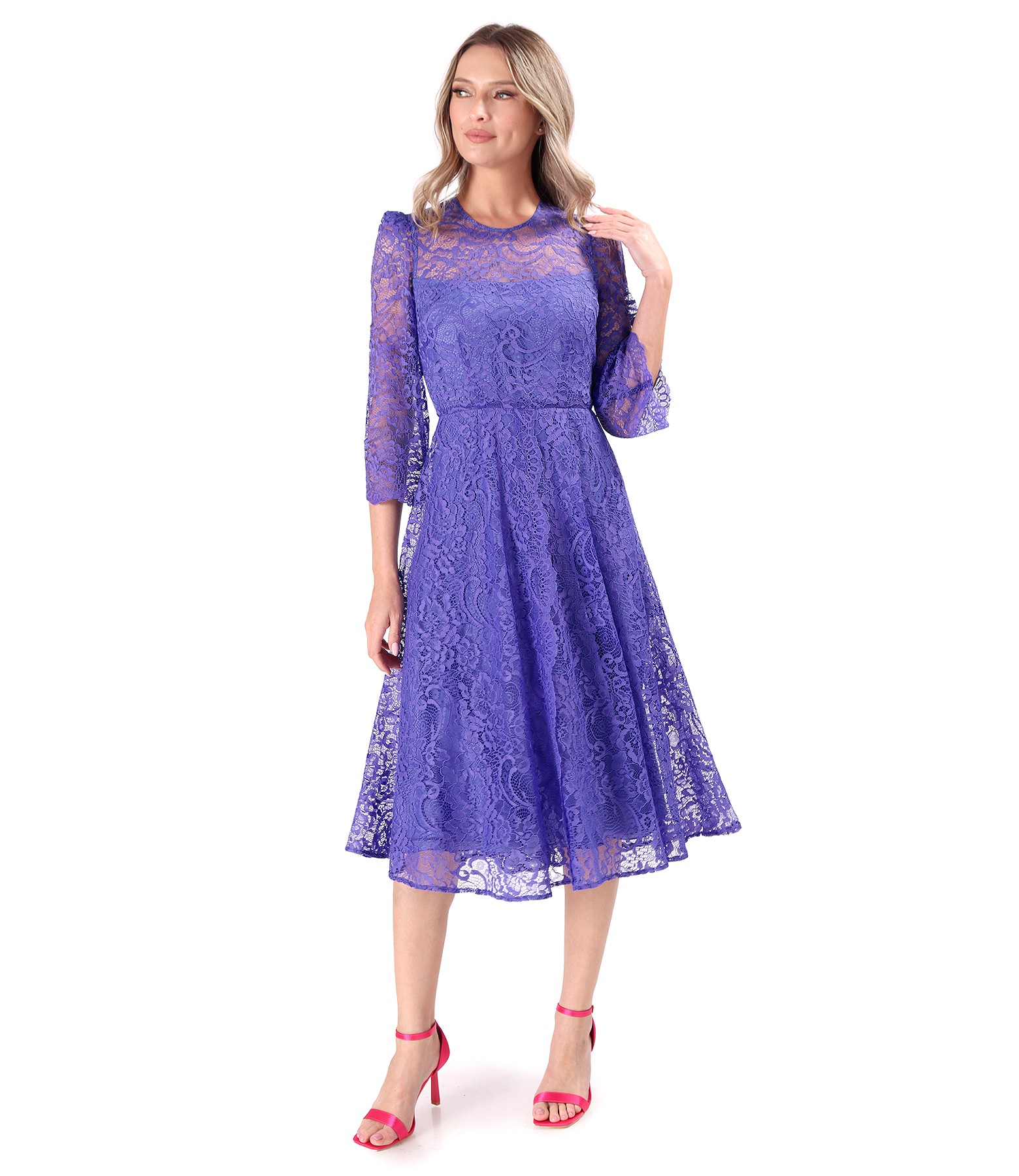 Elegant dress made of fine lace with floral motifs, with 3/4 sleeves and round neckline. The dress is lined with viscose. Closes with a hidden zipper on the middle back.