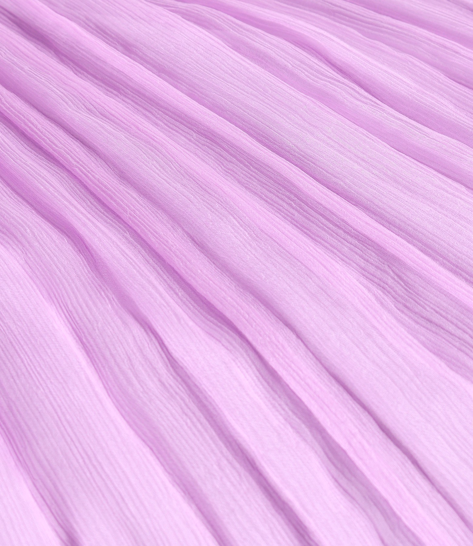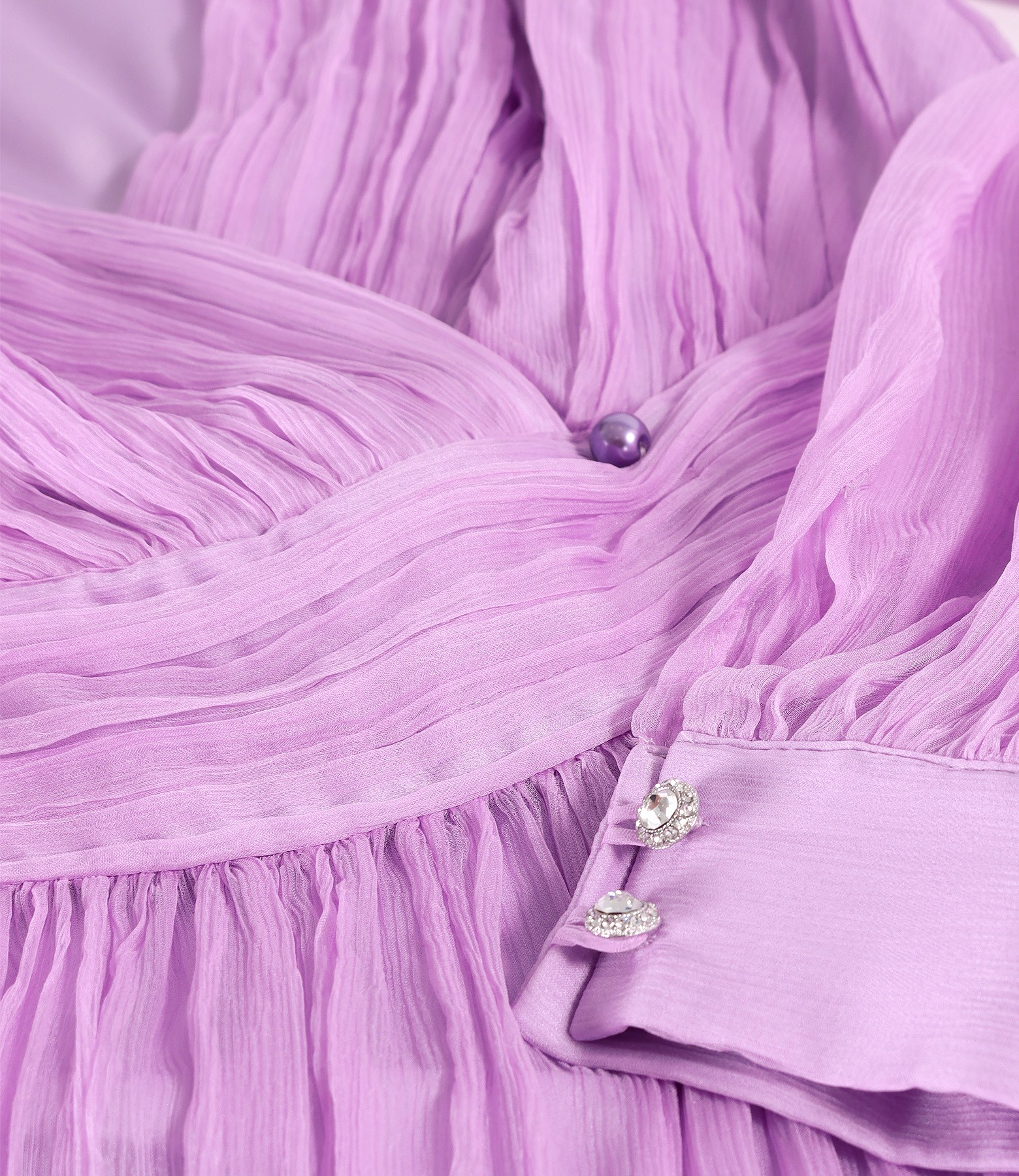 Elegant dress made of natural silk veil, doubled with satin, fringed on the bust and long sleeves wrinkled with cuffs with 2 buttons, and with pearl sewn at the waist. It closes with a hidden zipper on the left side.