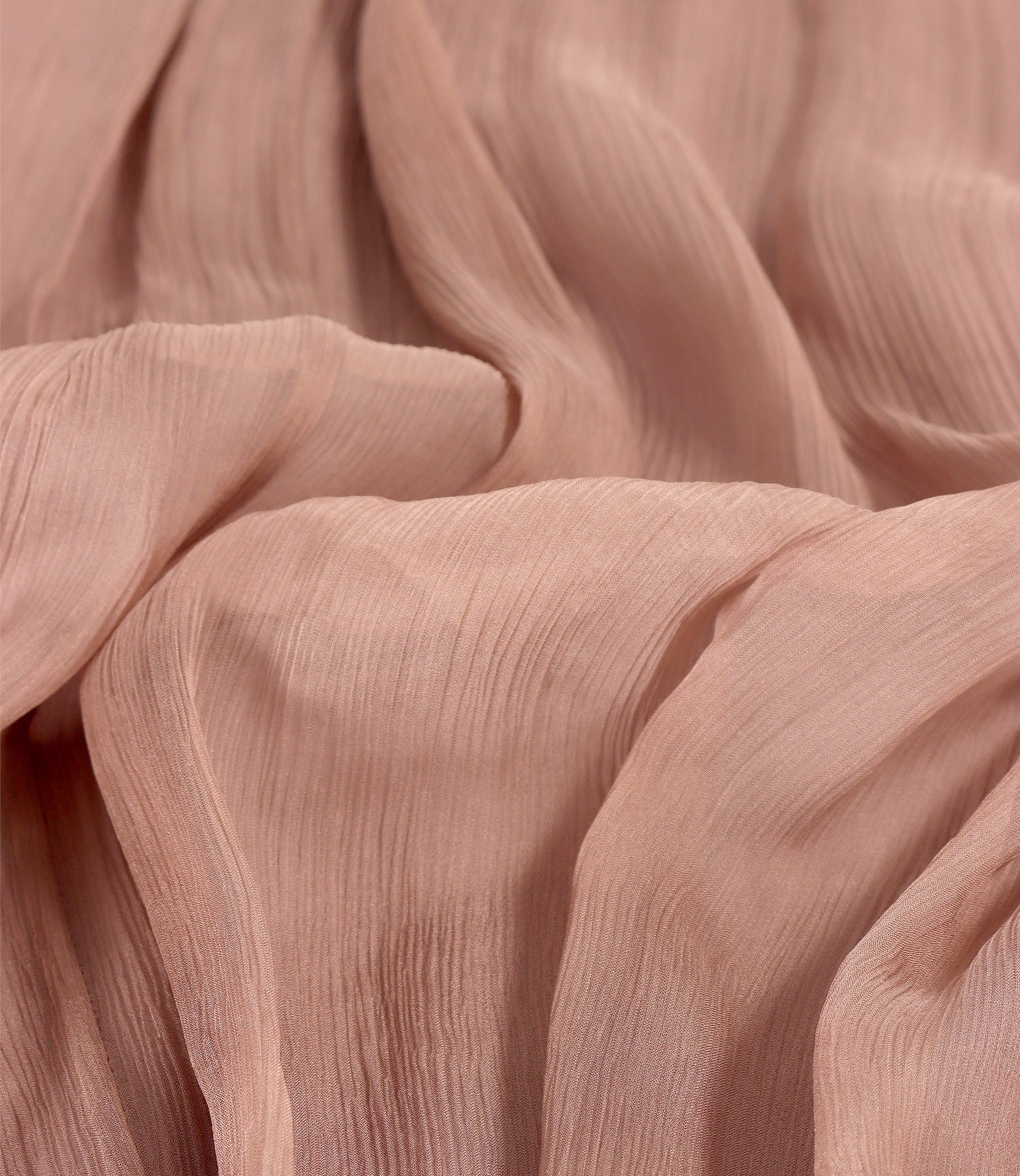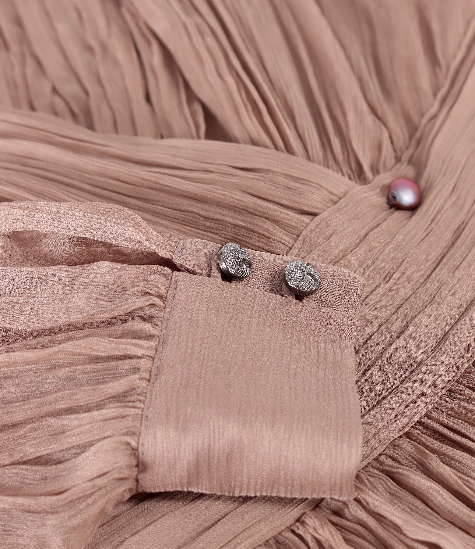Elegant dress made of natural silk veil, doubled with satin, fringed on the bust and long sleeves wrinkled with cuffs with 2 buttons, and with pearl sewn at the waist. It closes with a hidden zipper on the left side.
