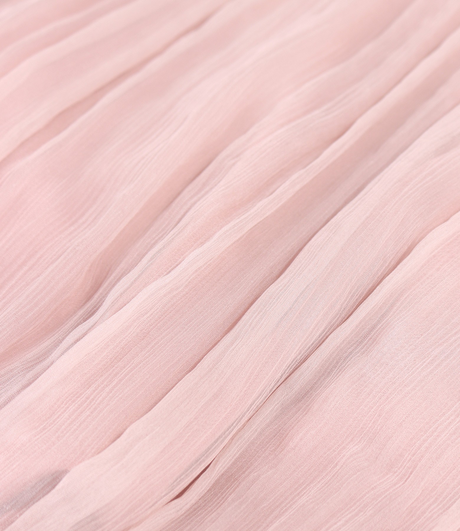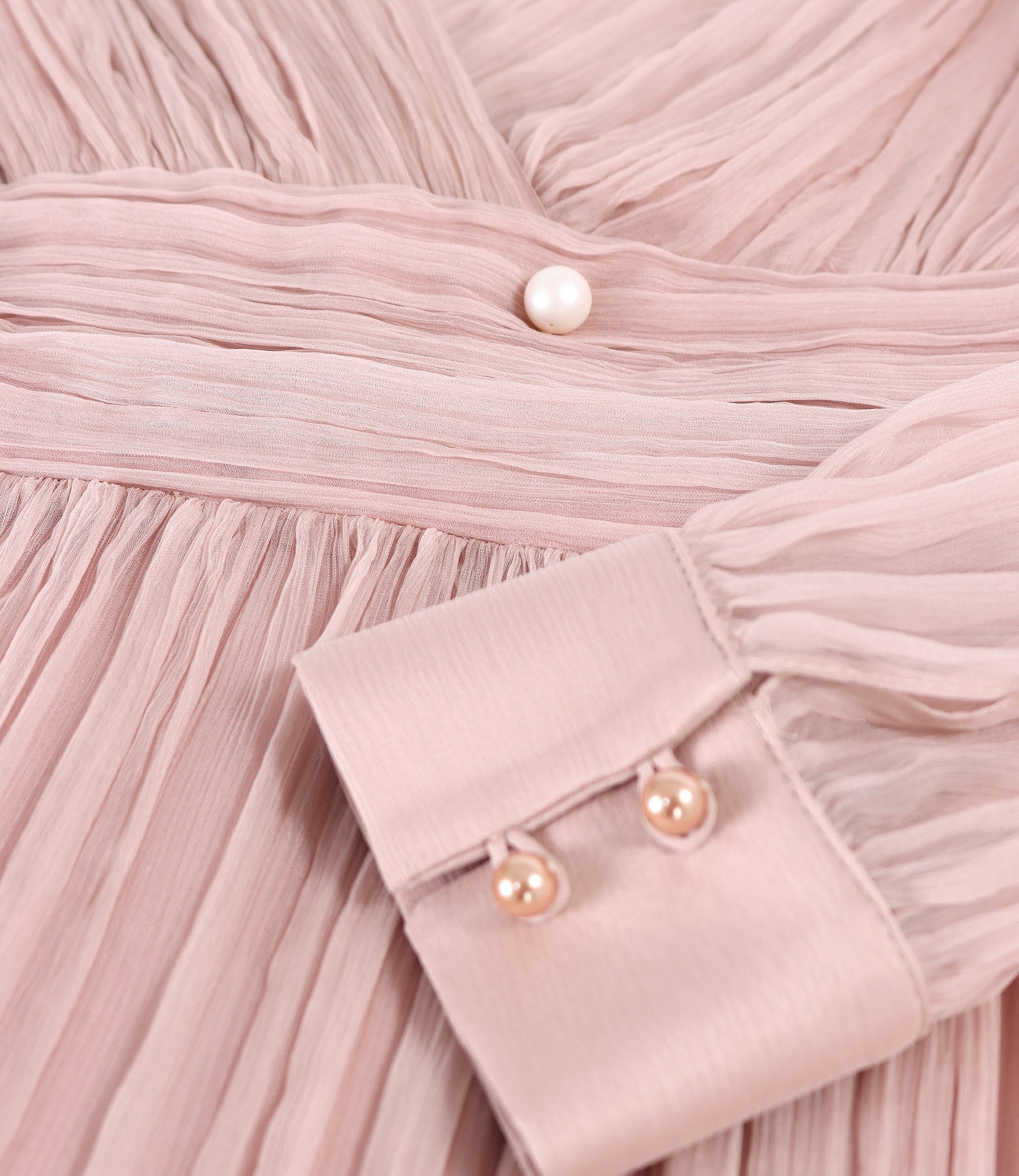 Elegant dress made of natural silk veil, doubled with satin, fringed on the bust and long sleeves wrinkled with cuffs with 2 buttons, and with pearl sewn at the waist. It closes with a hidden zipper on the left side.