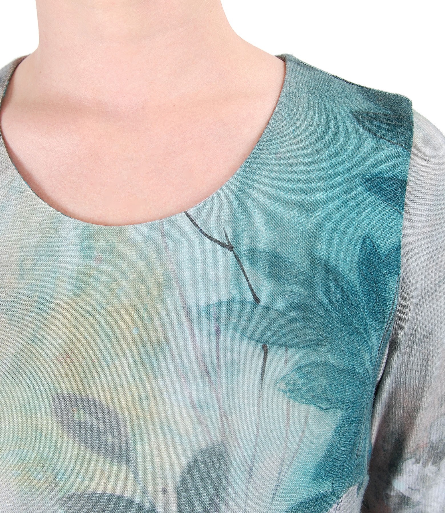 Elegant dress, unlined, made of jersey printed with flowers, long sleeves, round low-cut neck. Have no closing system.