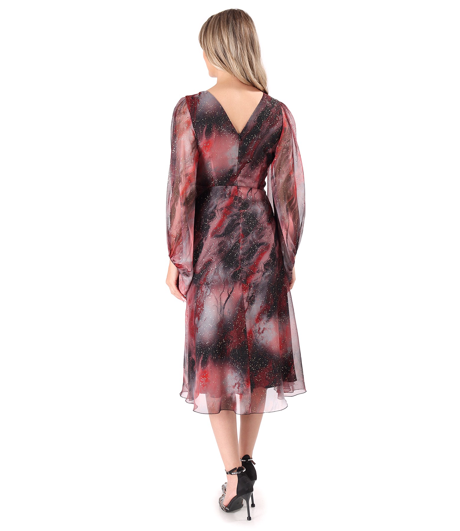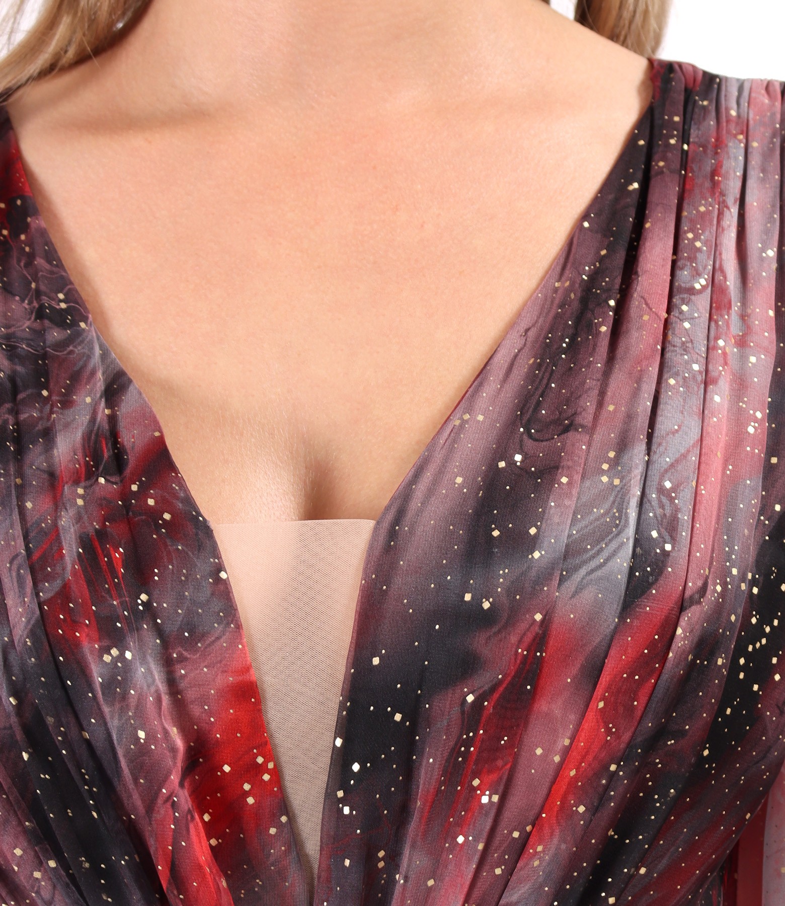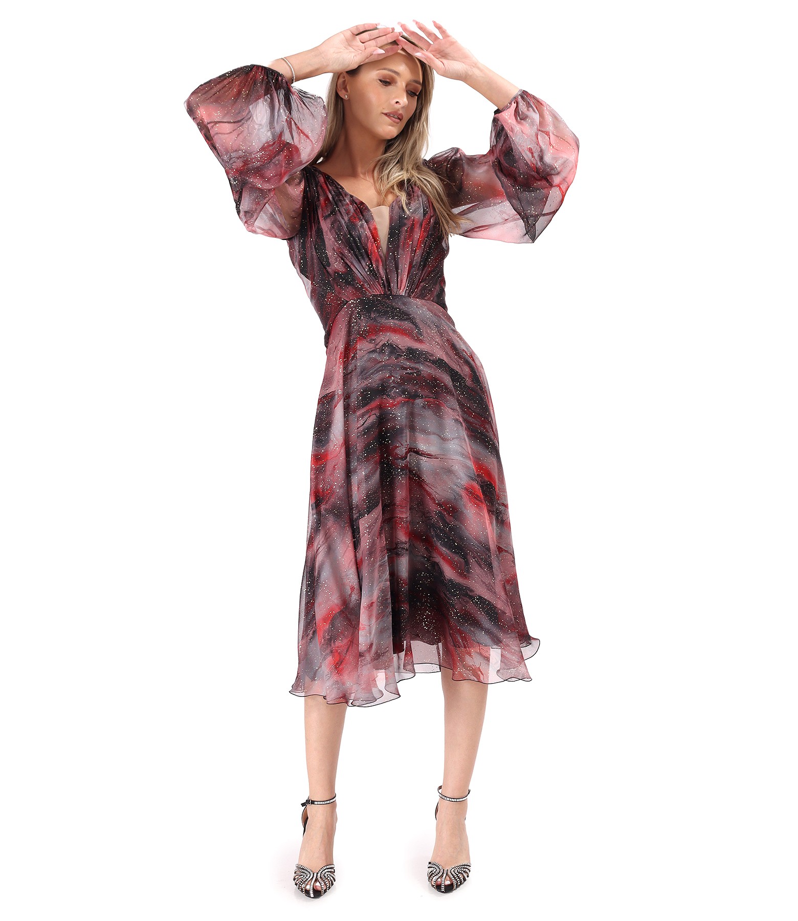 Elegant dress made of printed veil with golden motifs, with long, wide sleeves, gathered at the ends, and a deep V-neckline. Fastens with a concealed zipper at the back.