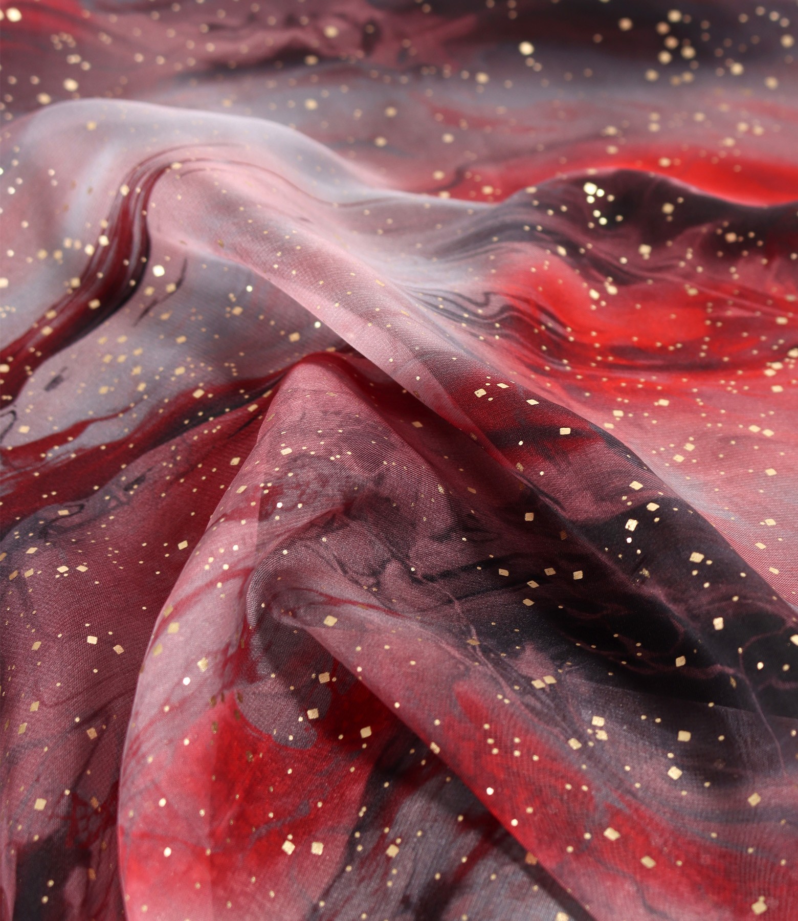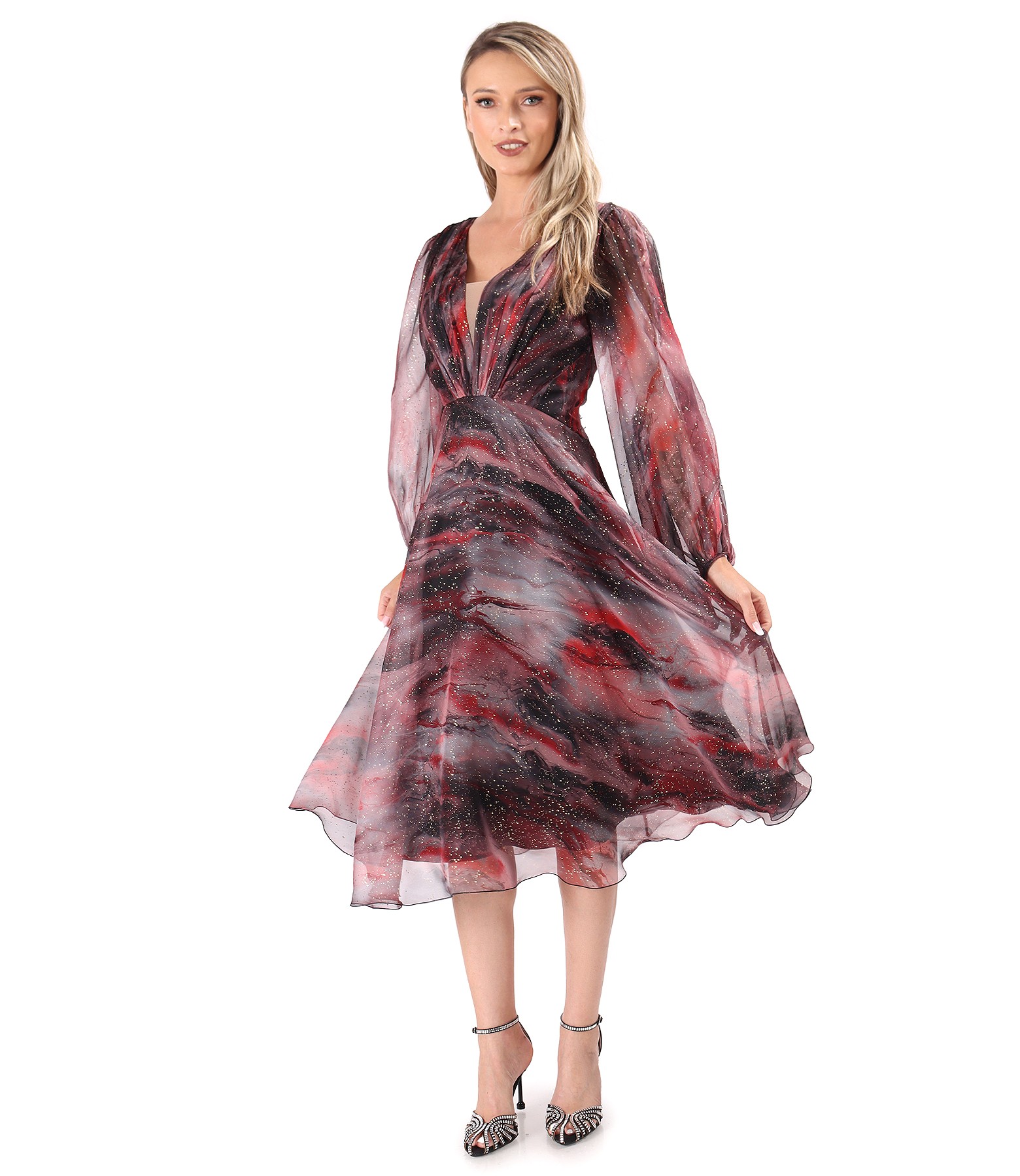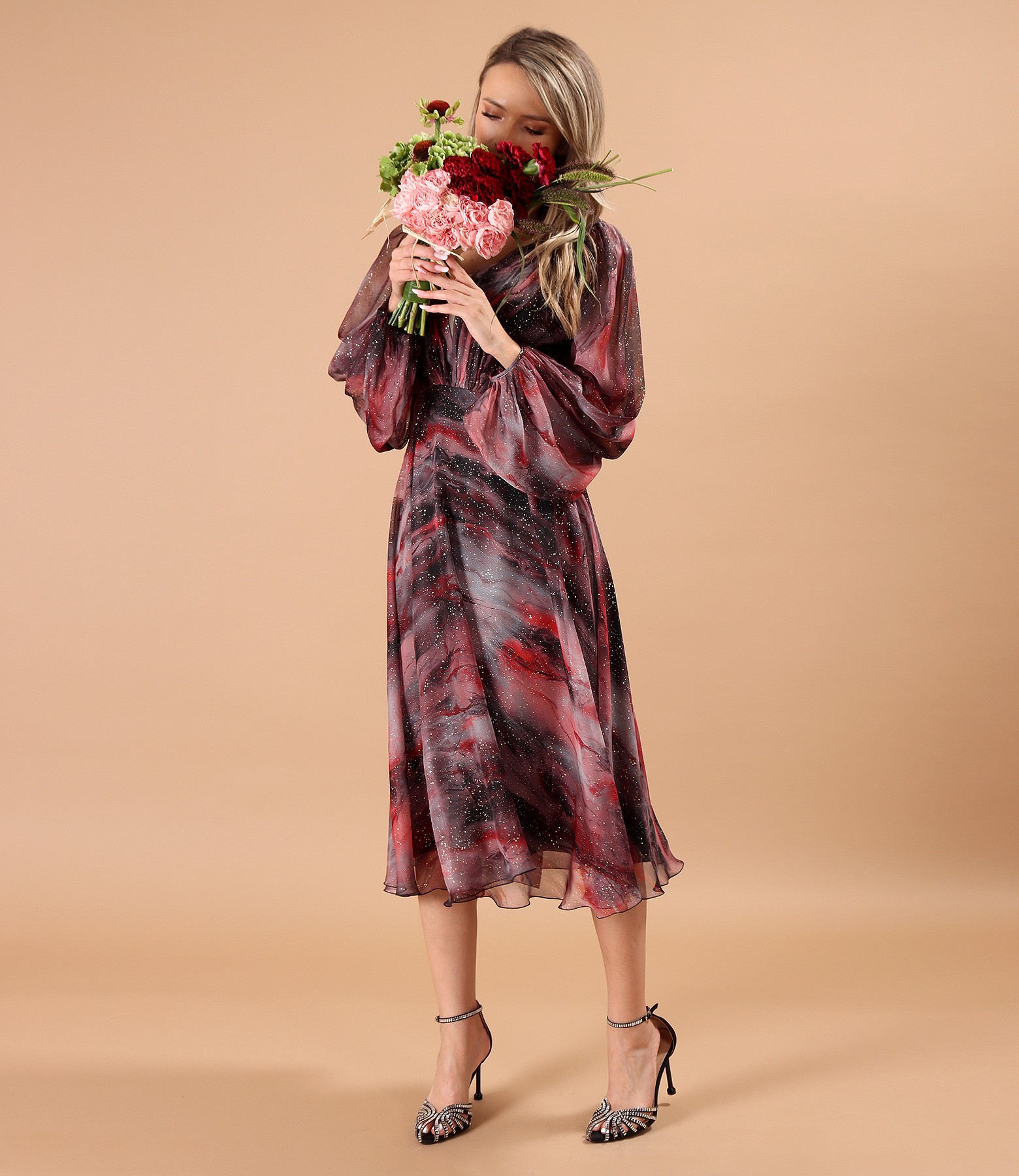 Elegant dress made of printed veil with golden motifs, with long, wide sleeves, gathered at the ends, and a deep V-neckline. Fastens with a concealed zipper at the back.