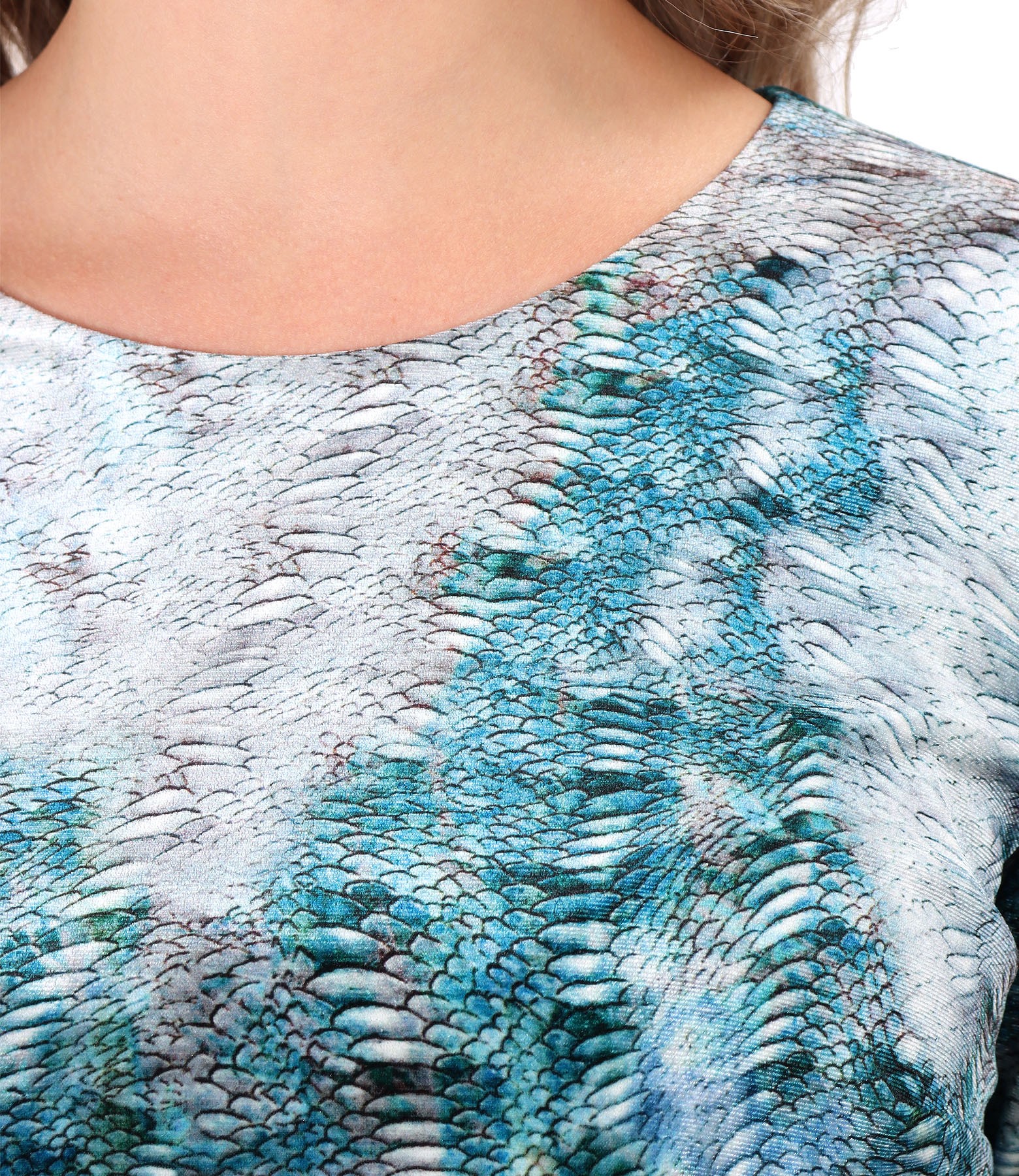 Dress made of printed elastic velvet, padded, with long sleeves and round neckline. Closes with a hidden zipper on the middle back.