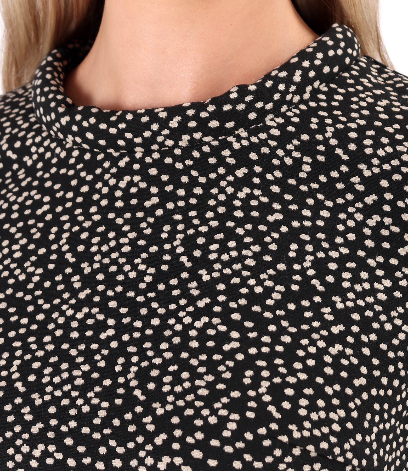 Elegant dress made of thick elastic brocade fabric, unlined, with 3/4 sleeves with contrast border, side pockets with heart decoration, and tubular collar. It closes with a hidden zipper in the middle of the back.