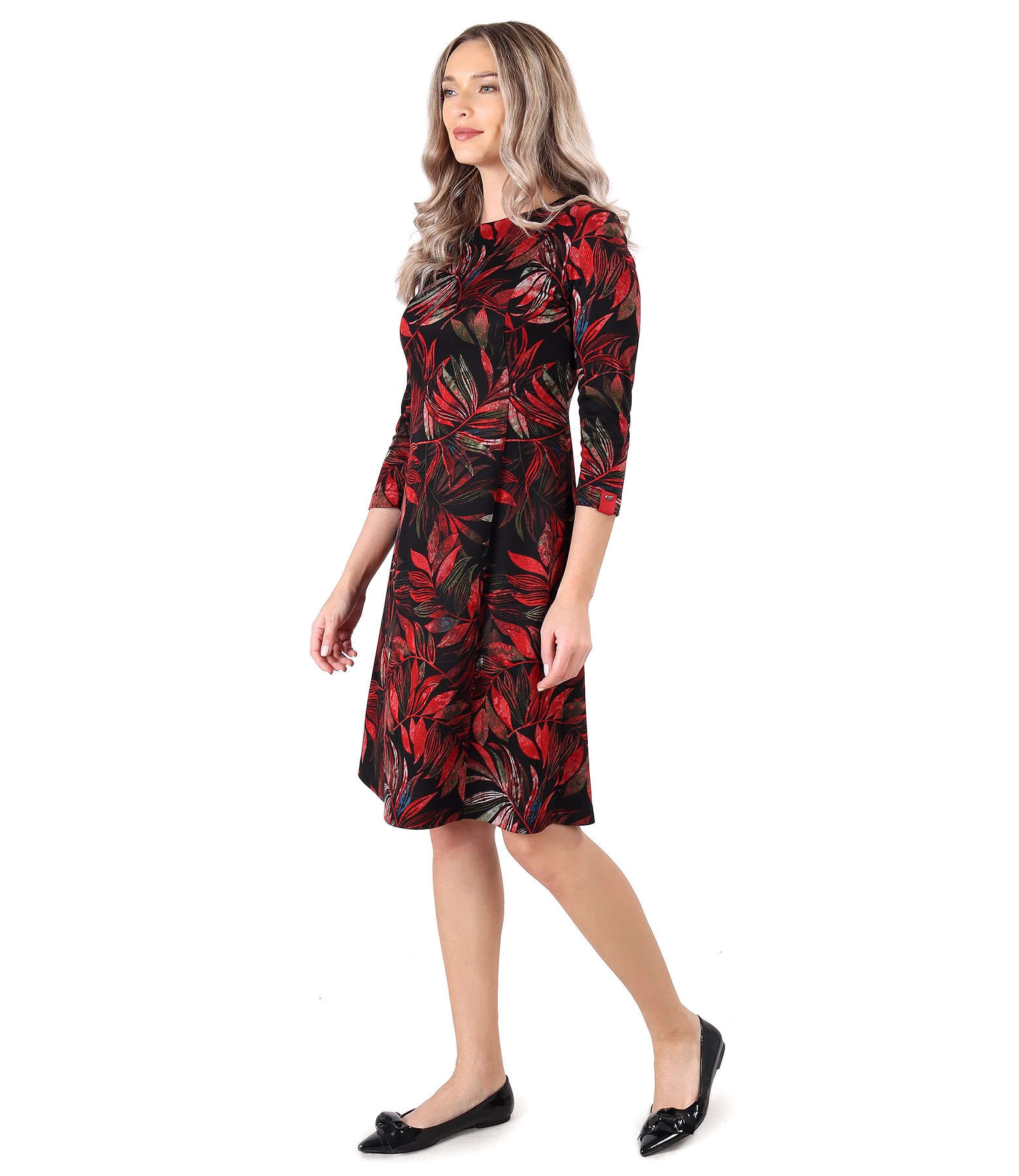 Flared dress made of thick elastic jersey printed with floral motifs, with 3/4 sleeves and round decolletage. Closes with a zipper hidden in the middle of the back.