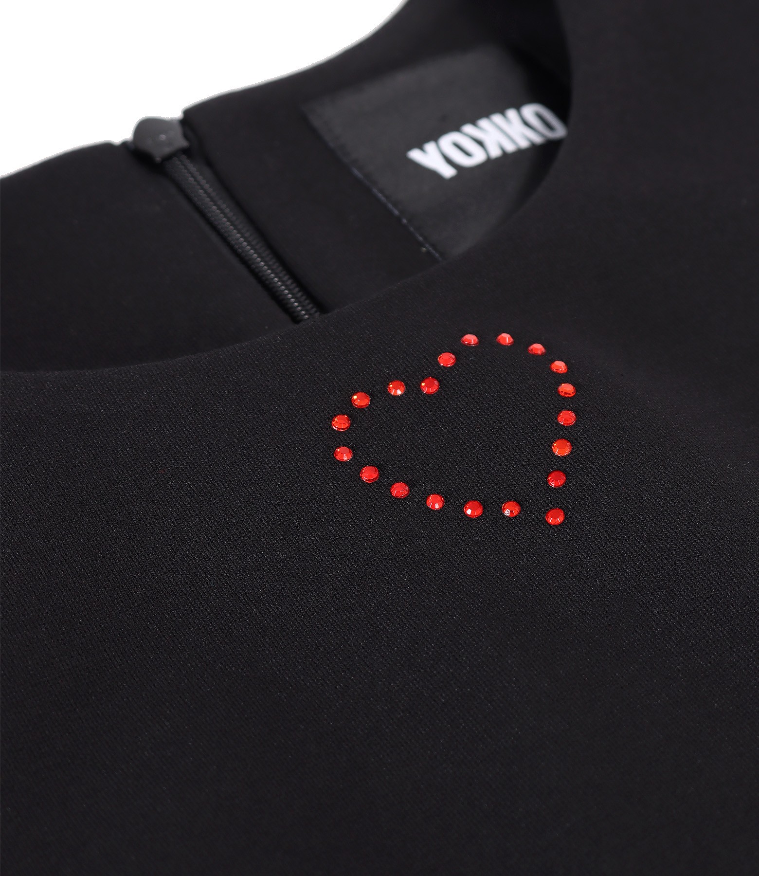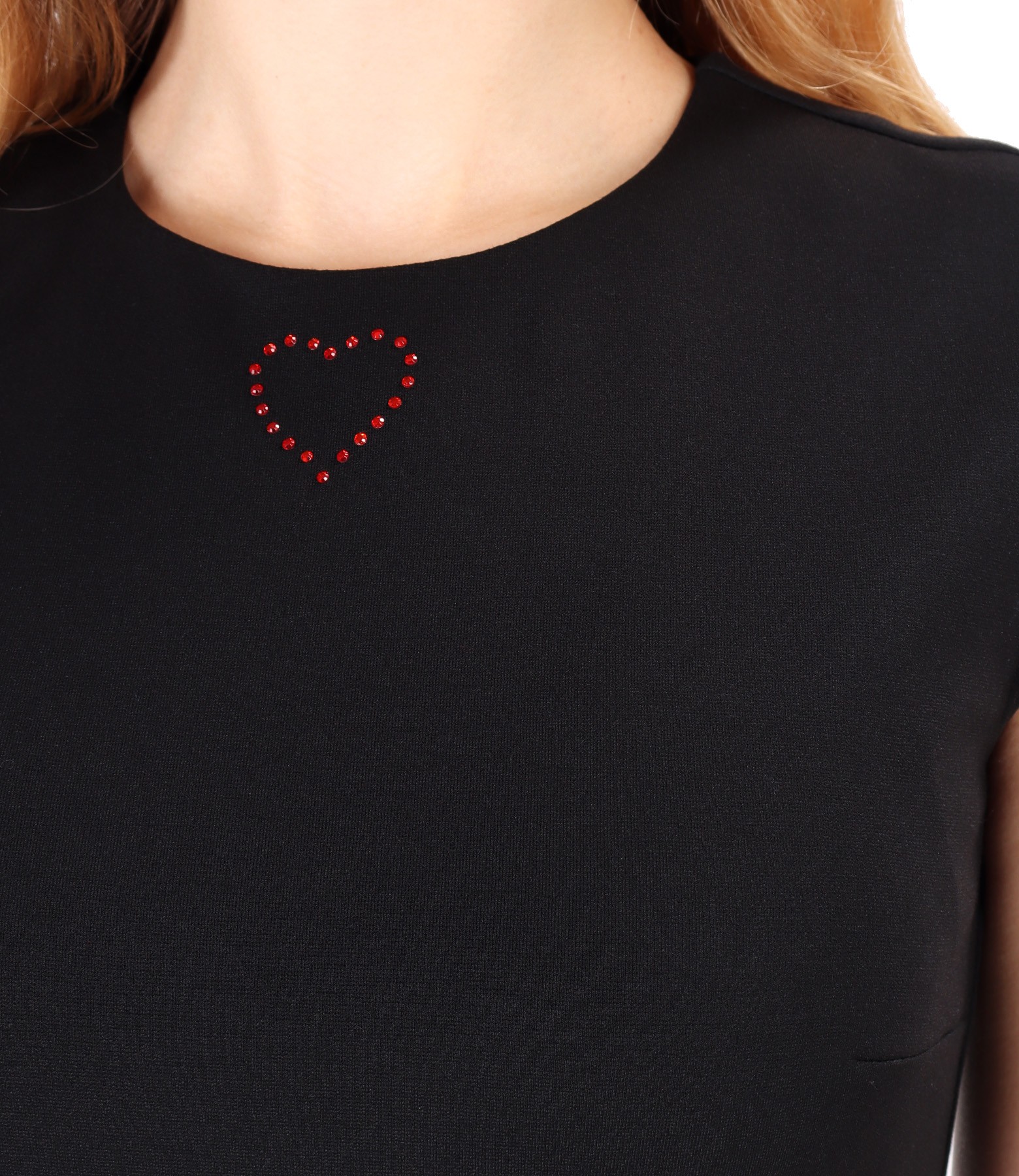 Elegant dress made of thick elastic jersey, unlined, with short sleeves, round decolletage, and red heart on the face. Closes with a hidden zipper on the middle back.