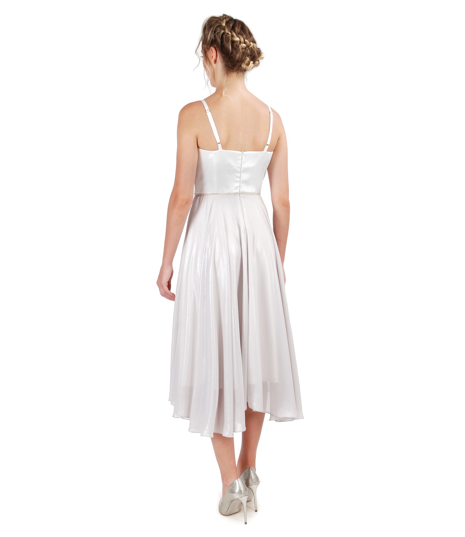 Elegant dress with corset and pearlescent veil skirt , with corset, with cups and adjustable straps, with crystals . Closes with hidden zipper on the middle back.