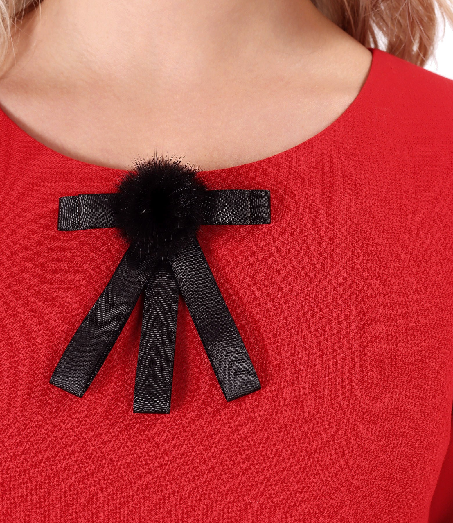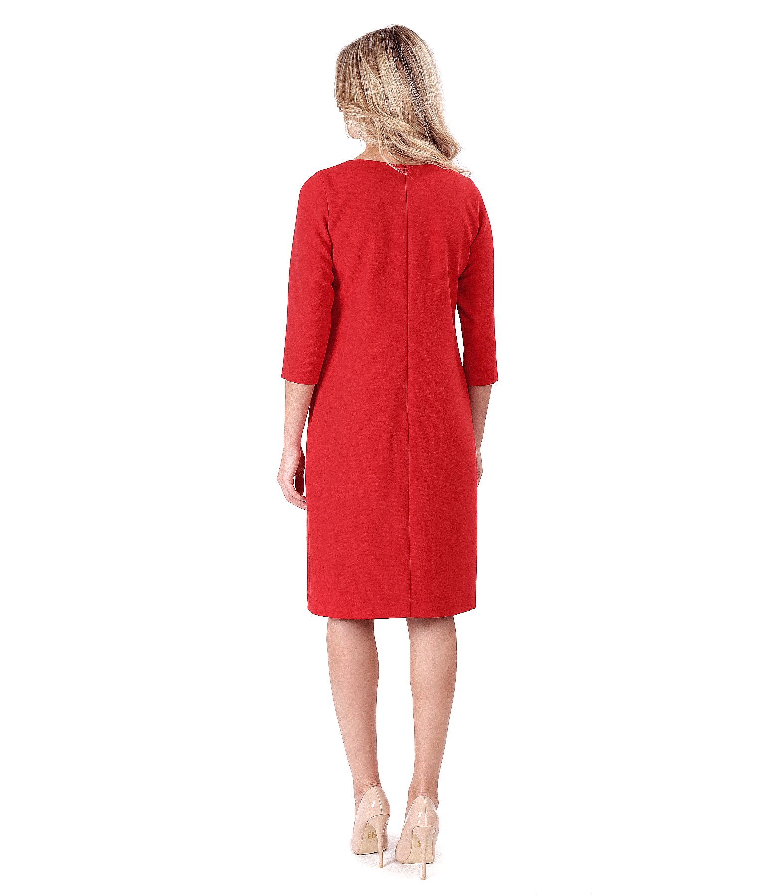 Red elastic fabric dress, padded, with 3/4 sleeves, round low-cut neck and detachable brush on the decolletage. Closes with hidden zipper on the middle back.