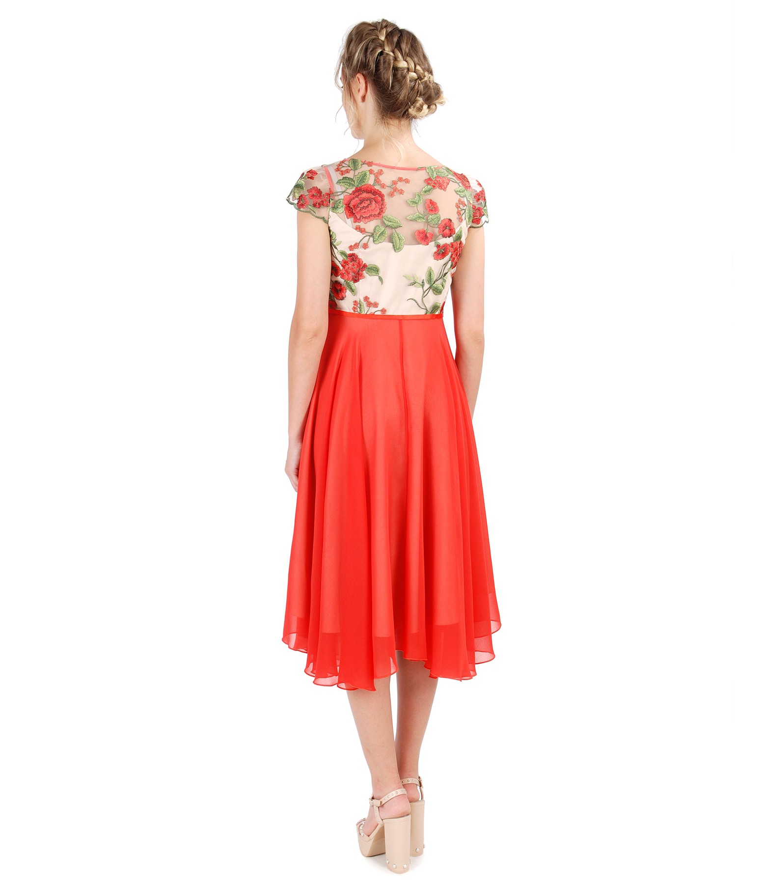 Elegant dress, with veil skirt, doubled with elastic satin, floral lace corsage. Have a rips waist belt with bow. Closes with hidden zipper on the left side.