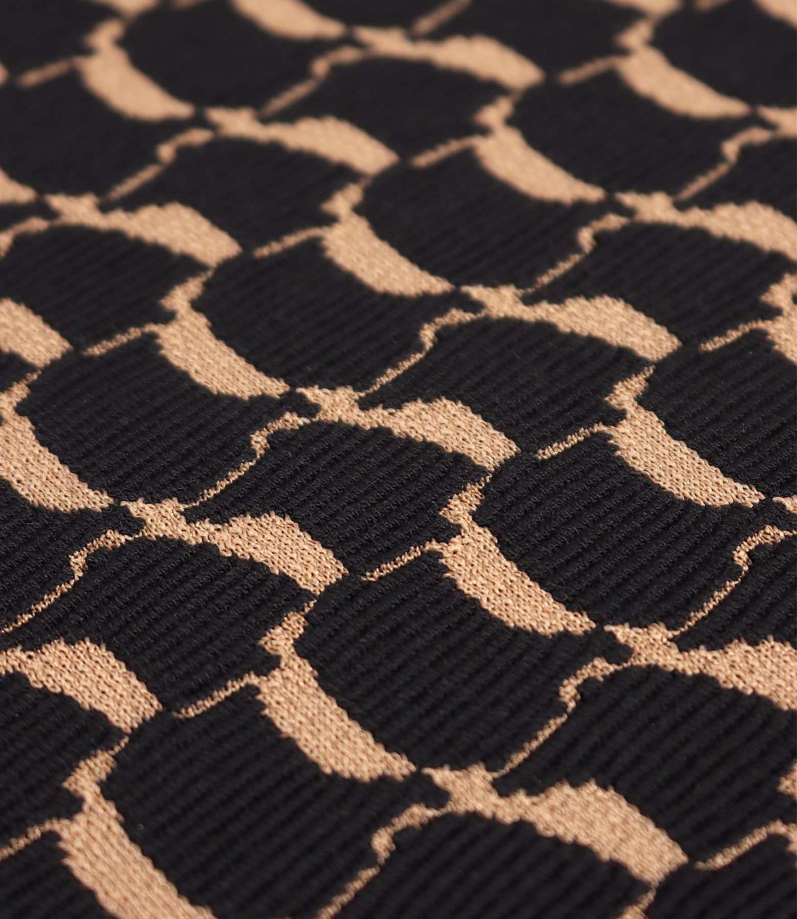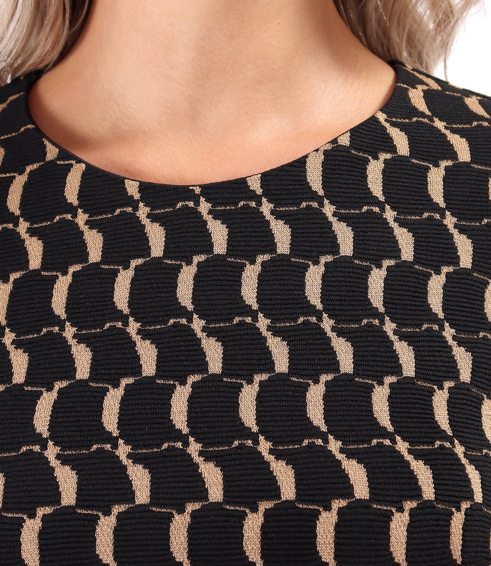 Elegant dress made of elastic viscose fabric with geometric motifs, with long sleeves and round neckline. It closes with a hidden zipper in the middle of the back.