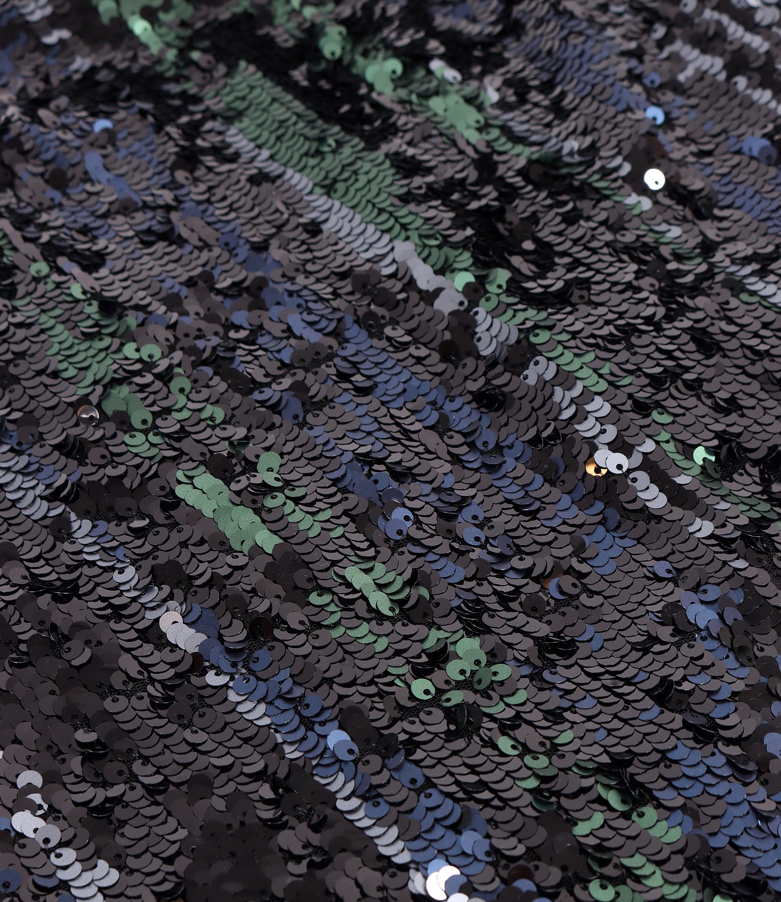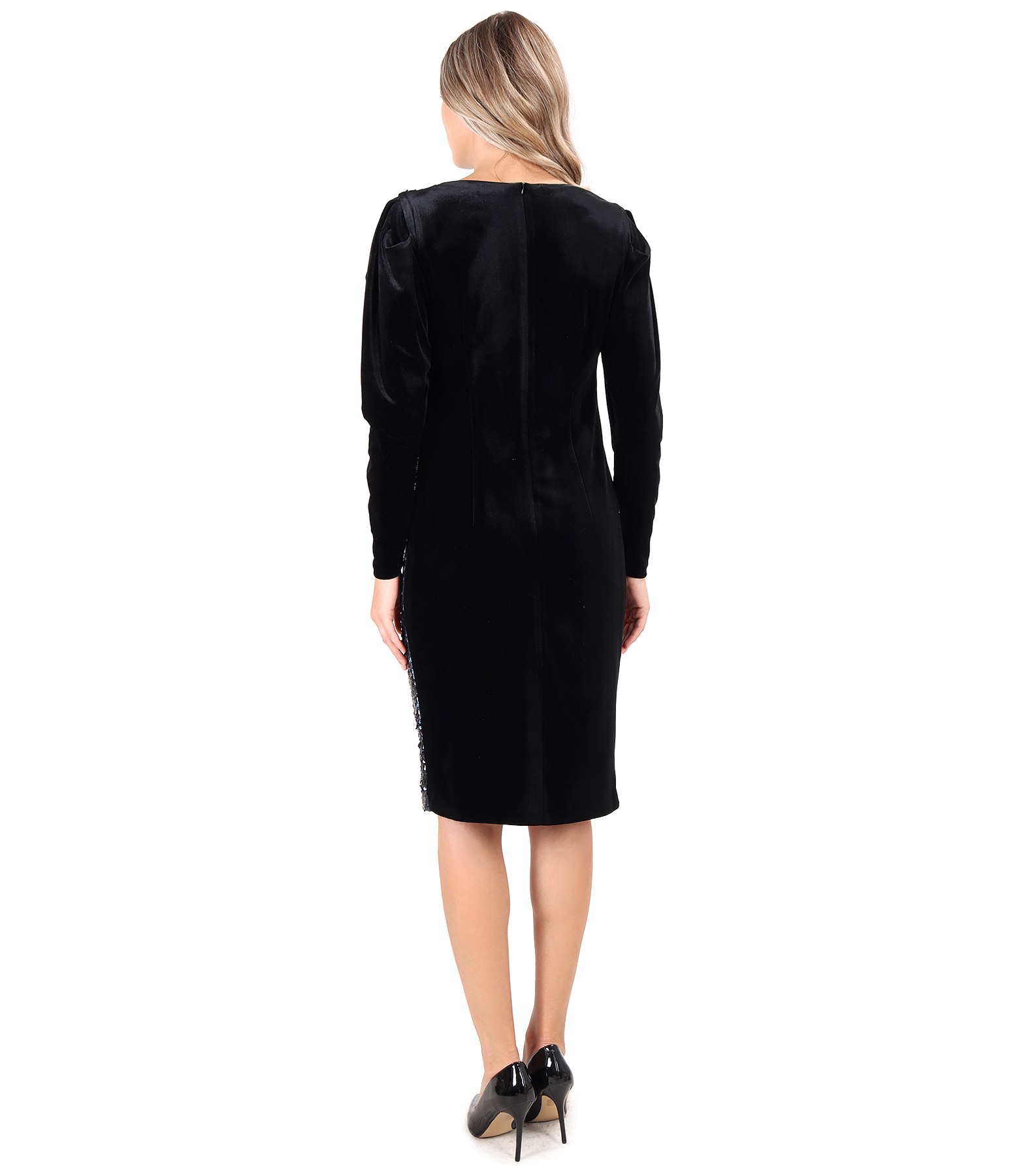 Elegant dress with multicolored sequins front and black elastic velvet back, with long ruffled velvet shoulder sleeves and round neckline. Closes with a hidden zipper on the middle back.