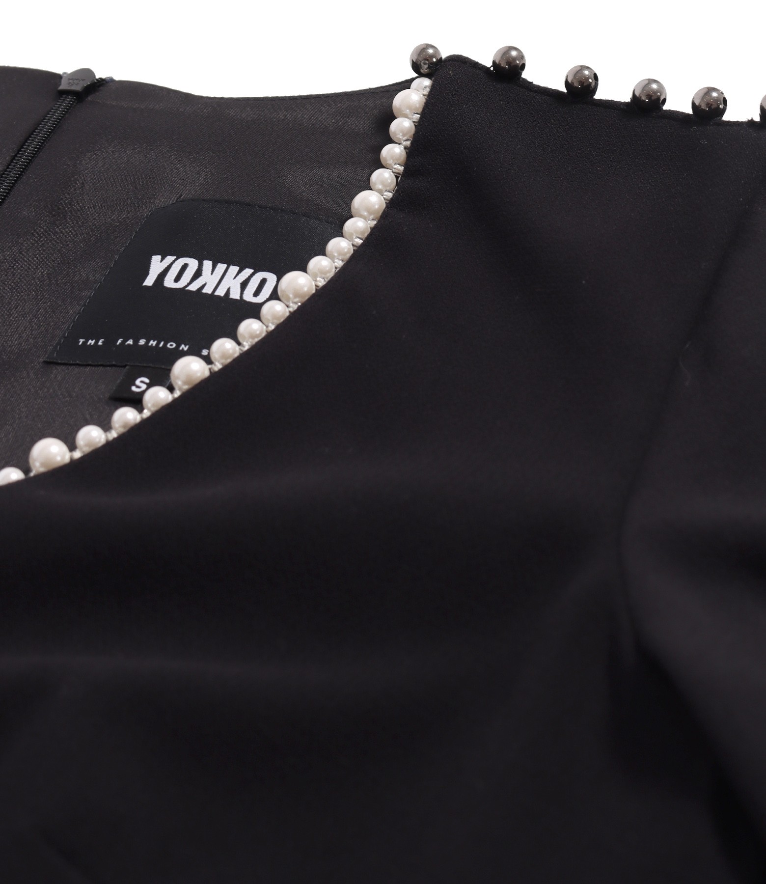 Elegant dress made of elastic fabric with viscose, padded, V-neck with pearls, 3/4 sleeves with decorative elastic band at the end. It closes with a hidden zipper in the middle of the back.
