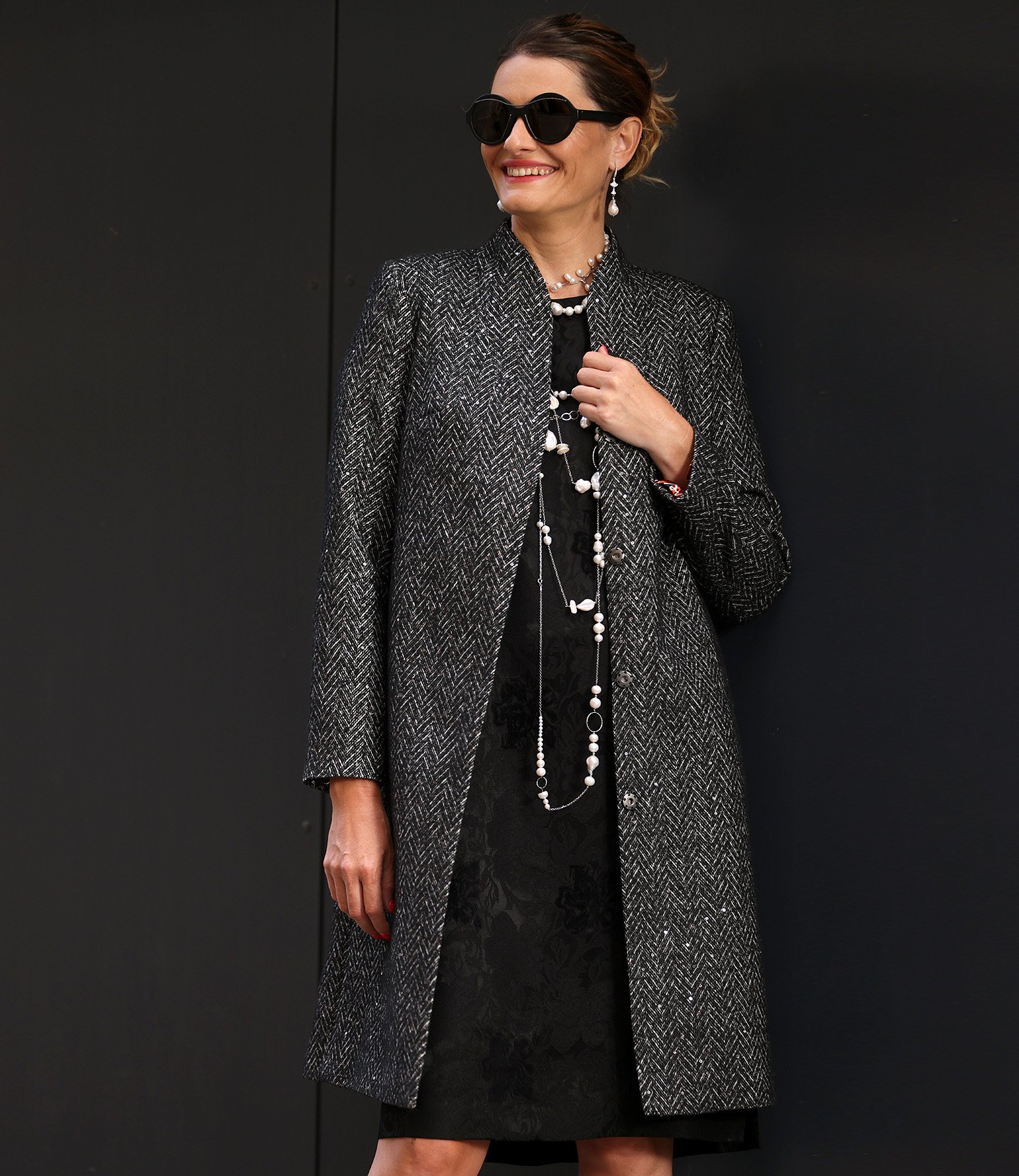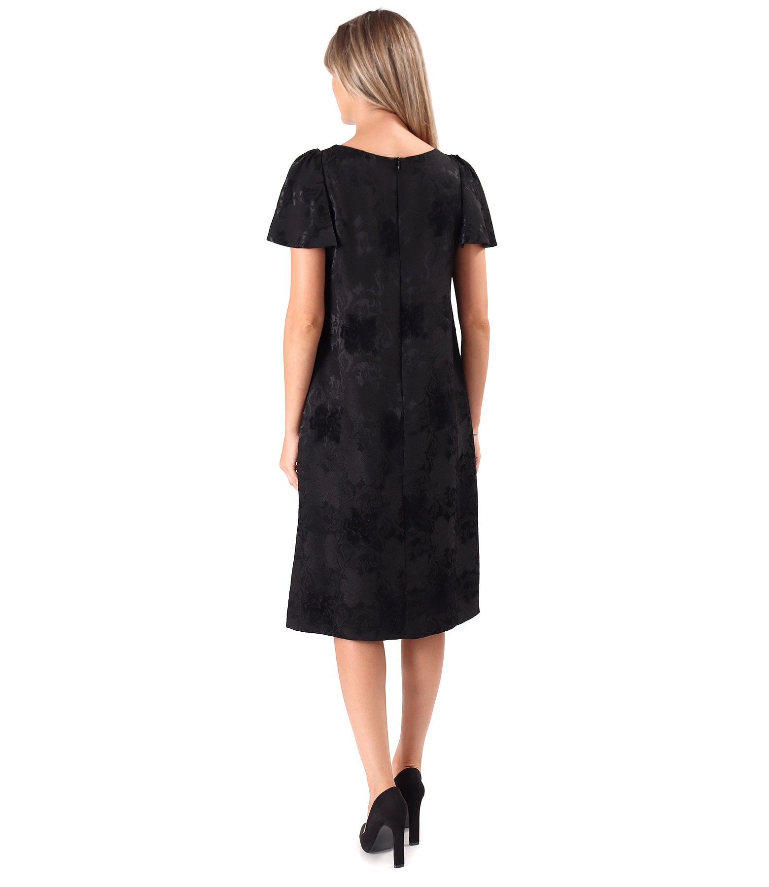 Elegant dress with short, wide sleeves lined with viscose, a round neckline, and a slit on the left side. It fastens with a concealed zipper at the center back.