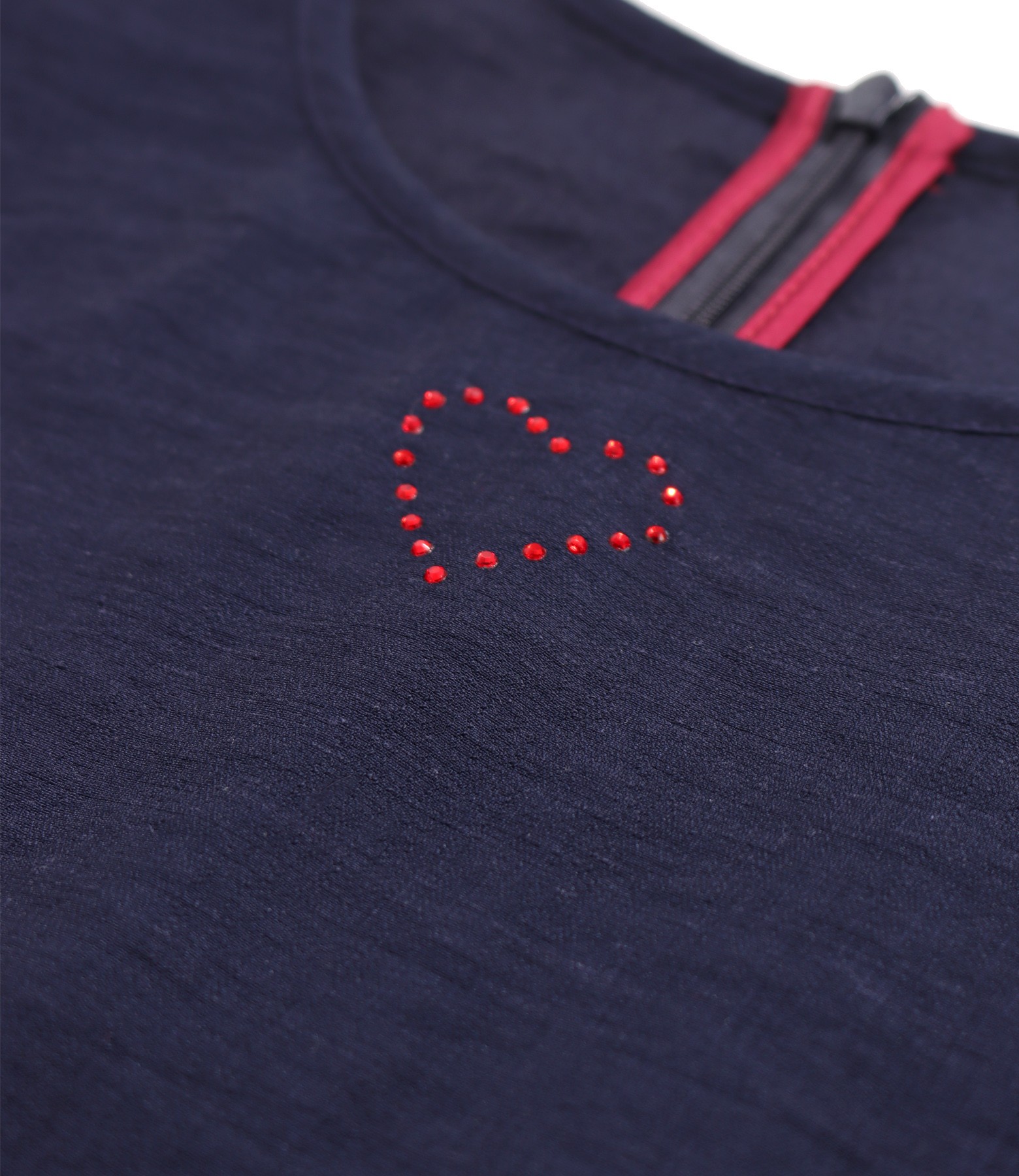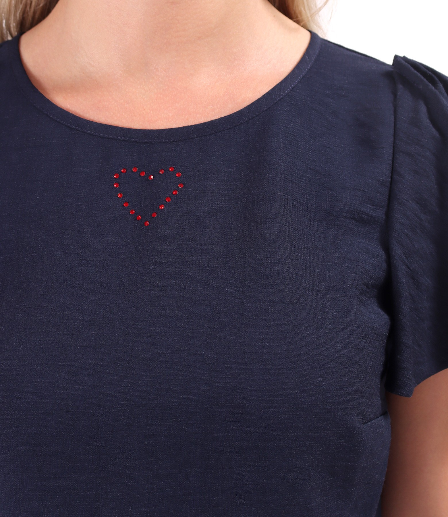 Elegant dress made of viscose with linen, with short, wide sleeves, round neckline with decorative heart. It closes with a hidden zipper at the center back.