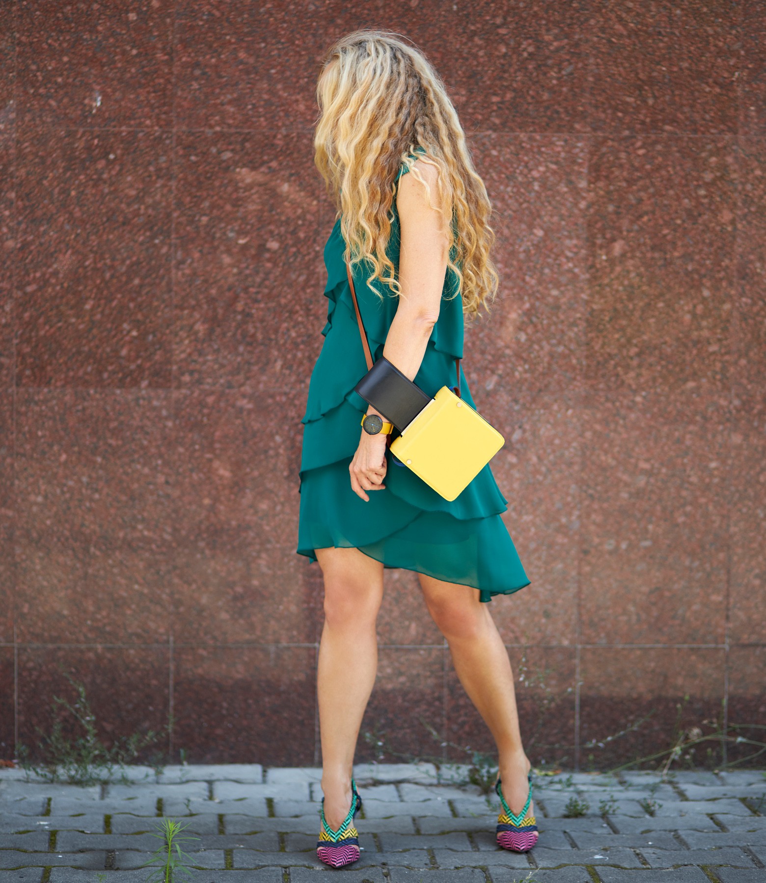 Elegant dress with veil flounces and pearls inserts (green), size