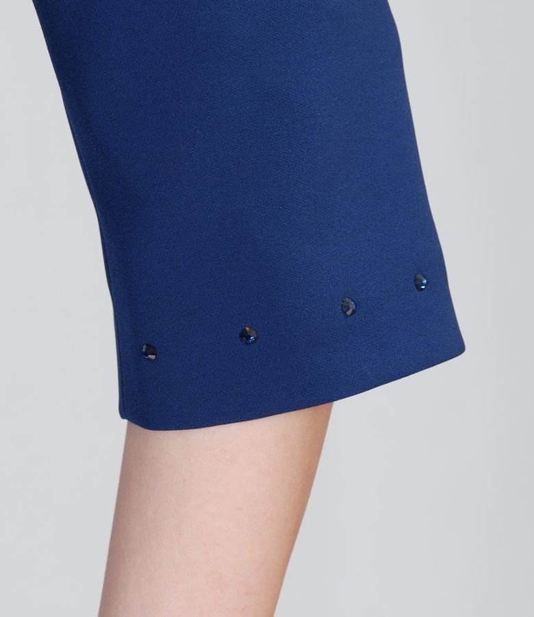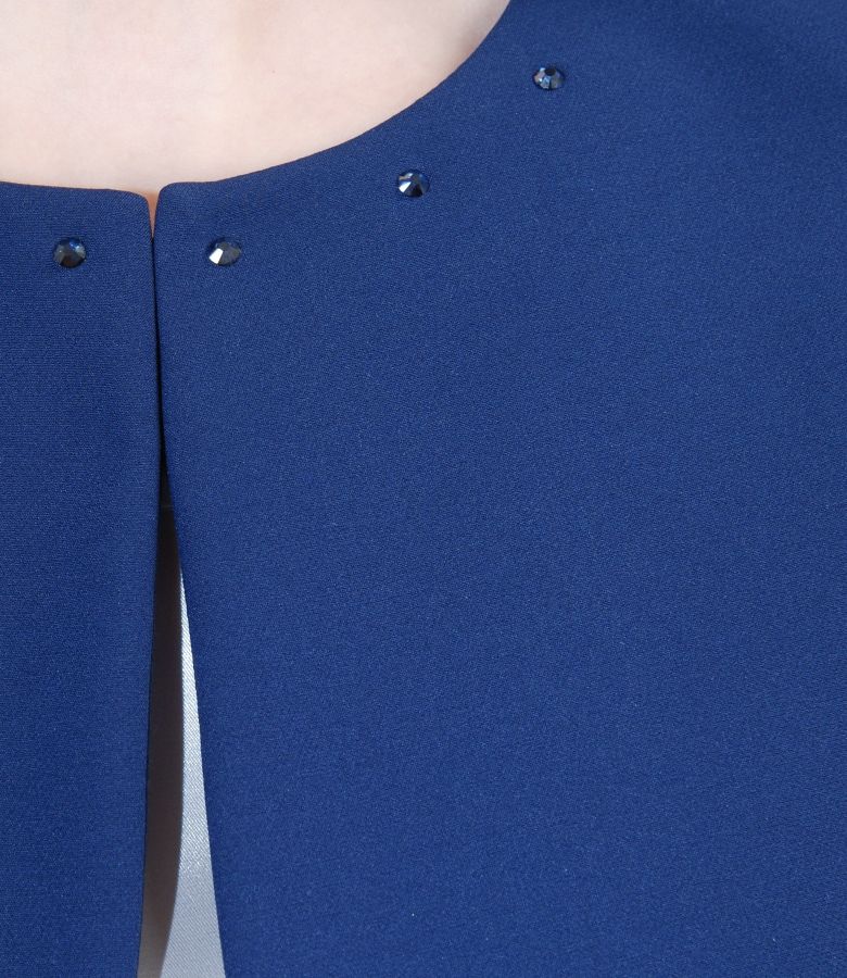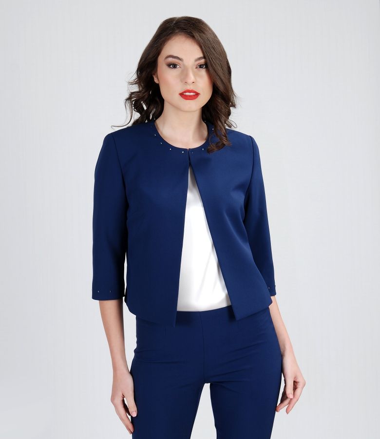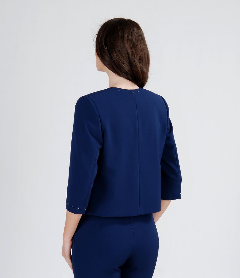 Elegant elastic fabric bolero with 3/4 sleeves. It has trim with crystals on neckline and sleeves edges. Closes with 2 hooks at the top.