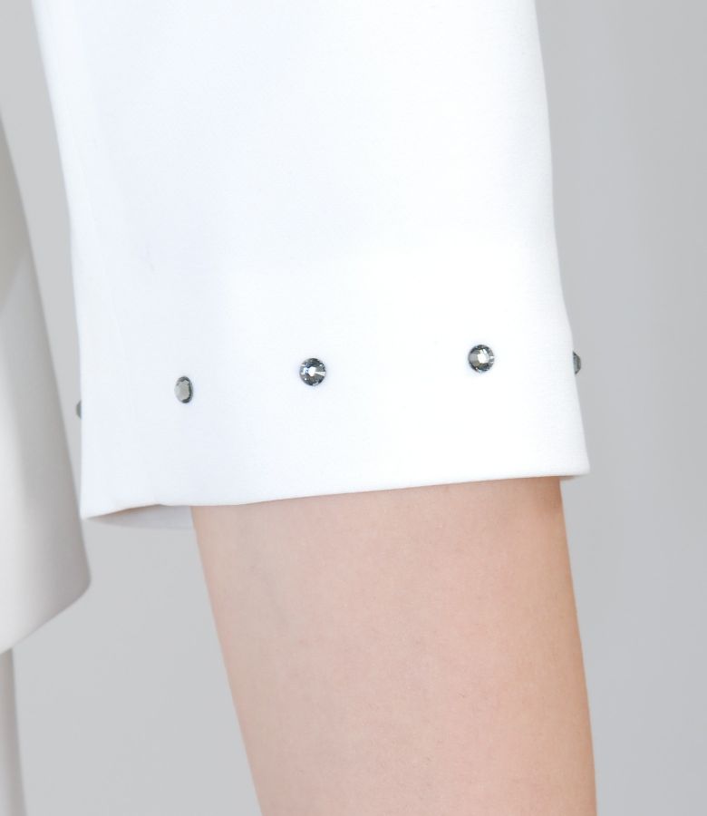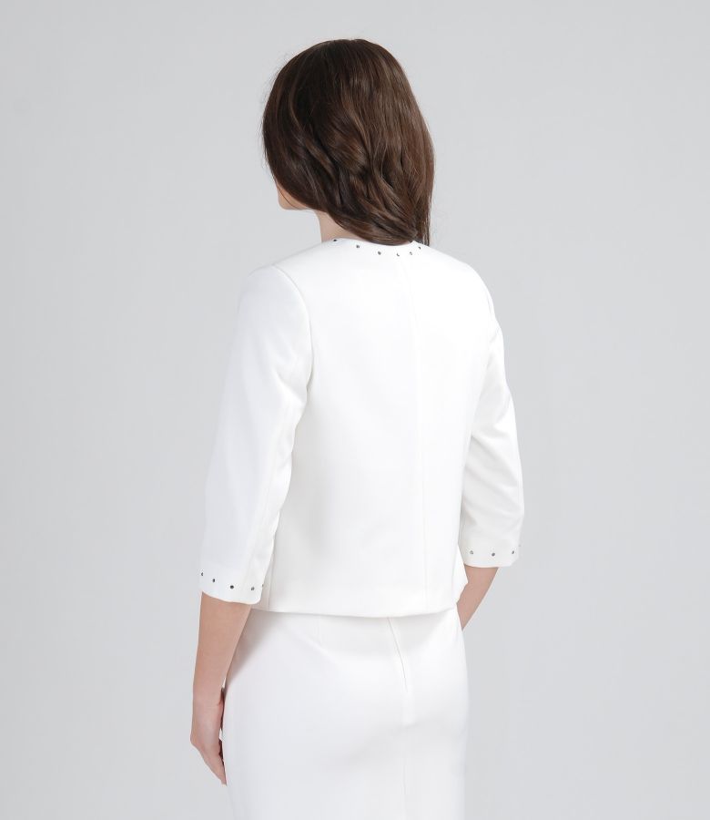 Elegant elastic fabric bolero with 3/4 sleeves. It has trim with crystals on neckline and sleeves edges. Closes with 2 hooks at the top.