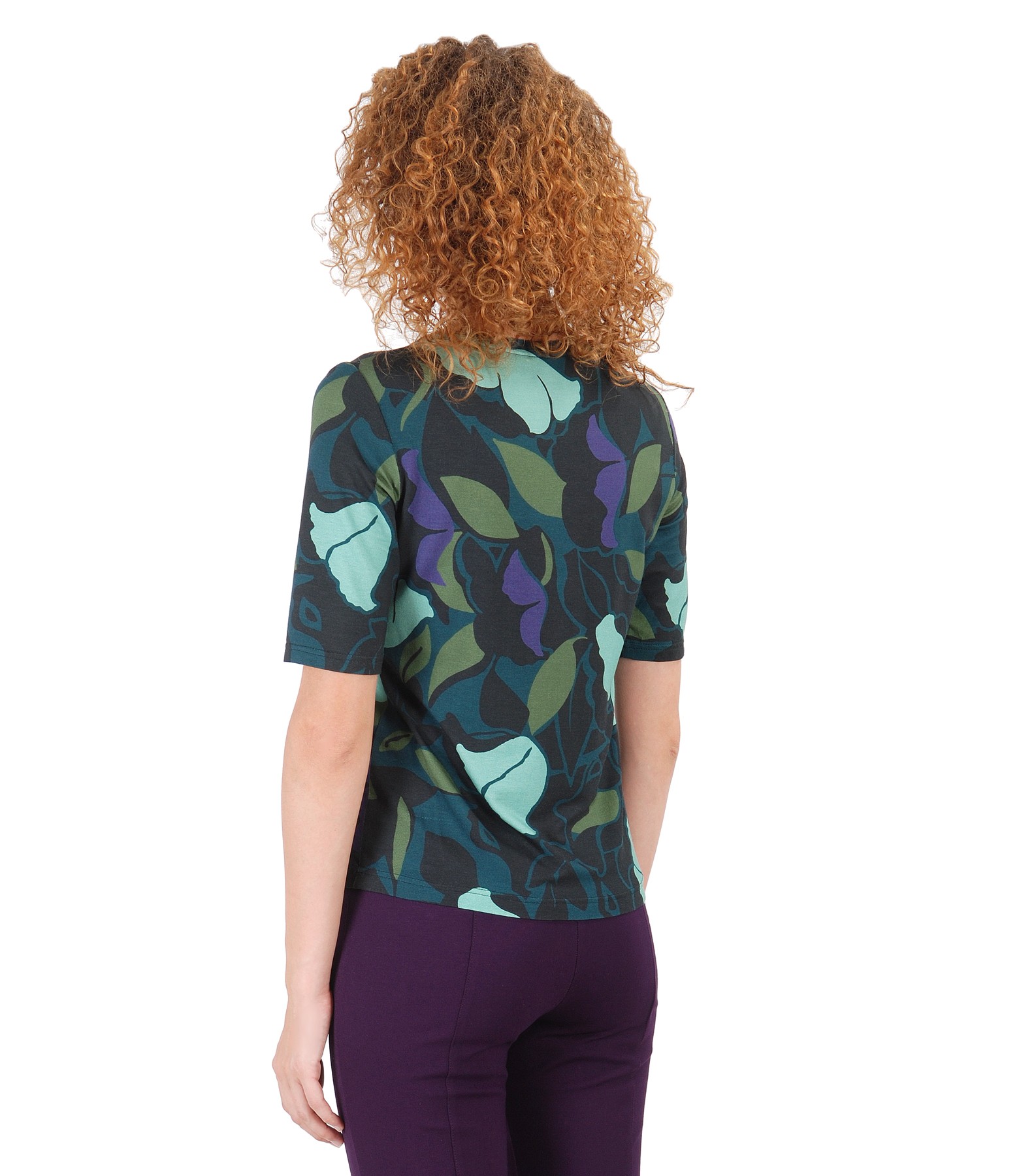 Elastic jersey t-shirt, printed with floral motifs, with sleeves and trim on round the low-cut neck.