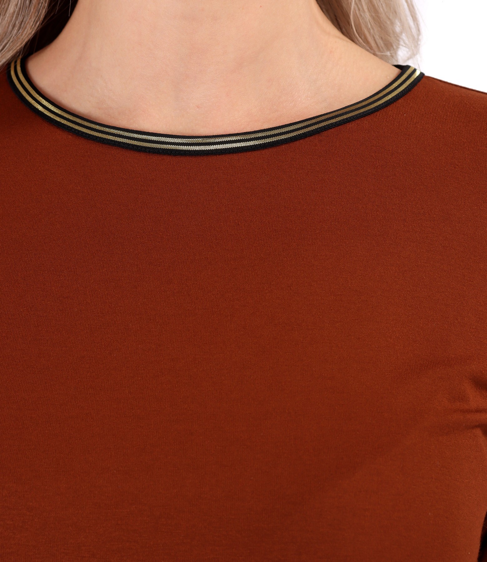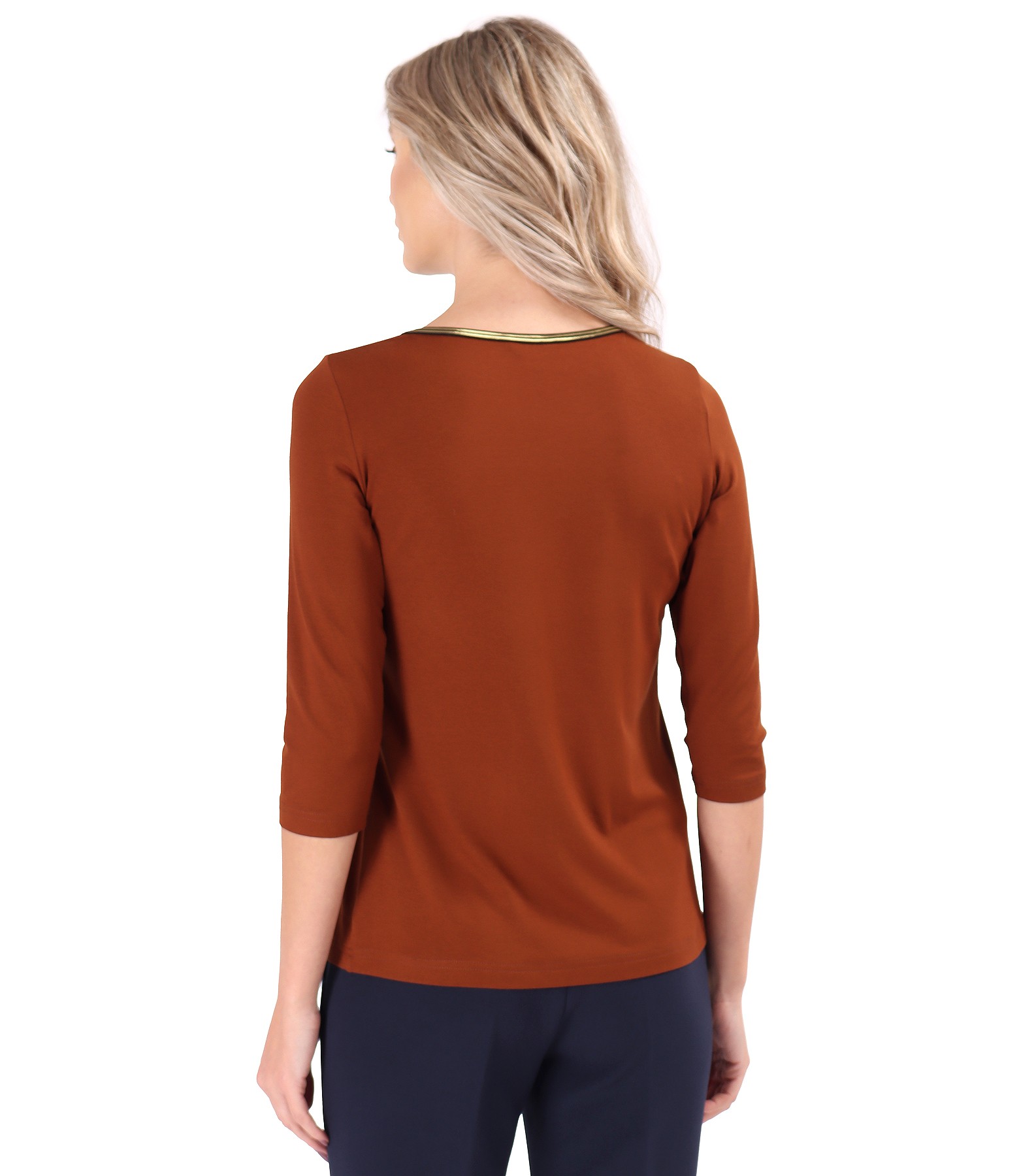 Elegant blouse made of elastic viscose jersey, with 3/4 sleeves and round neckline with golden elastic lining.