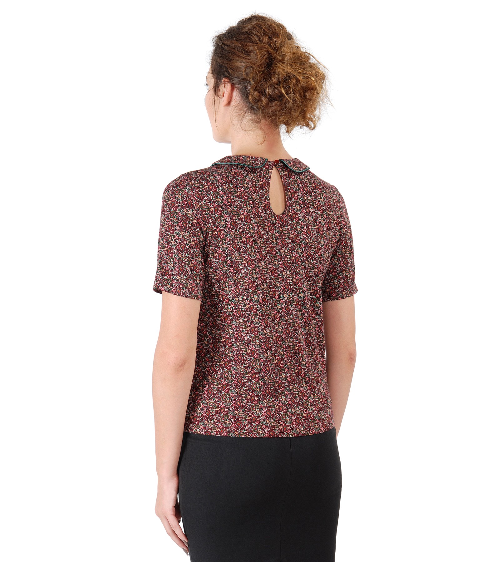 Elegant elastic jersey blouse with floral print, short sleeves and round collar with contrast trim. Closes with a button on the back.