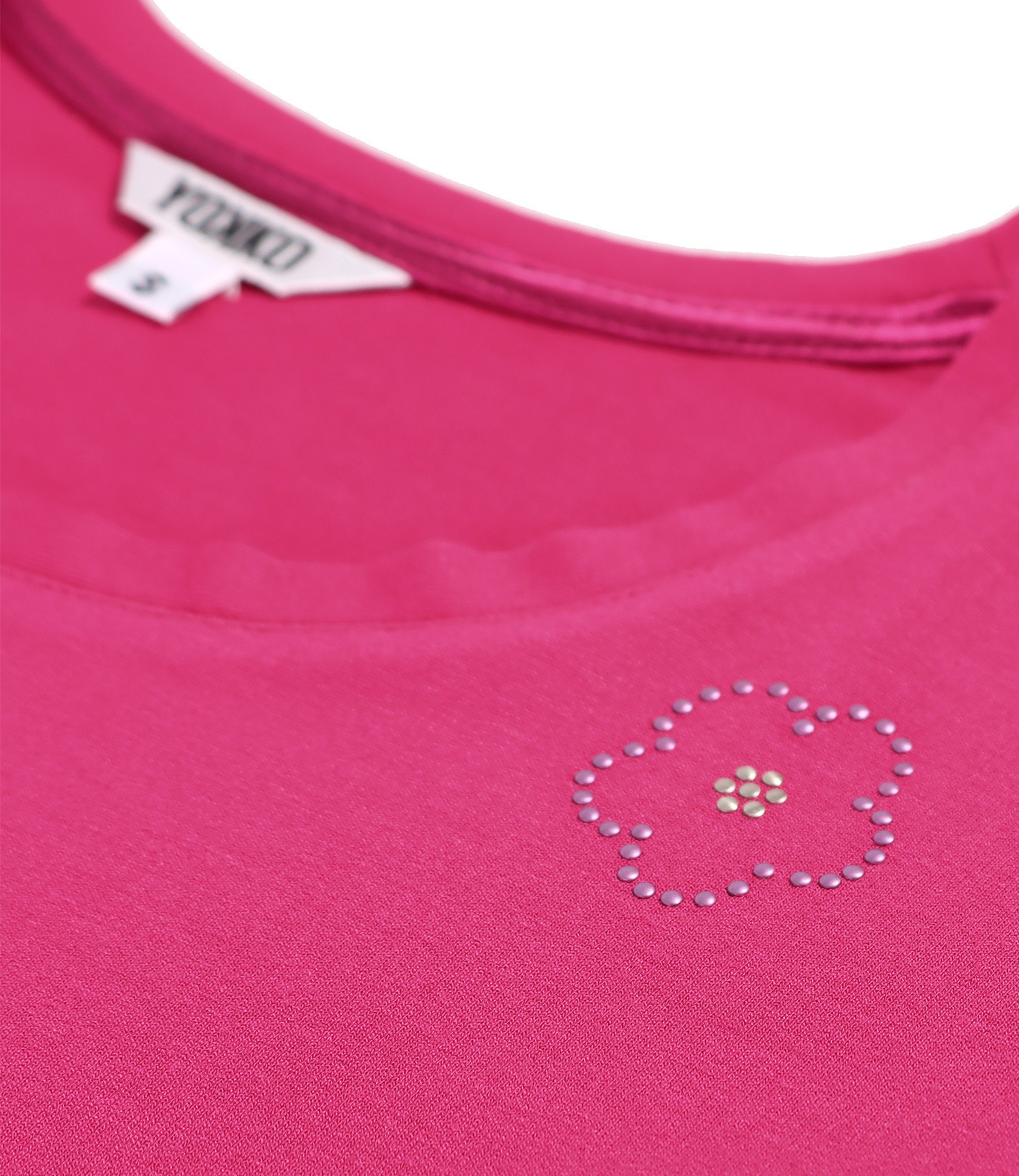 Elegant elastic jersey blouse with short wide sleeves, round neckline with decorative appliqué in the shape of a flower.