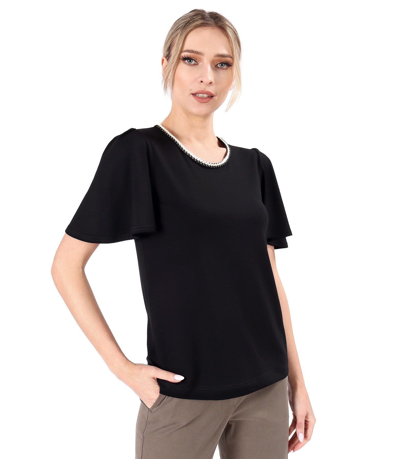 Elegant blouse made of elastic jersey, with a round neckline and short sleeves.