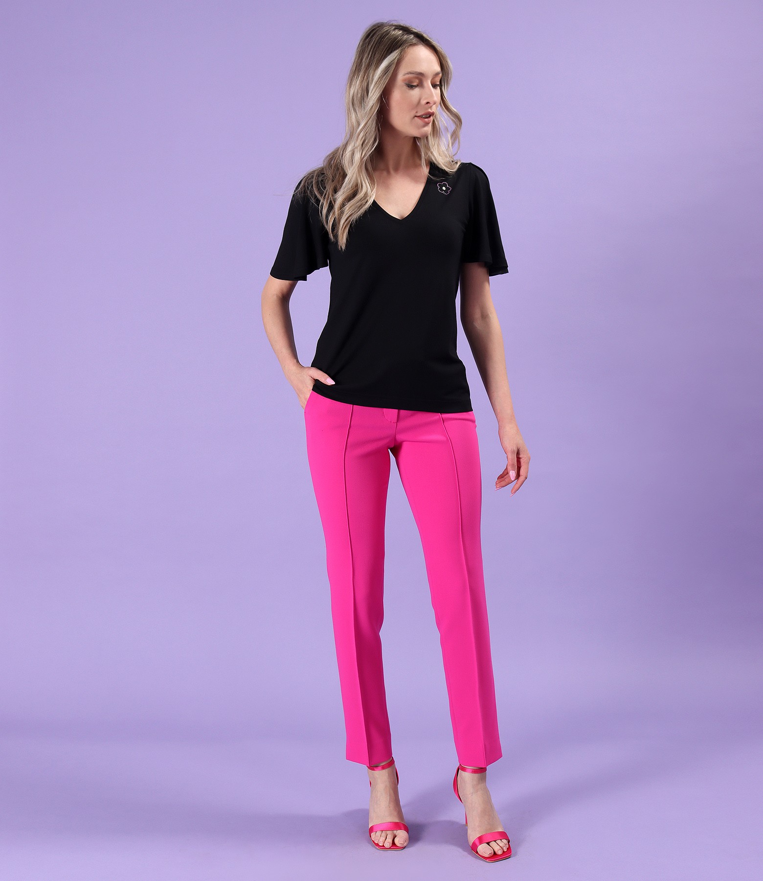 Elegant elastic jersey blouse with short wide sleeves, V neckline with decorative appliqué in the shape of a flower.