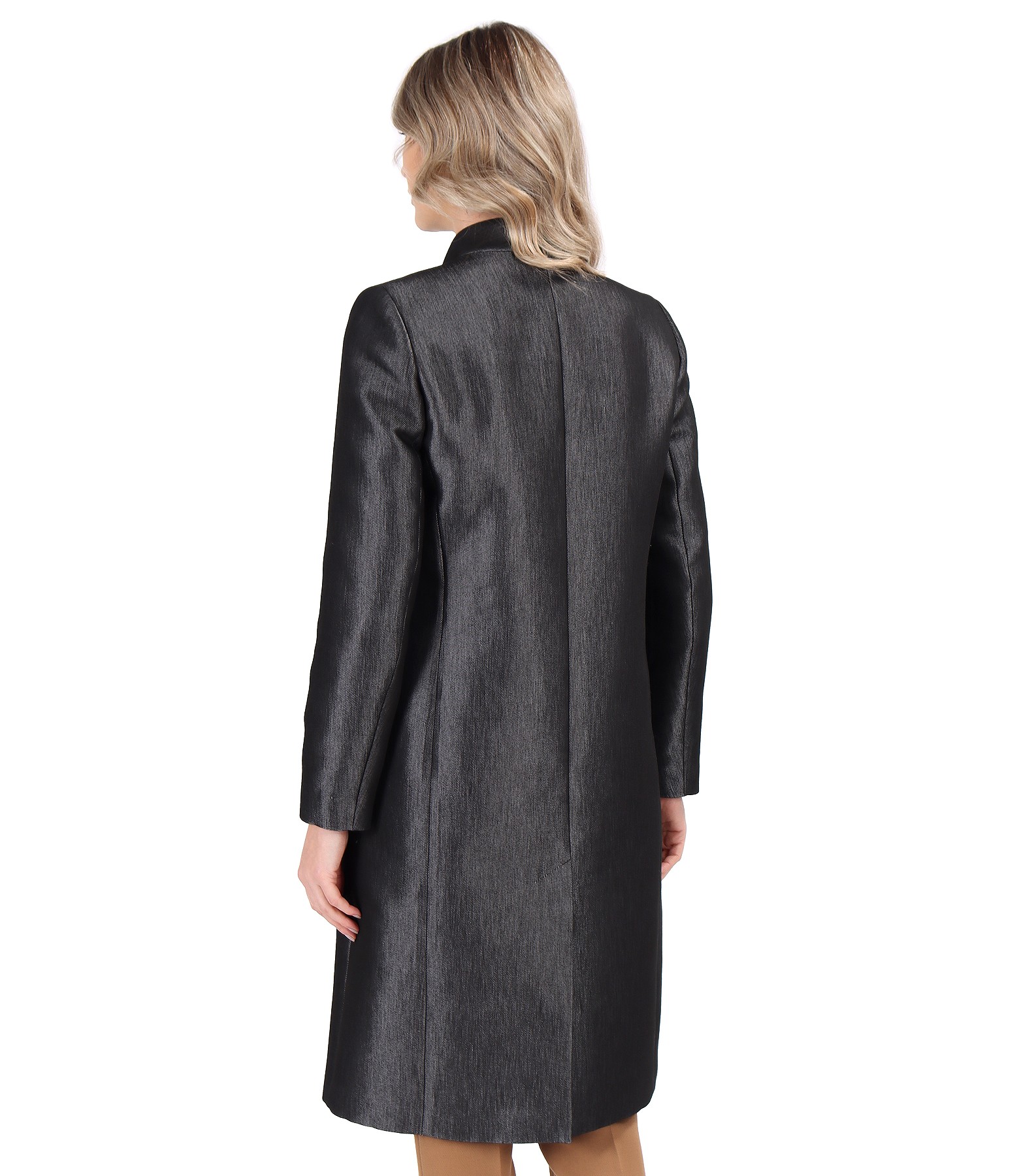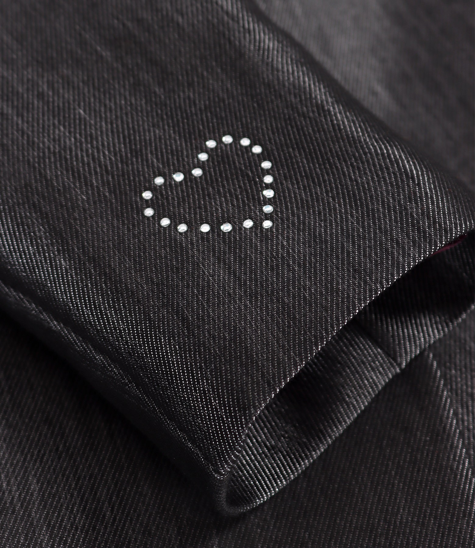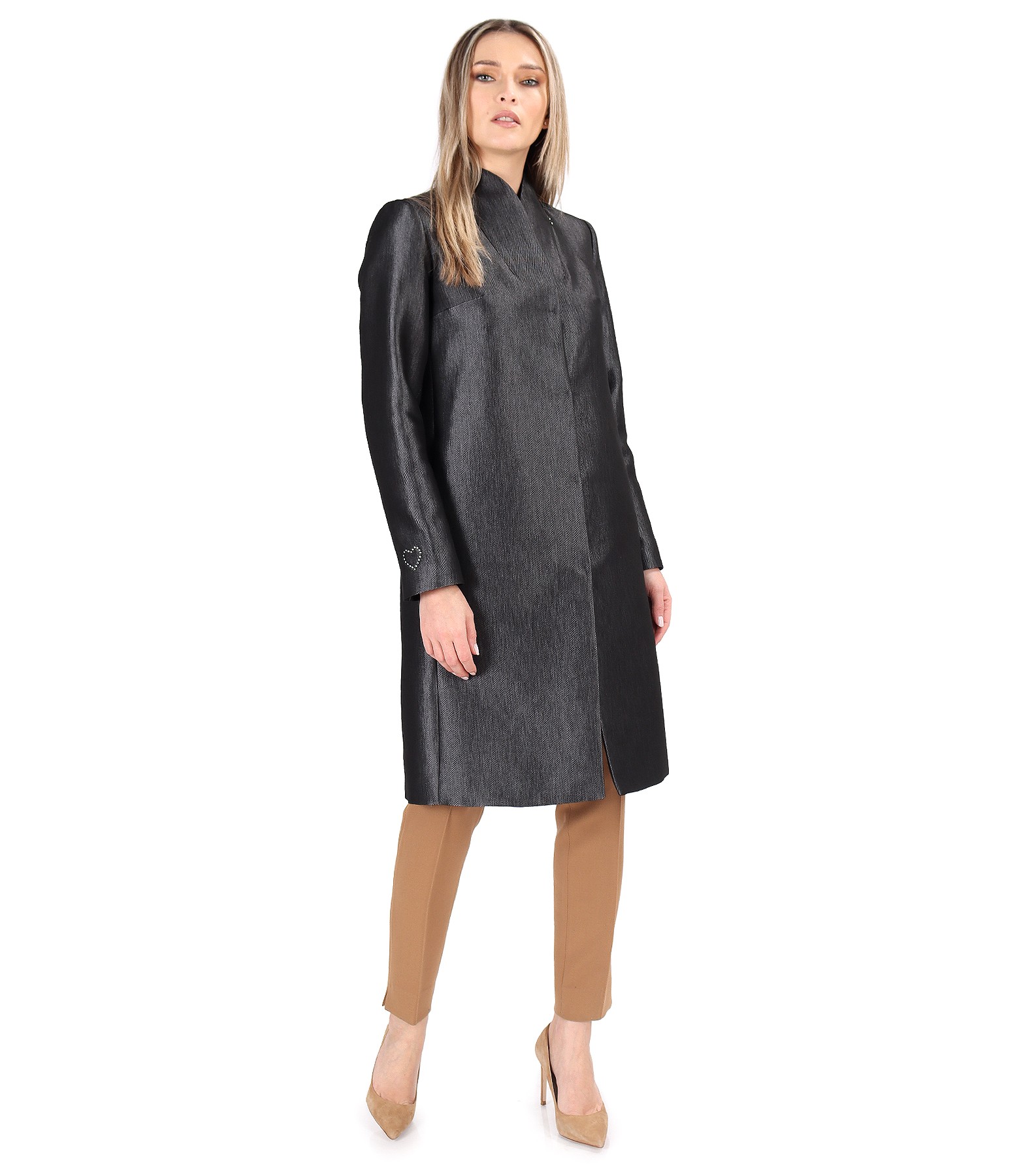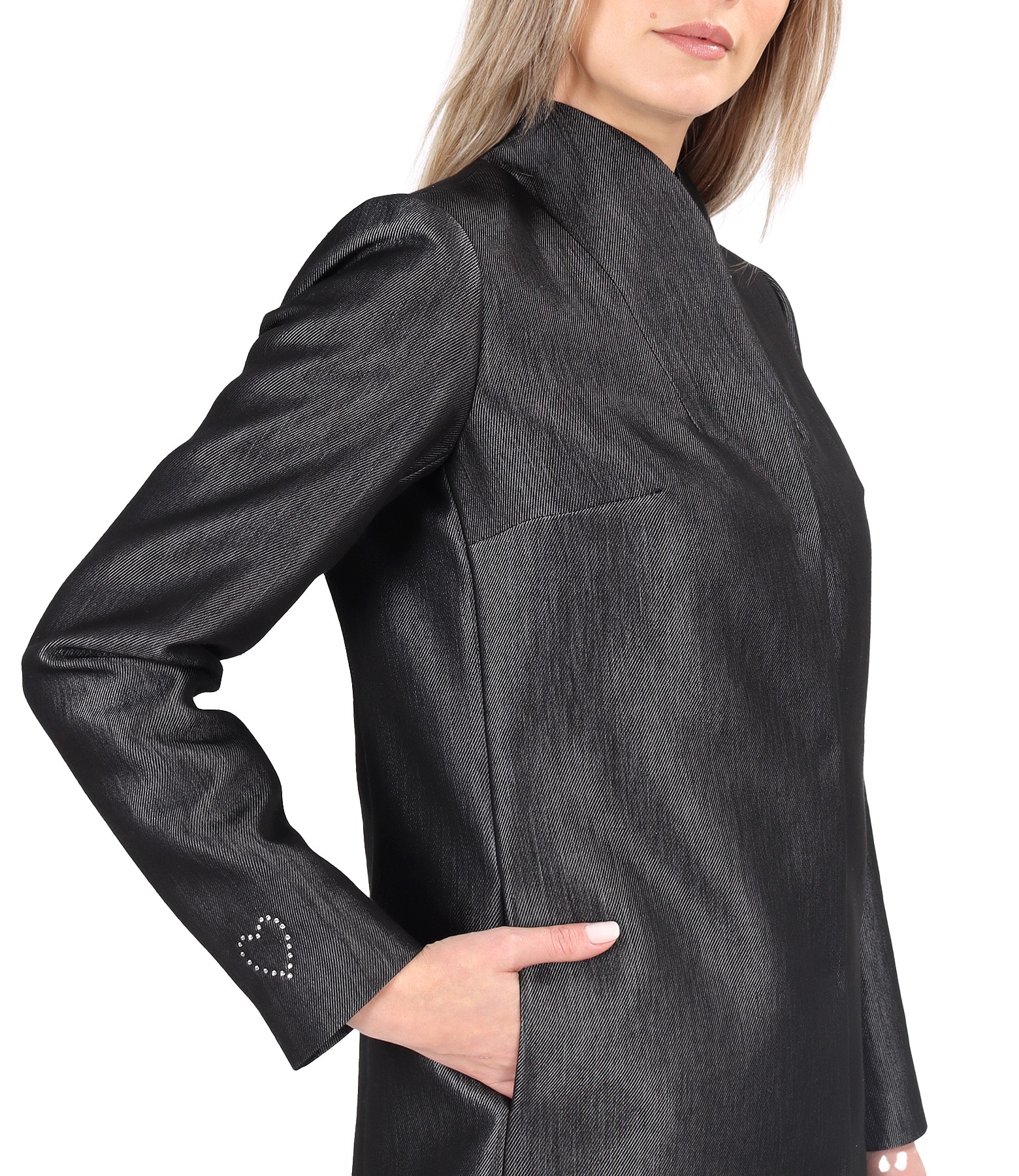 Elegant fabric coat with glossy effect, padded with contrasting acetate. It has a heart-shaped crystal application on the sleeve, a tunic-like collar, side pockets, and a slit on the back. Closes on the face with 4 metal staples.