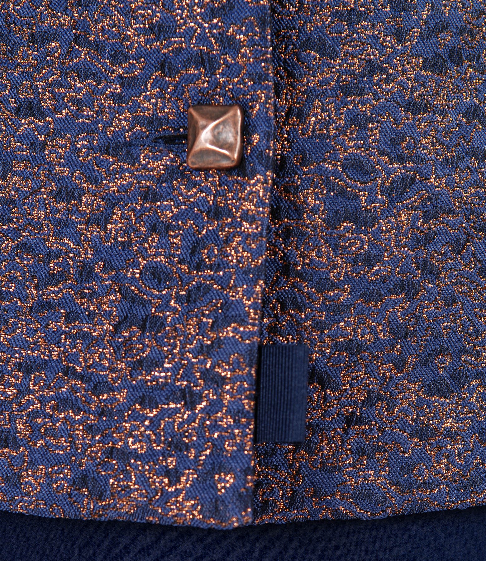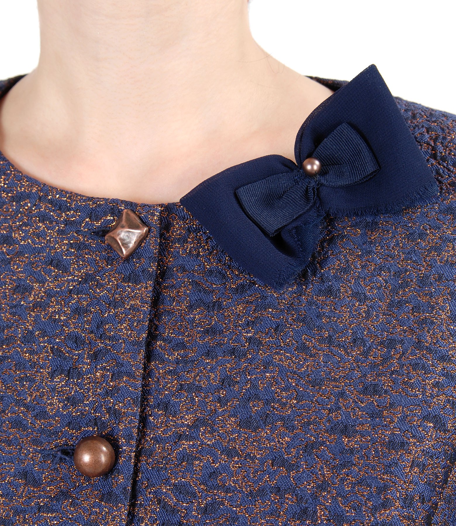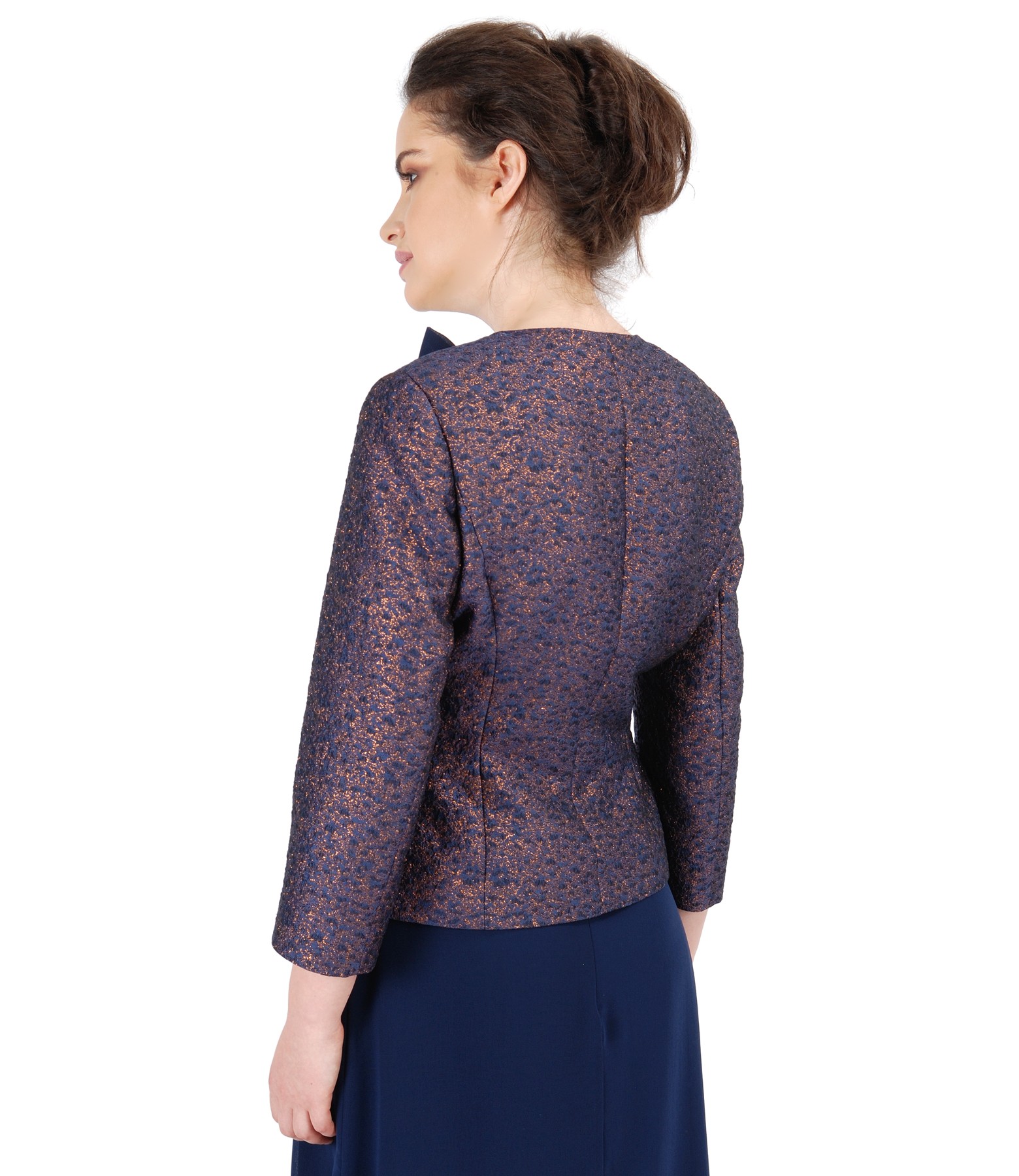 Elegant fabric jacket, brocade with wire, without collar and lapels, 3/4 sleeves and detachable veil bow. Closes with 5 metallic buttons.
