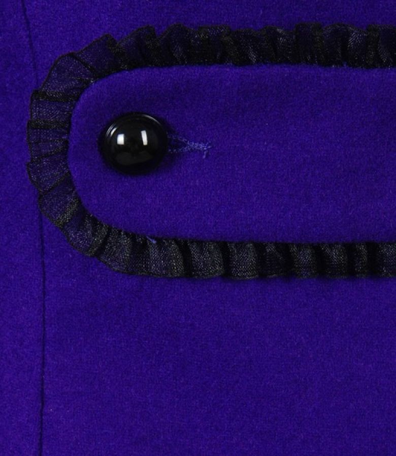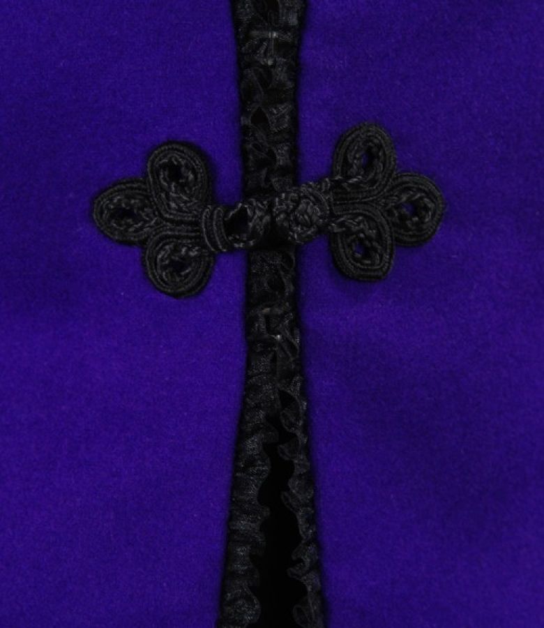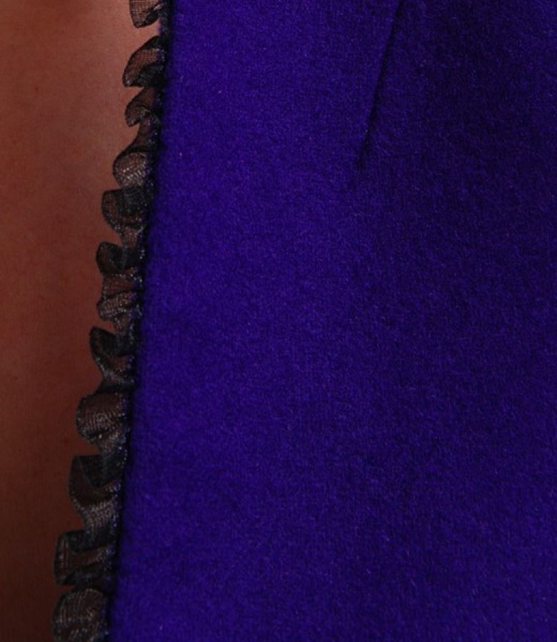 Elegant jacket in virgin wool with cashmere with deep neck-cut, without collar. Black lace garnish on edge and at sleeves end. Cord fixed to the middle back. Closes with one decorative clasp an 2 hooks on the front.