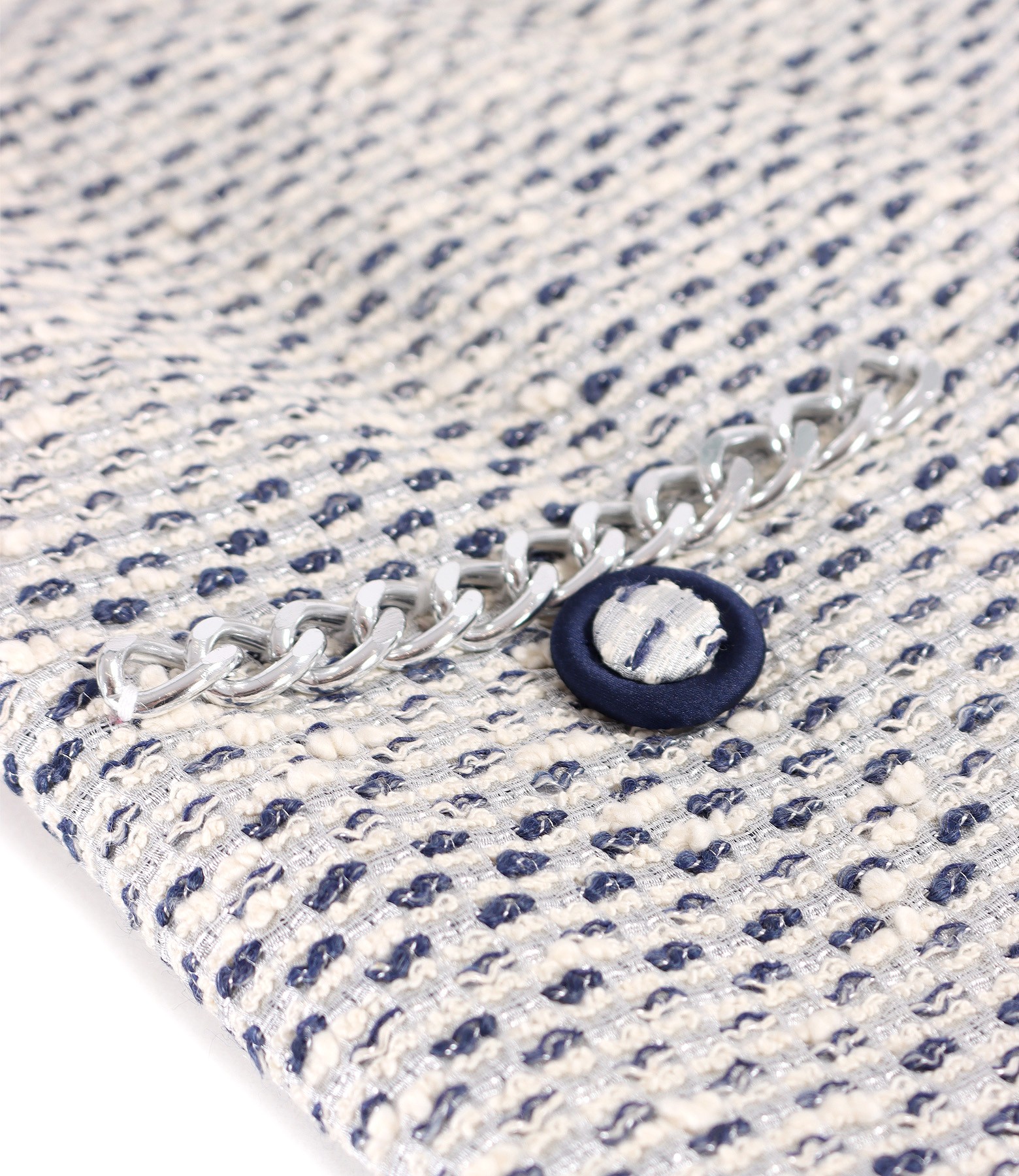 Elegant jacket made of cotton curls with silver metallic thread, with 3/4 sleeves with overlapping cuffs, and with a decorative silver chain at the waist. It closes with 4 buttons on the middle front.