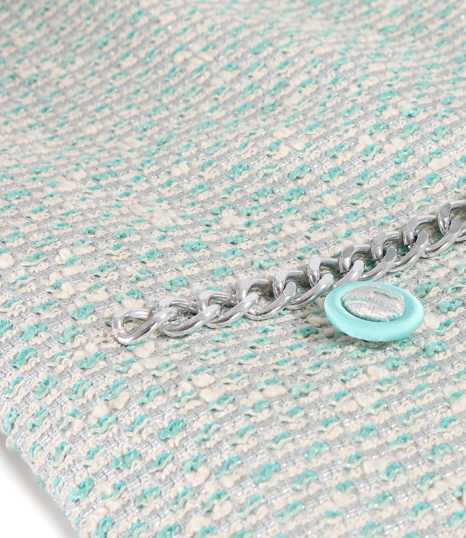 Elegant jacket made of cotton curls with silver metallic thread, with 3/4 sleeves with overlapping cuffs, and with a decorative silver chain at the waist. It closes with 4 buttons on the middle front.