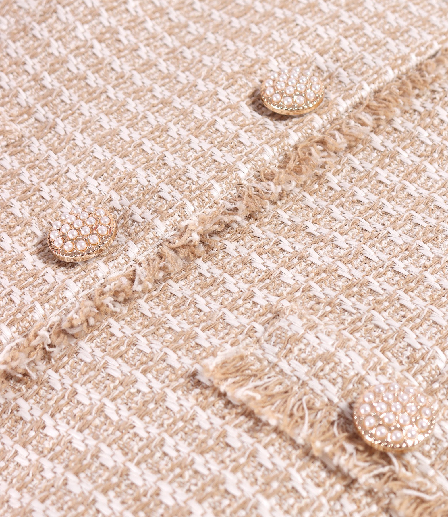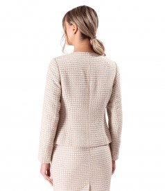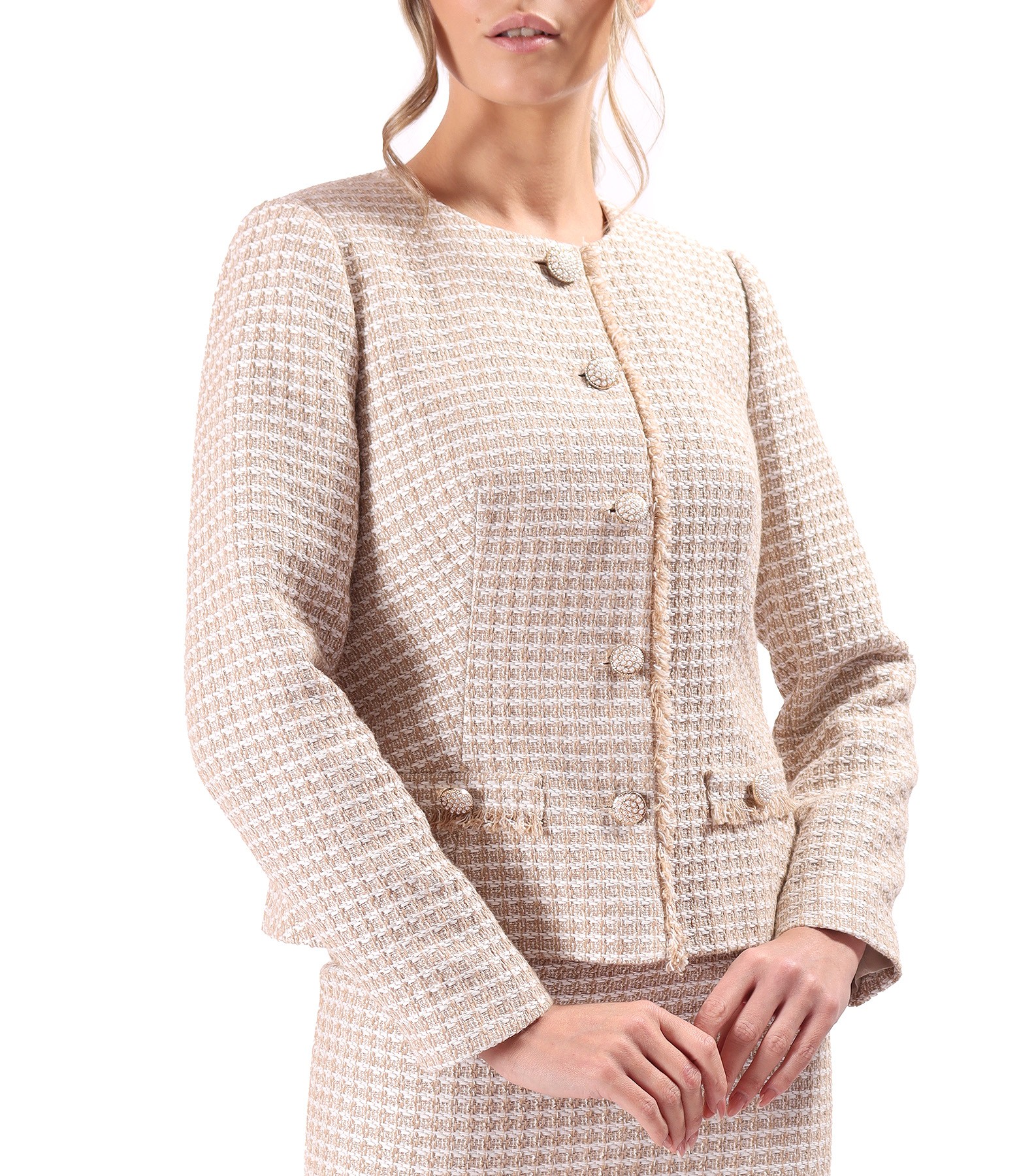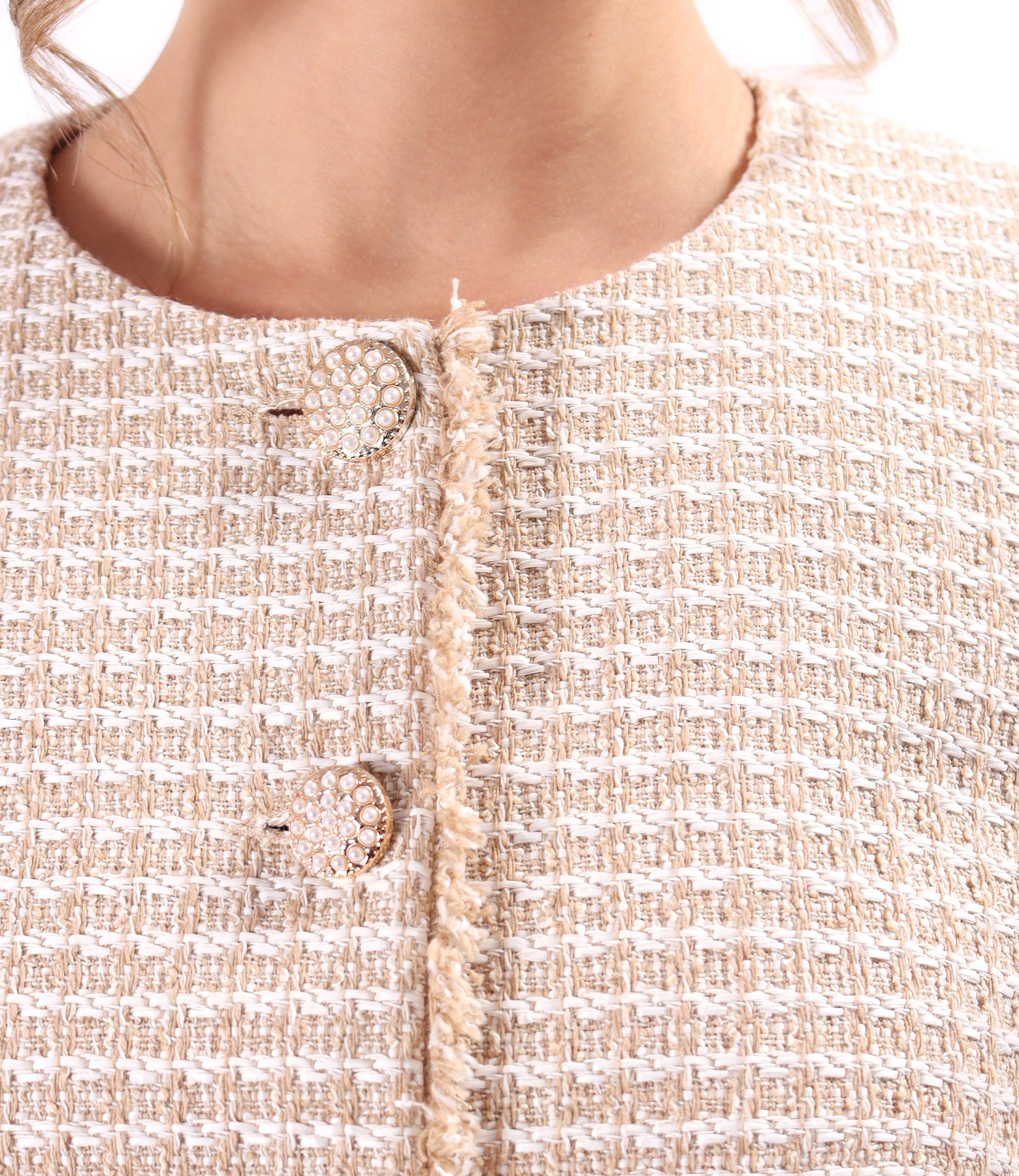 Elegant jacket made of cotton, collarless, lined, with neckline, fringed down the center front and decorative flaps with buttons and fringes. Closes with 5 buttons at front.