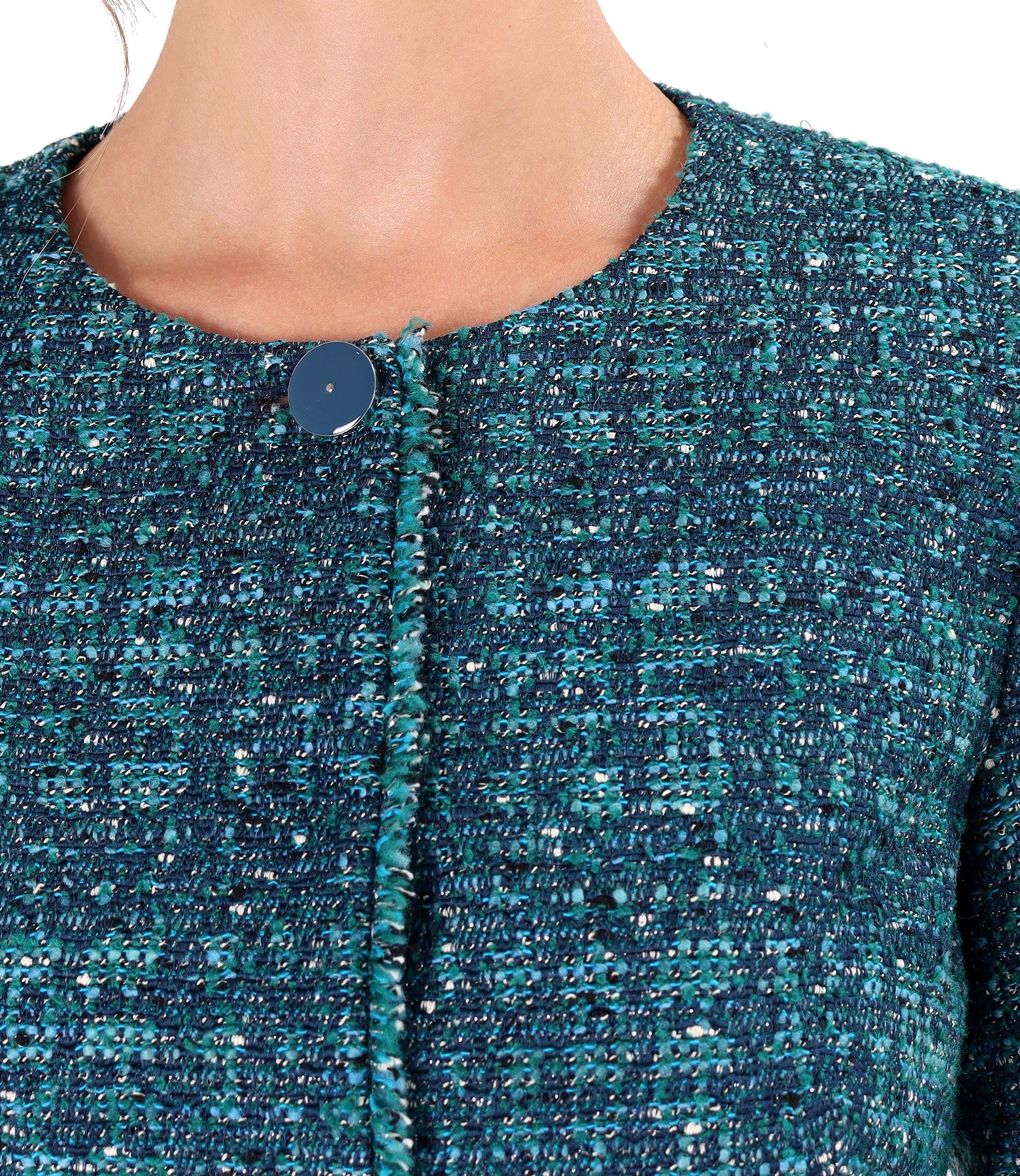 Elegant jacket made of curls with wool and lurex thread, without collar, padded, with a neckline near the neck with a decorative button, and with fringes in the middle of the front. It closes with 5 staples on the face.