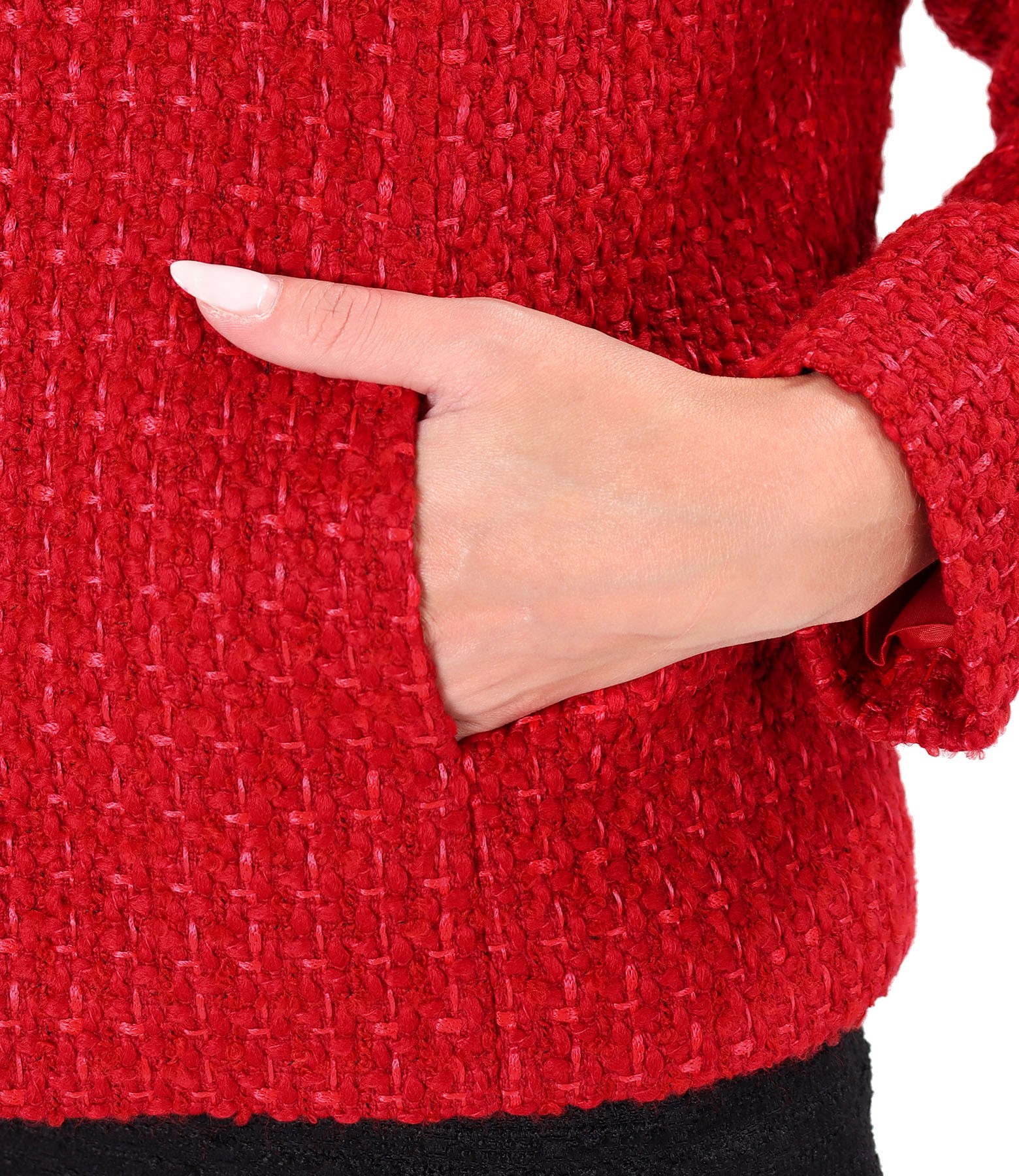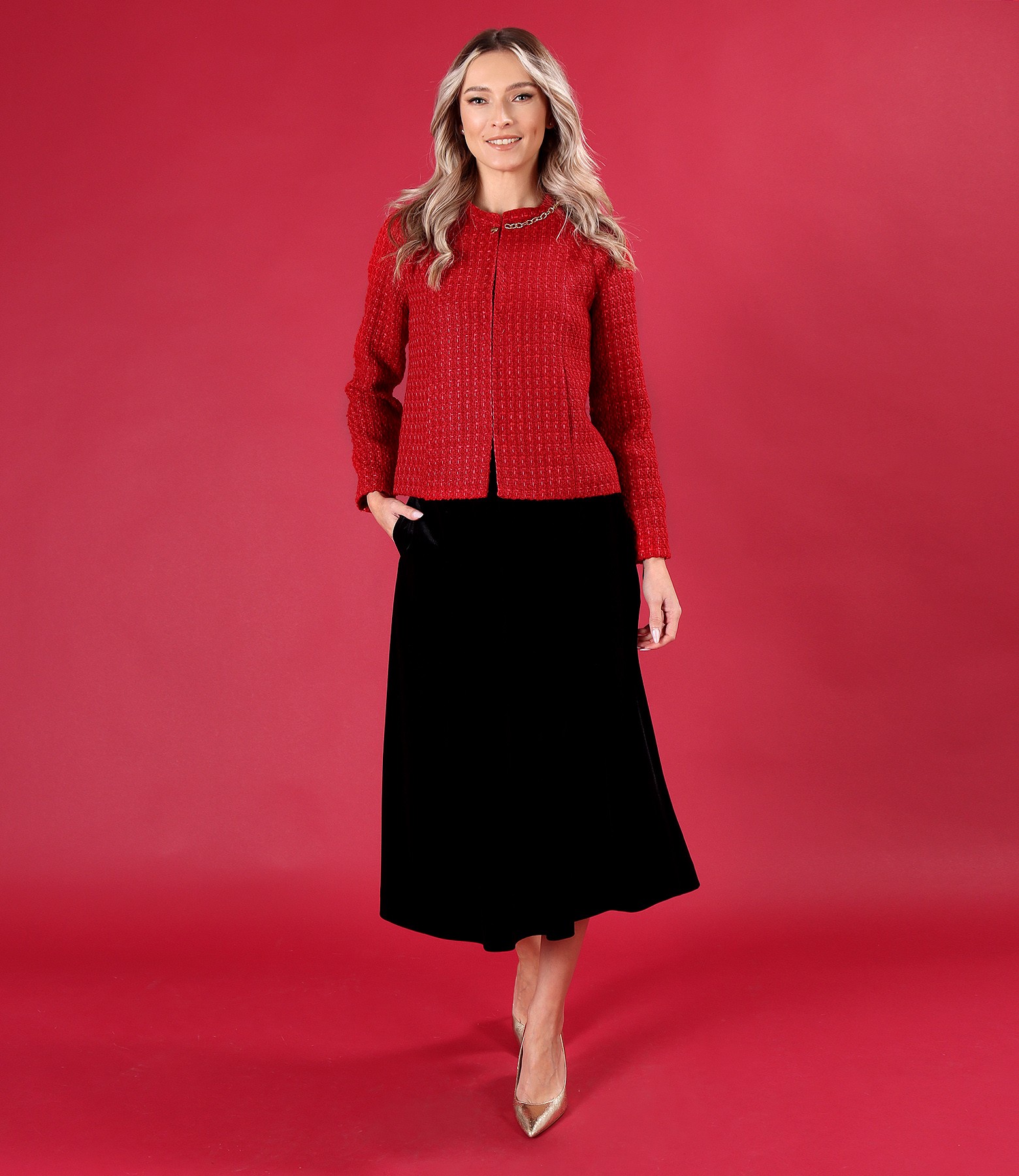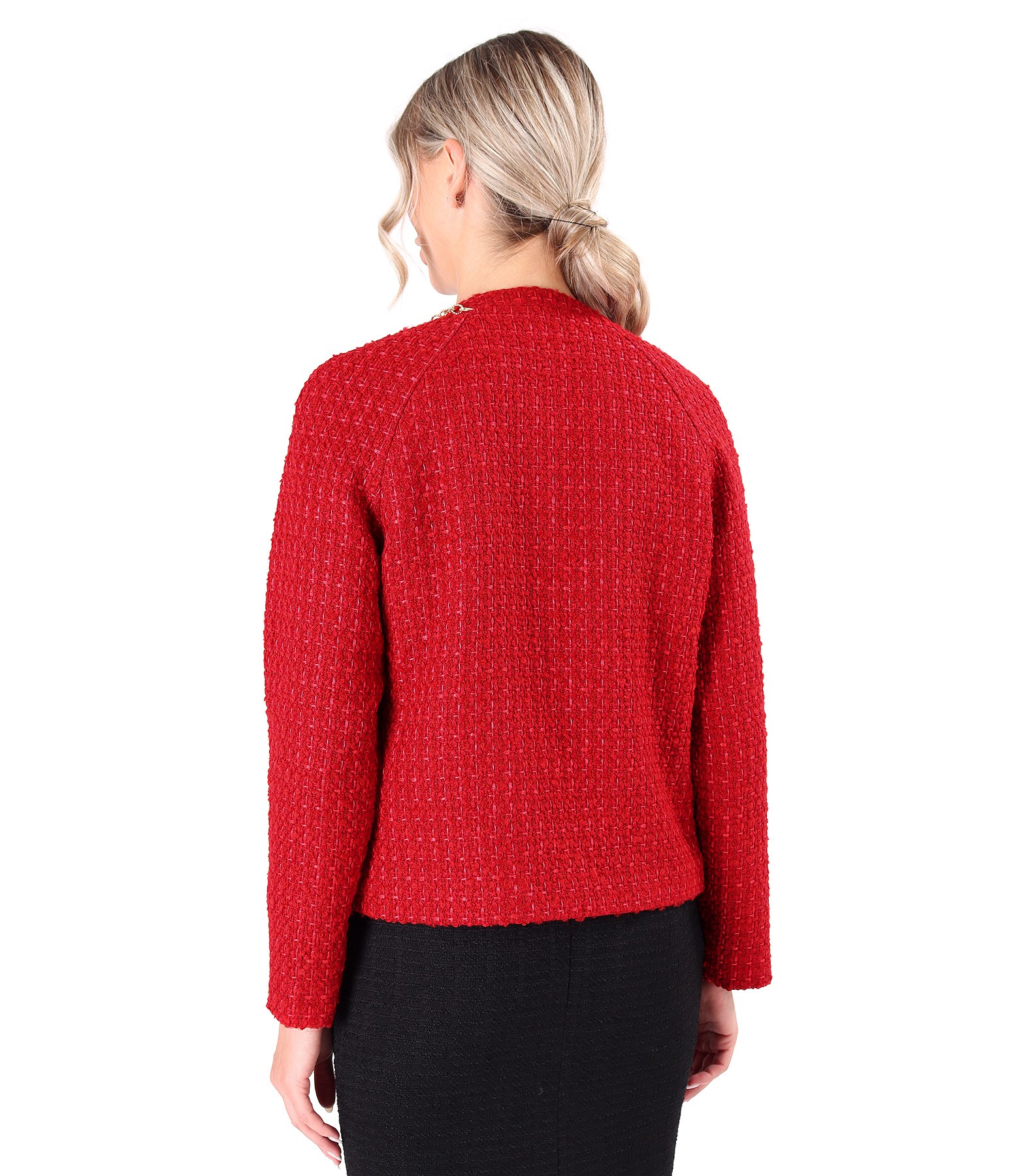Elegant jacket made of loops with wool and viscose, with hidden vertical pockets and a collar with a decorative golden chain. It closes on the front with 5 pairs of staples.