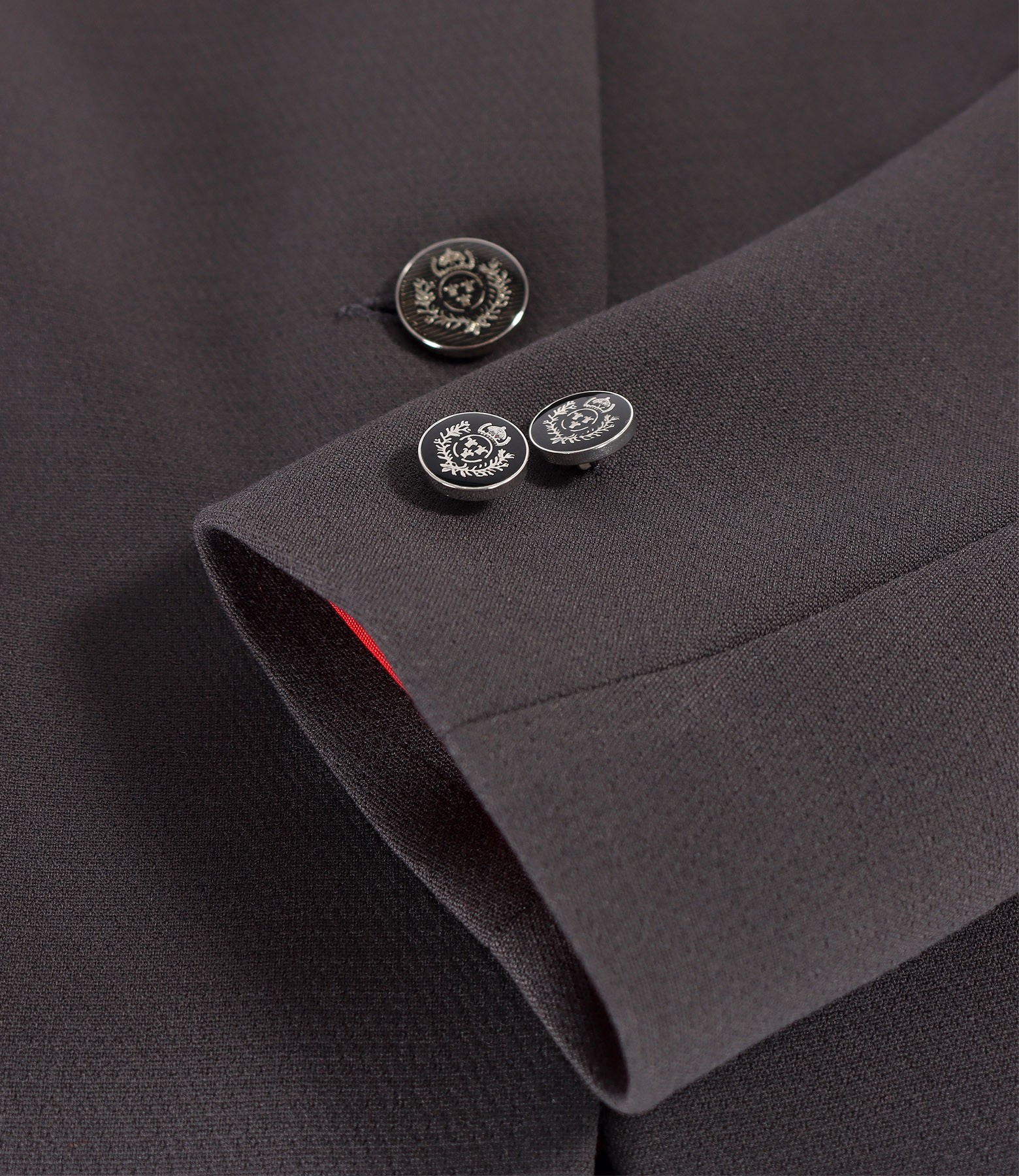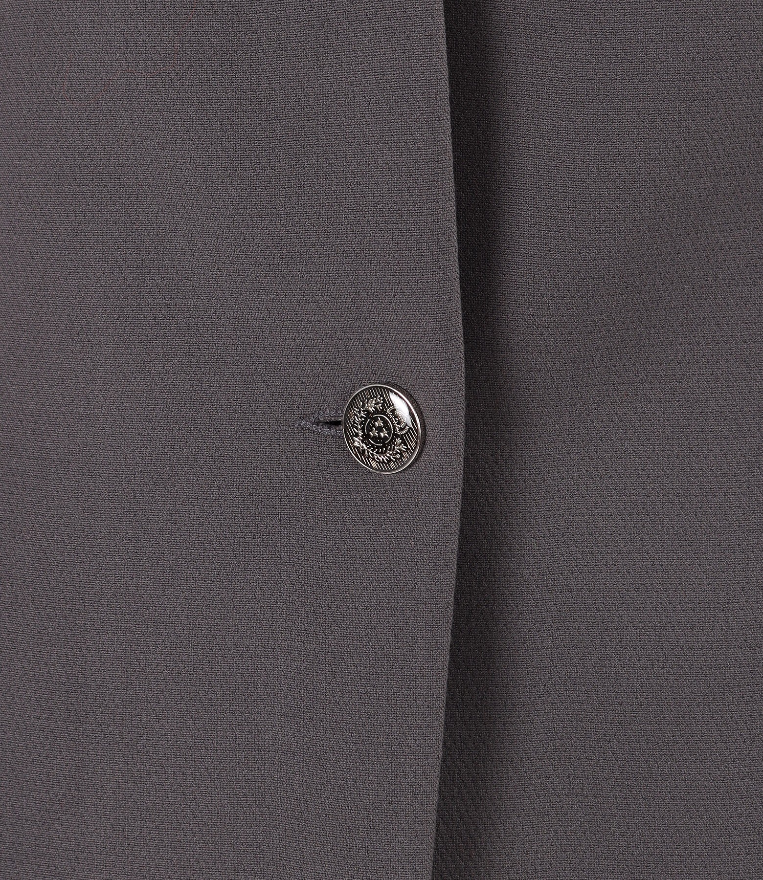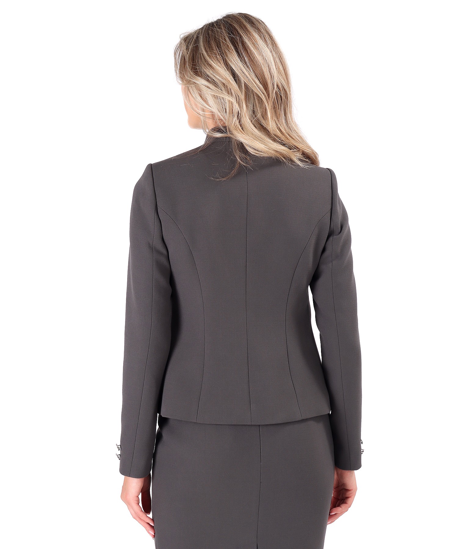 Elegant jacket made of elastic fabric, padded, with tunic collar and deep neckline. Closes with a button on the face.
