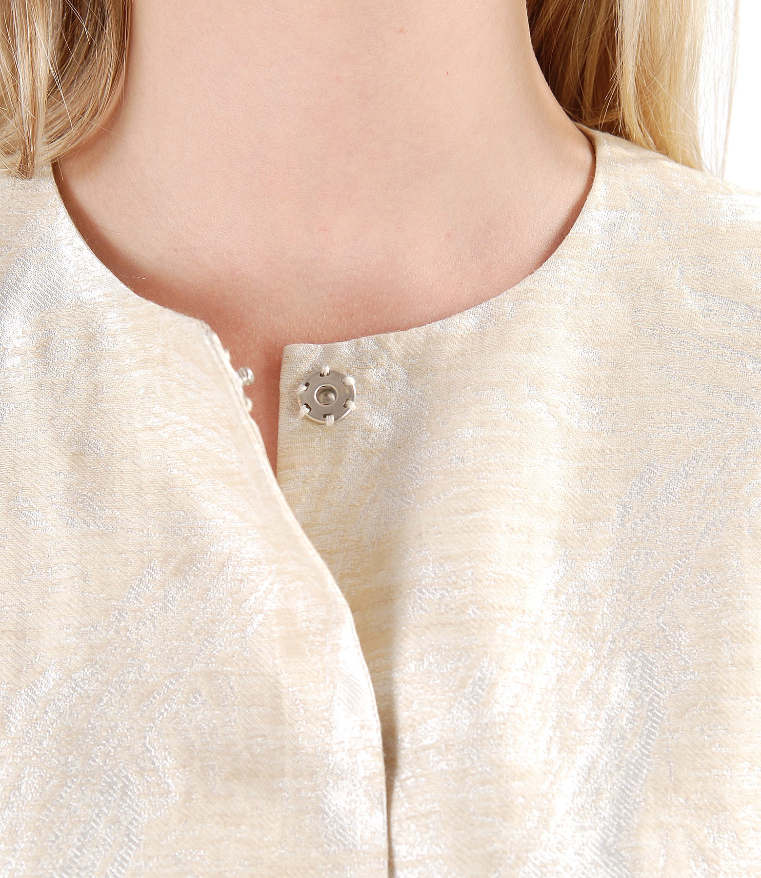 Elegant jacket made of fabric embroidered with flax, without collar and flaps, 3/4 sleeves. Closes with 5 front staples.