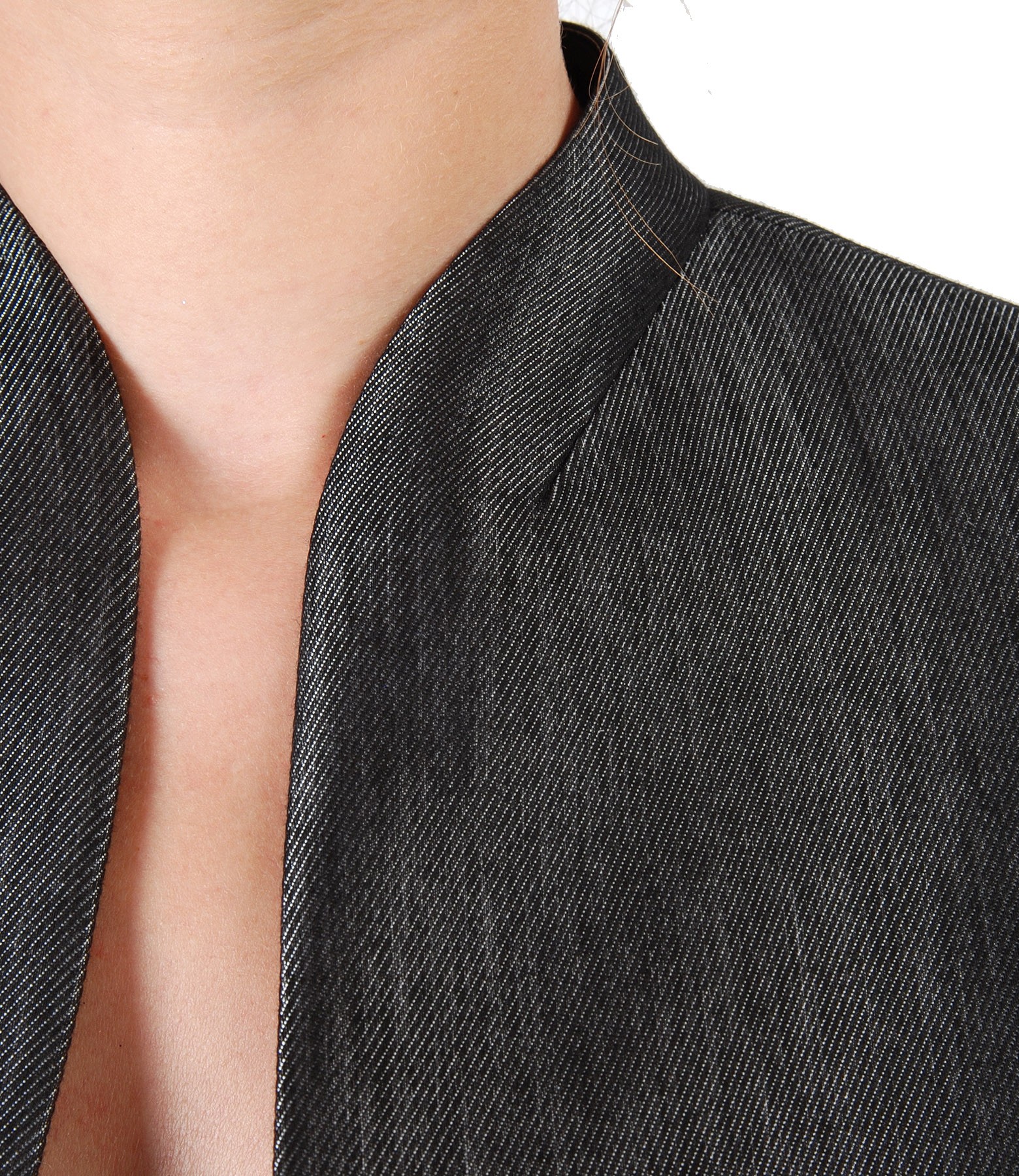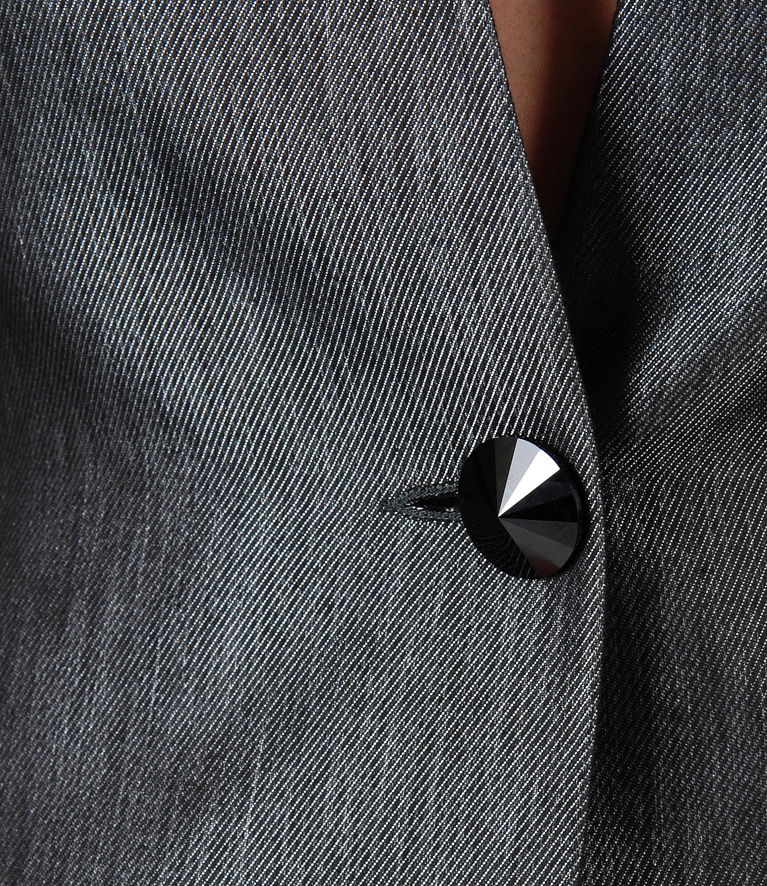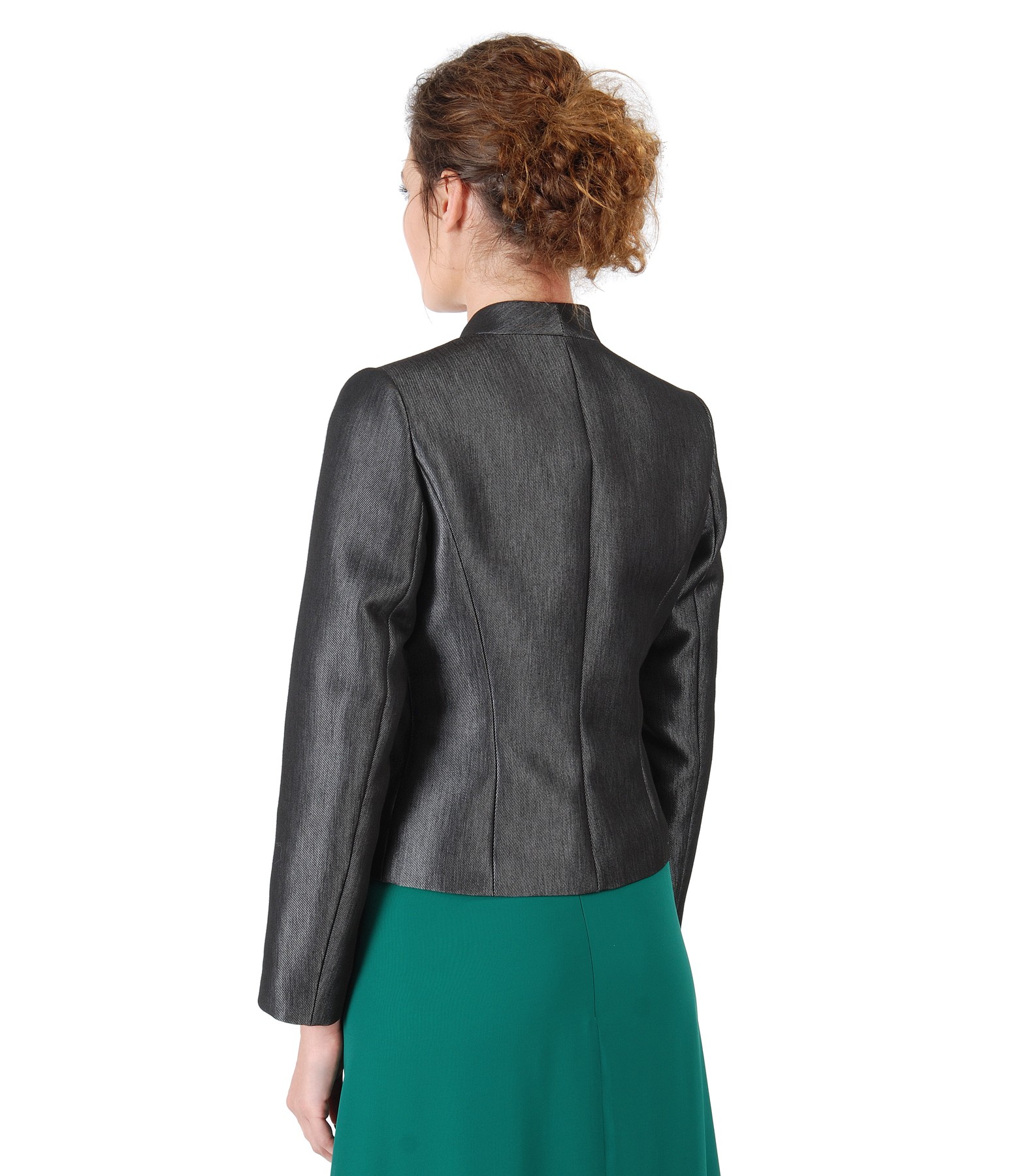 Elegant jacket made of fabric with glossy effect, padded, tunic collar and deep low-cut neck. Closes with a crystal button on the middle front.