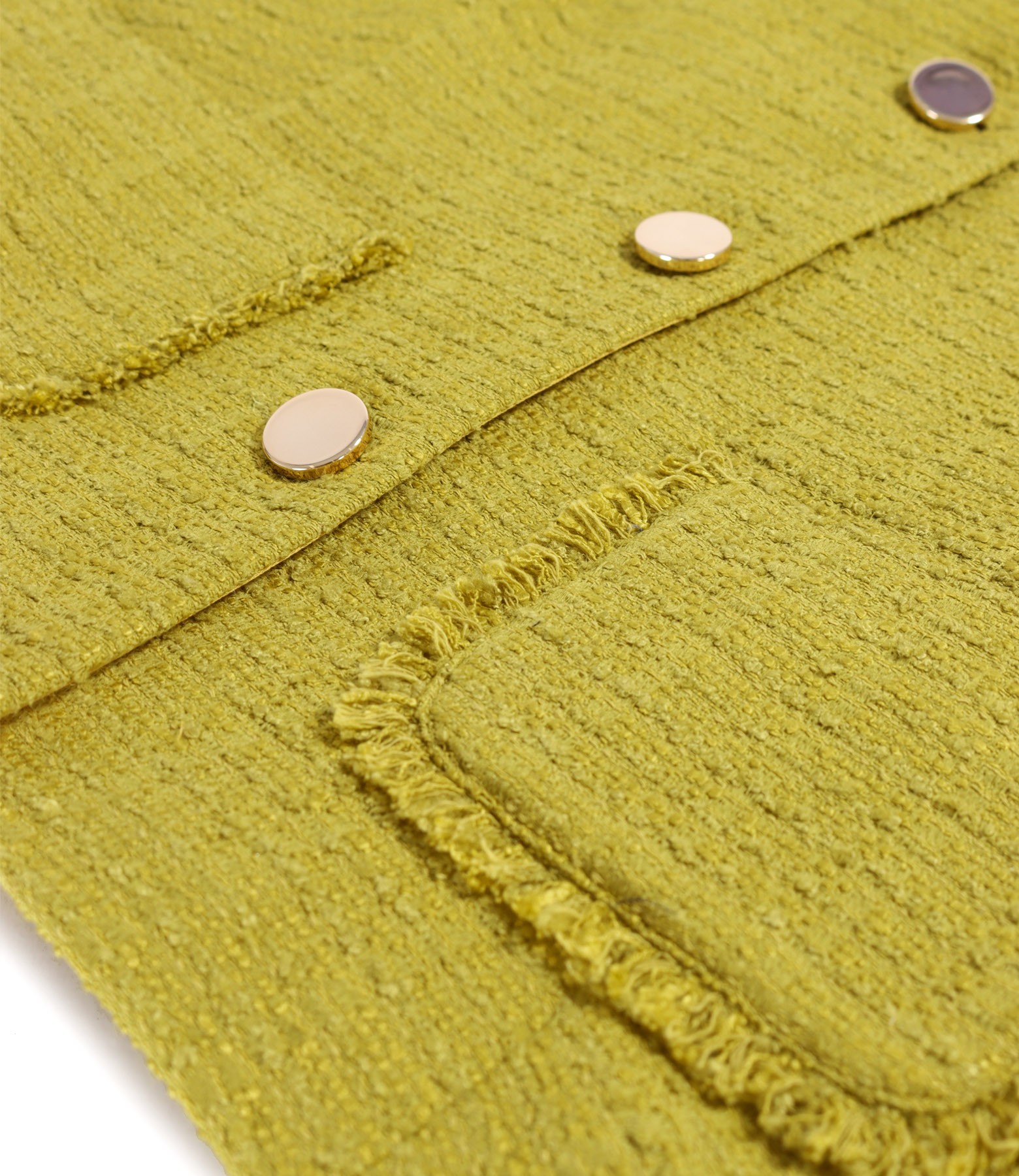 Elegant jacket made of viscose and cotton curls, with a round neckline and pockets with fringes applied to the front. It closes with 5 buttons on the middle front.