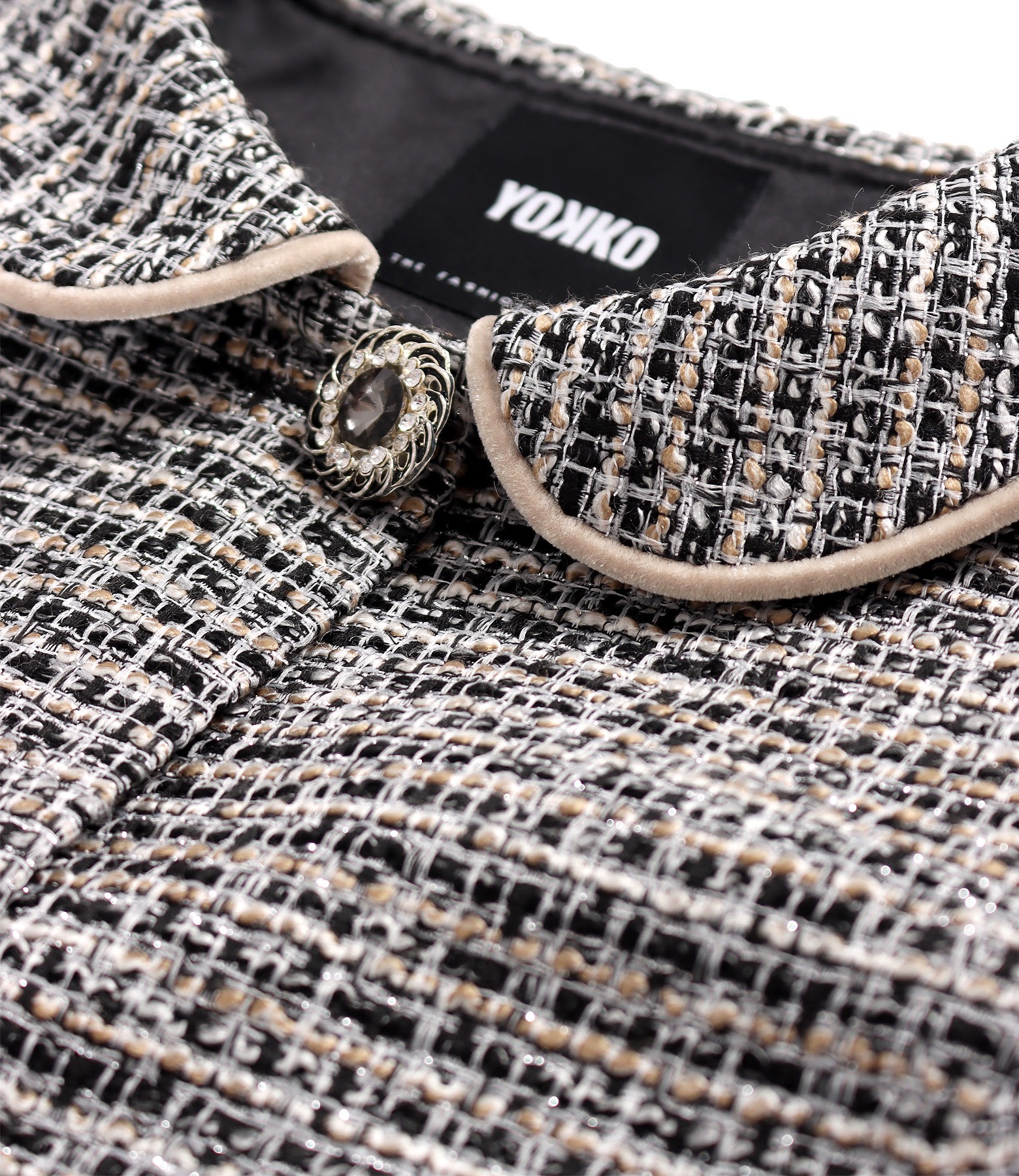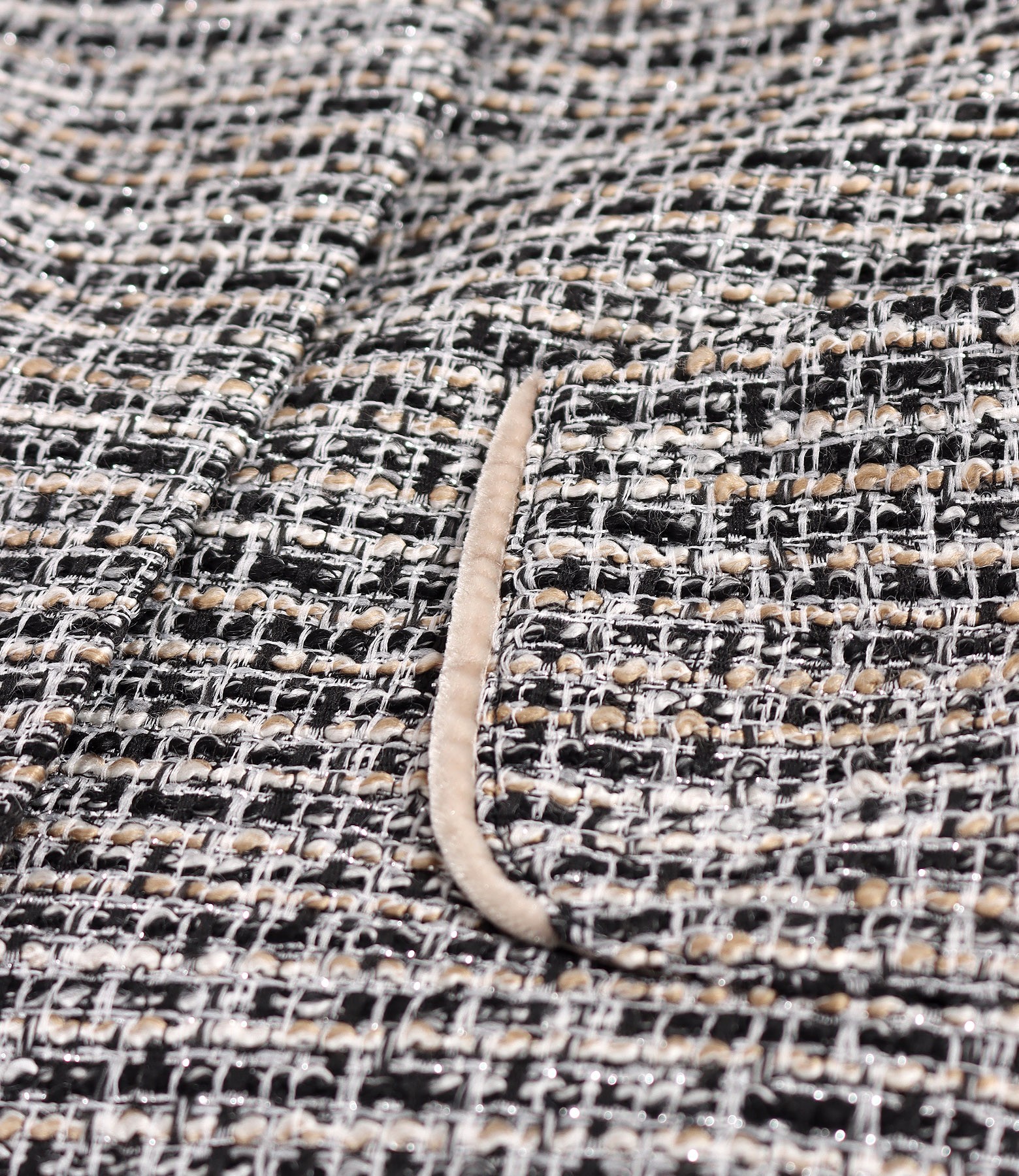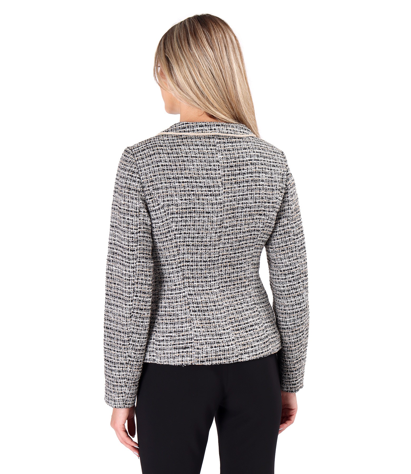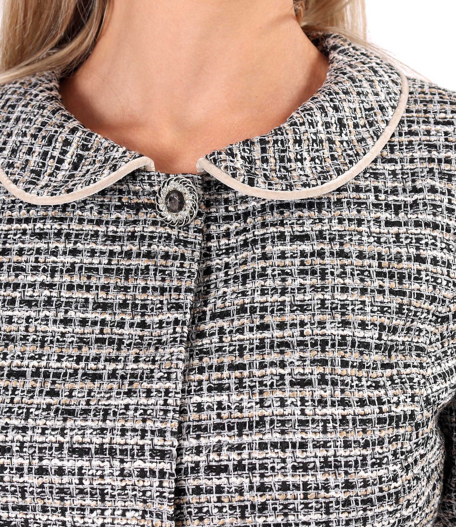 Elegant jacket made of loops with viscose and metallic thread, padded, with a round collar with a removable brooch, and velvet trim on the collar and left pocket. It closes with 5 staples in the middle of the face.