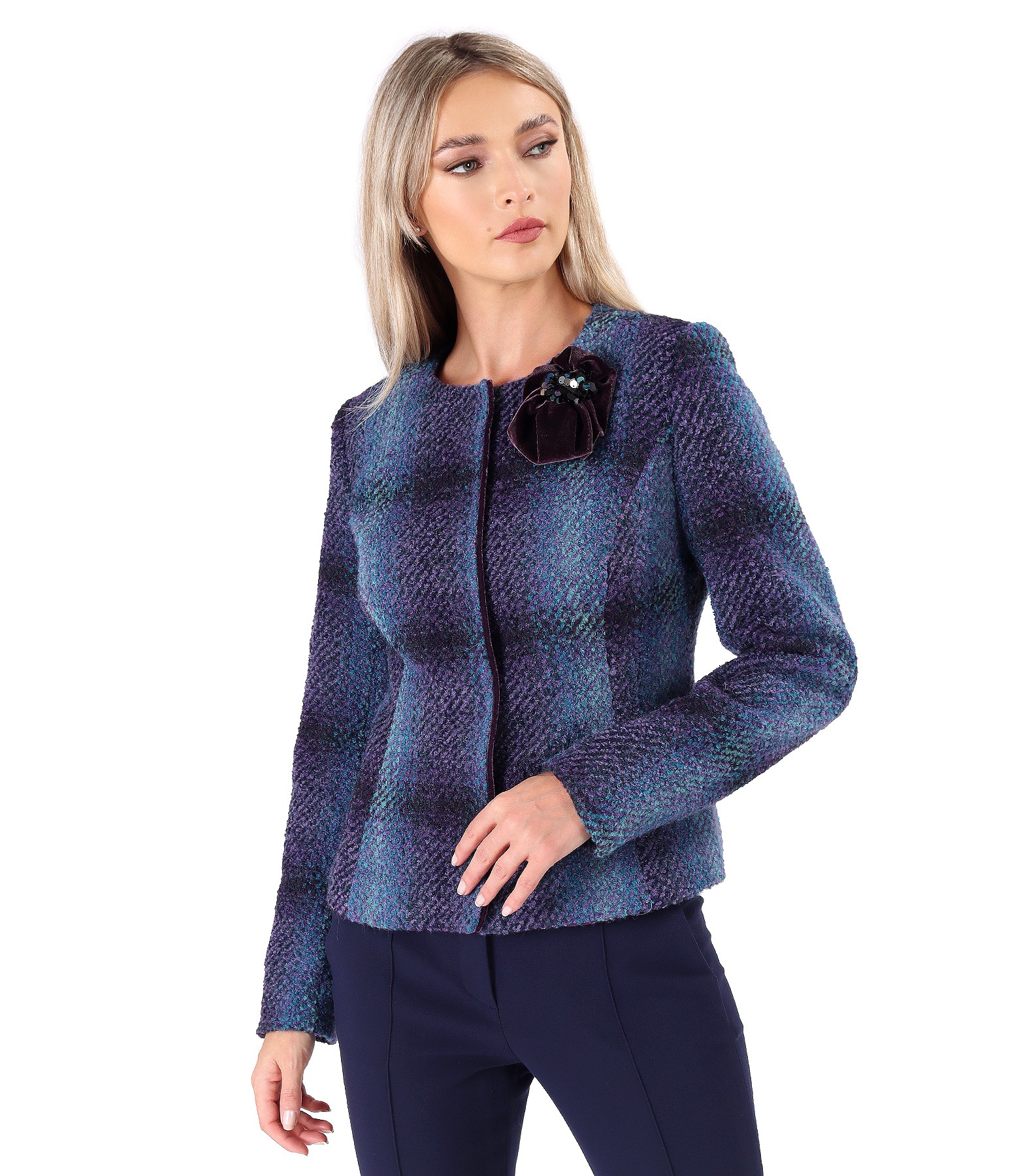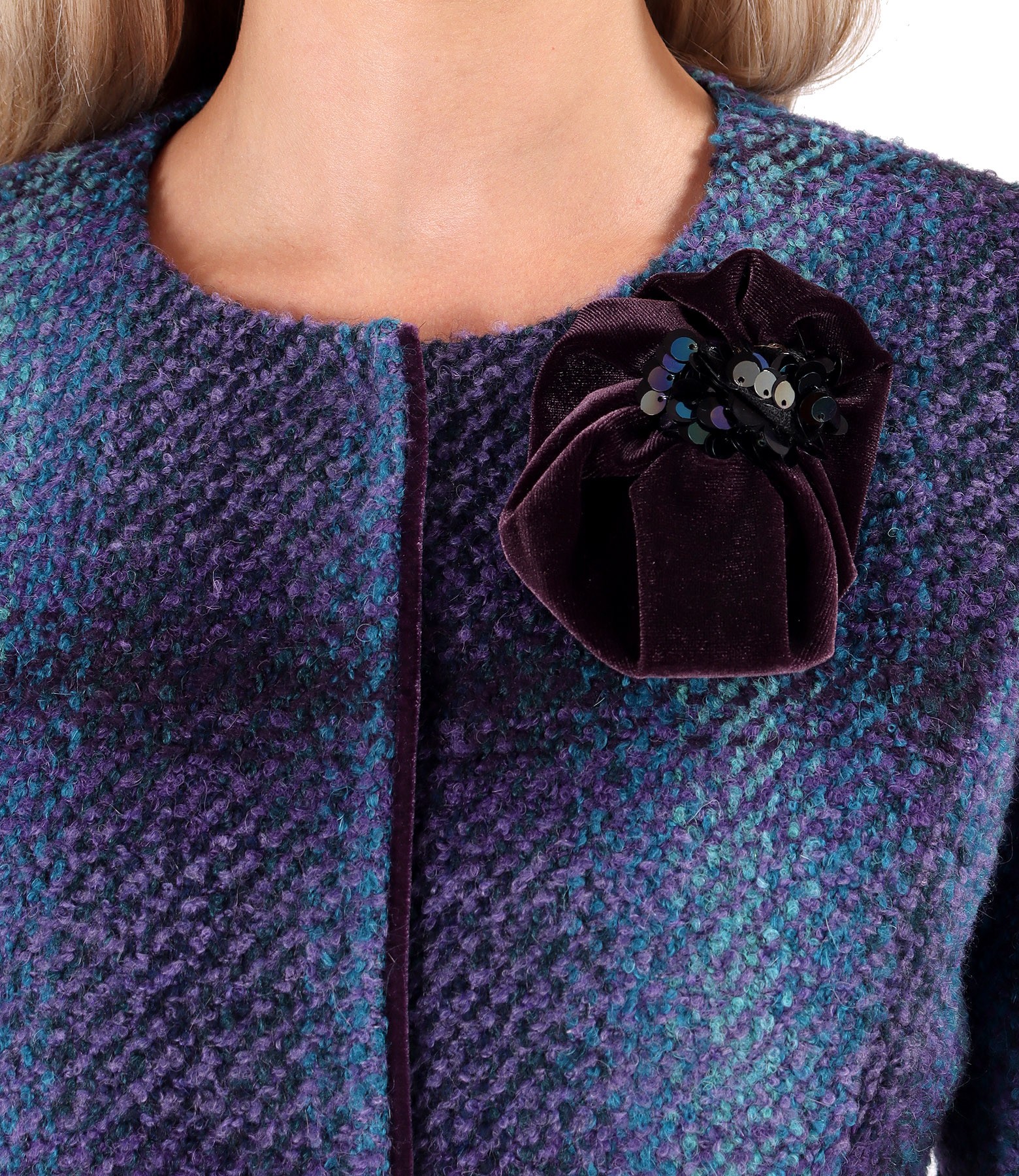 Elegant jacket made of thick multi-colored loops with wool and alpaca, without collar, padded, with a neckline near the neck, and with a detachable brooch, made by hand, on the neckline. It closes with 5 staples on the face.