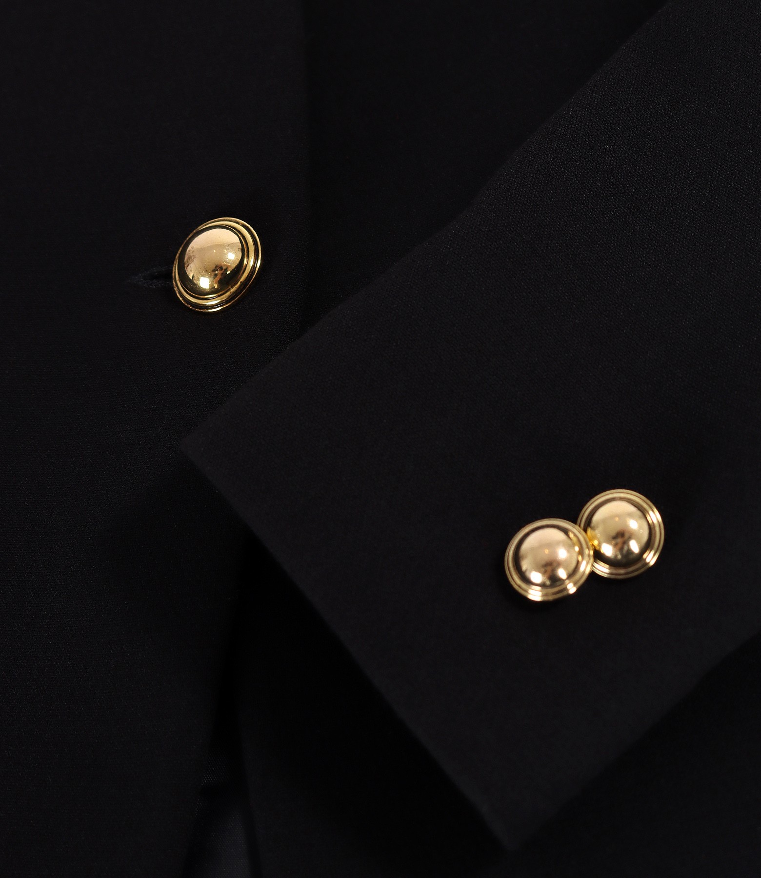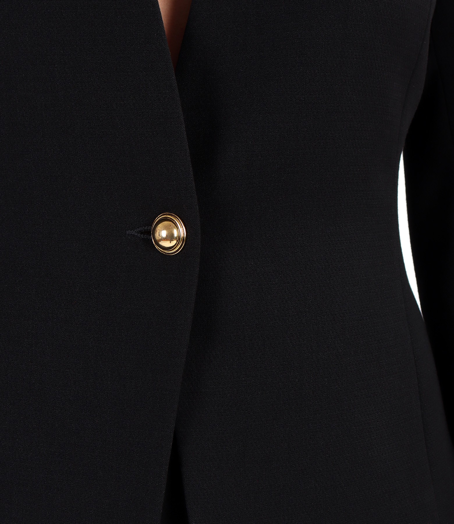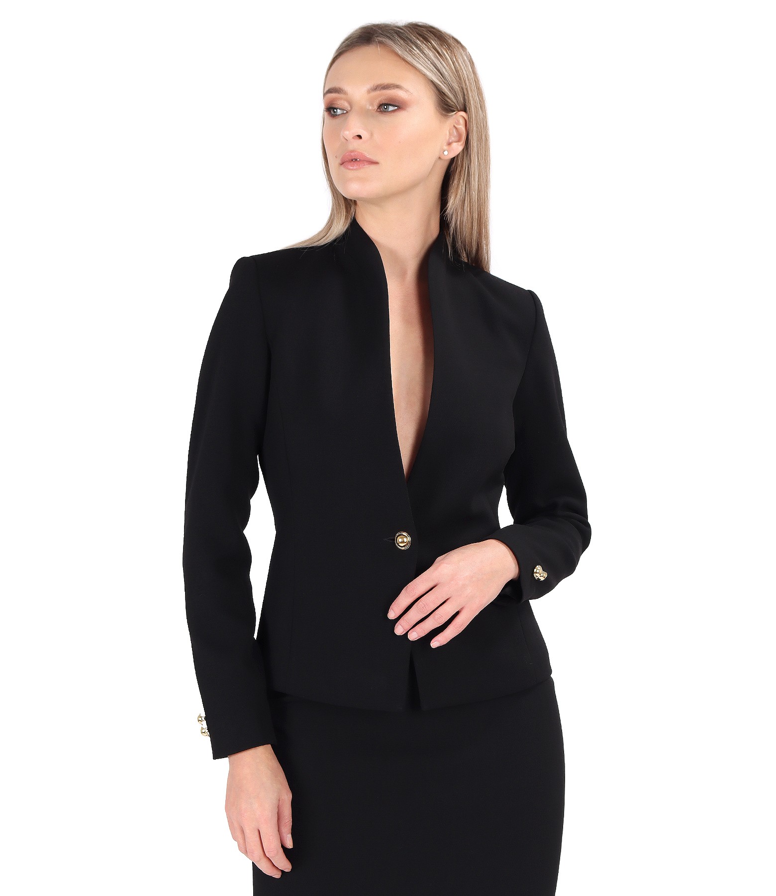 Elegant jacket made of thick elastic fabric, padded, with tunic collar and deep neckline. Closes with a button on the face.