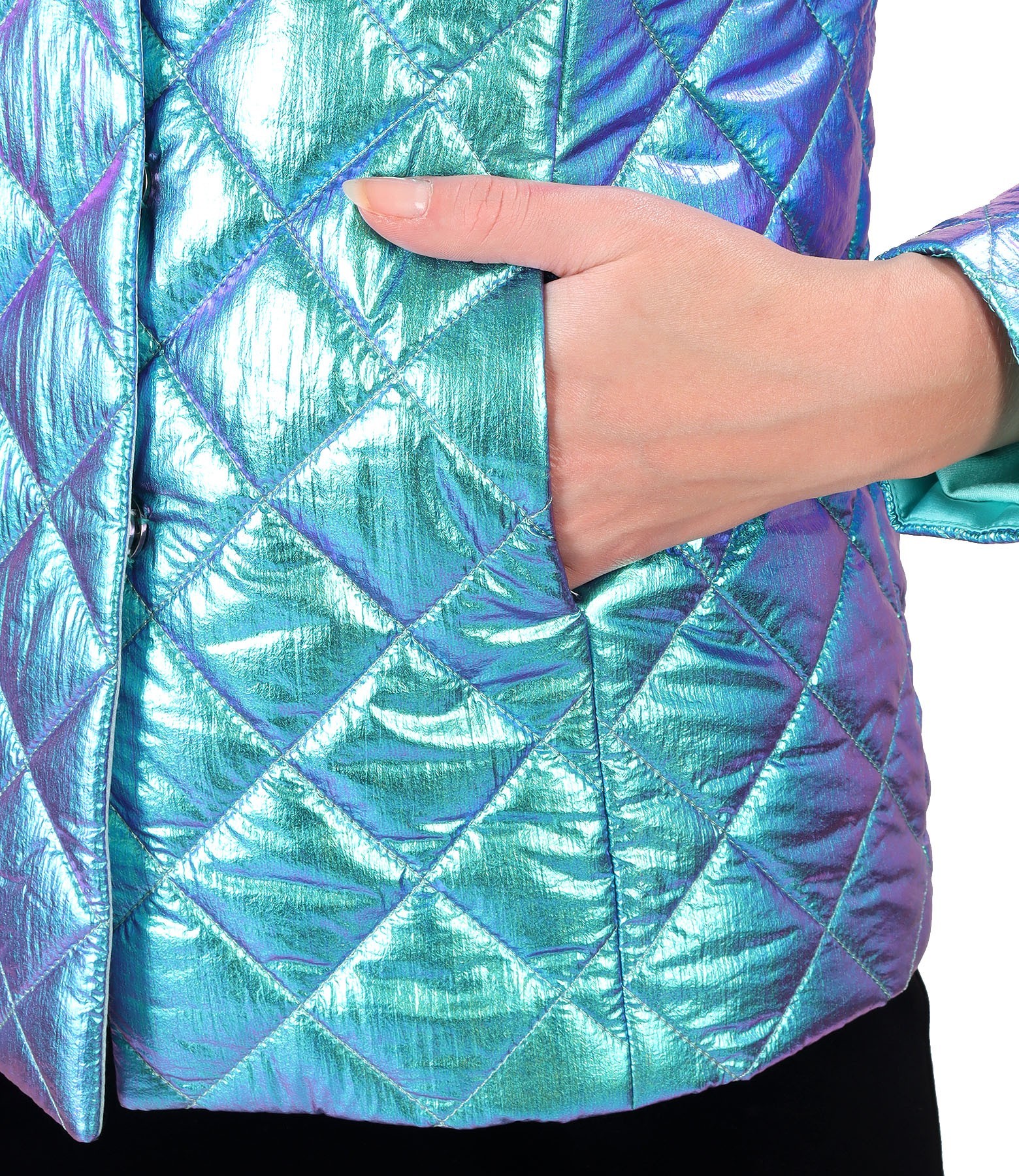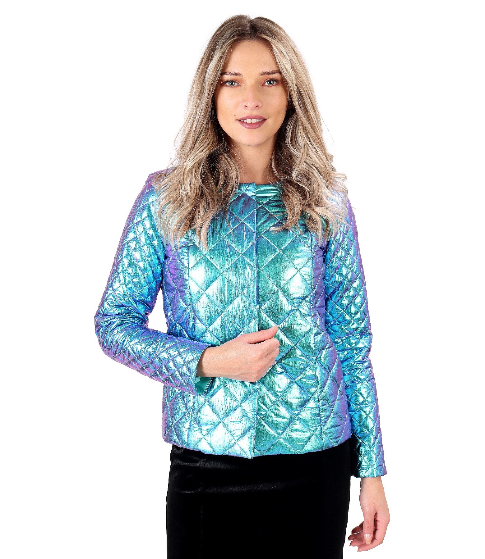 Elegant waterproof quilted fabric jacket with changeable effect, lined with elastic jersey, with long sleeves and side pockets. It closes with 5 pairs of staples in the middle of the front. No ironing required.