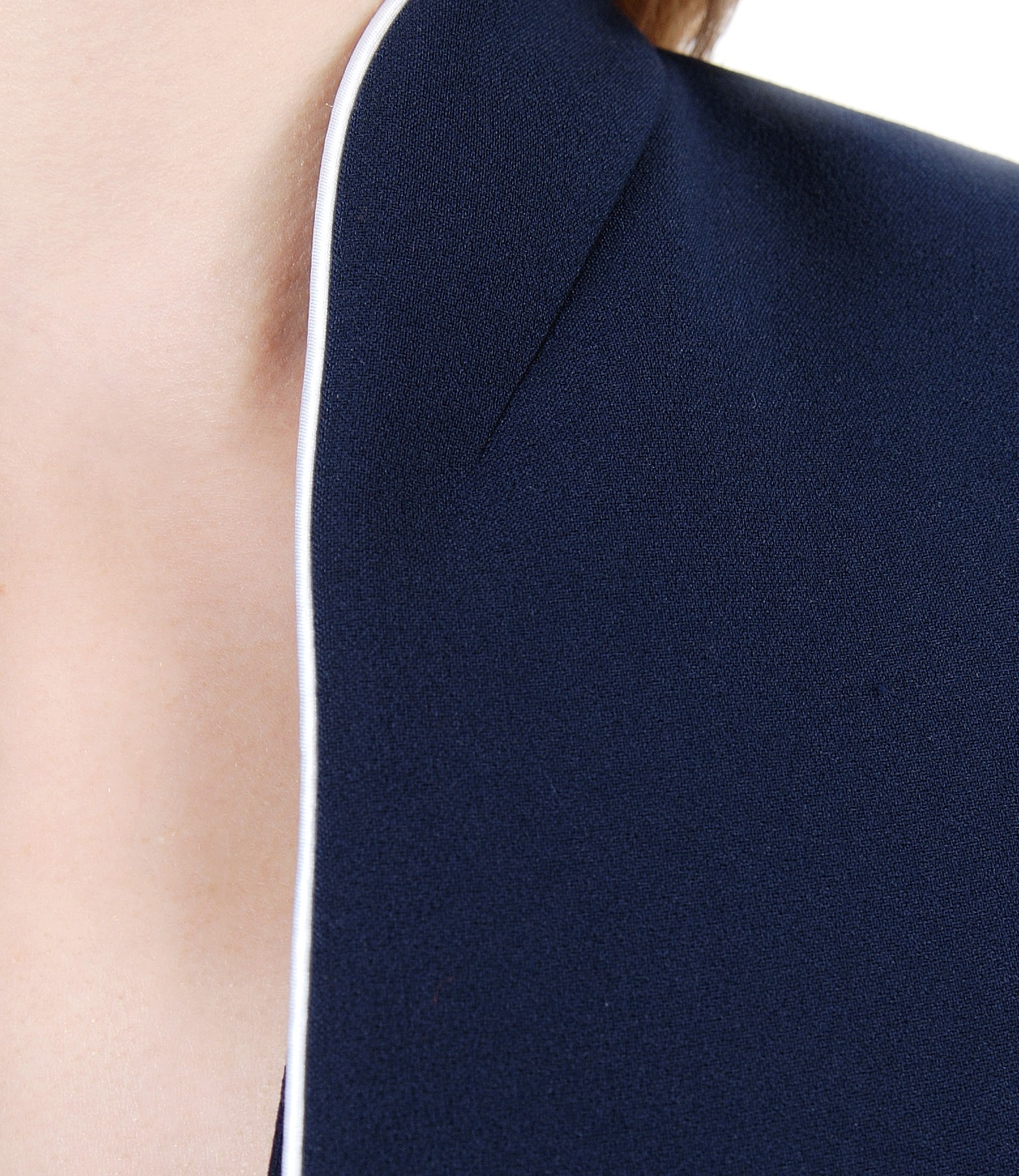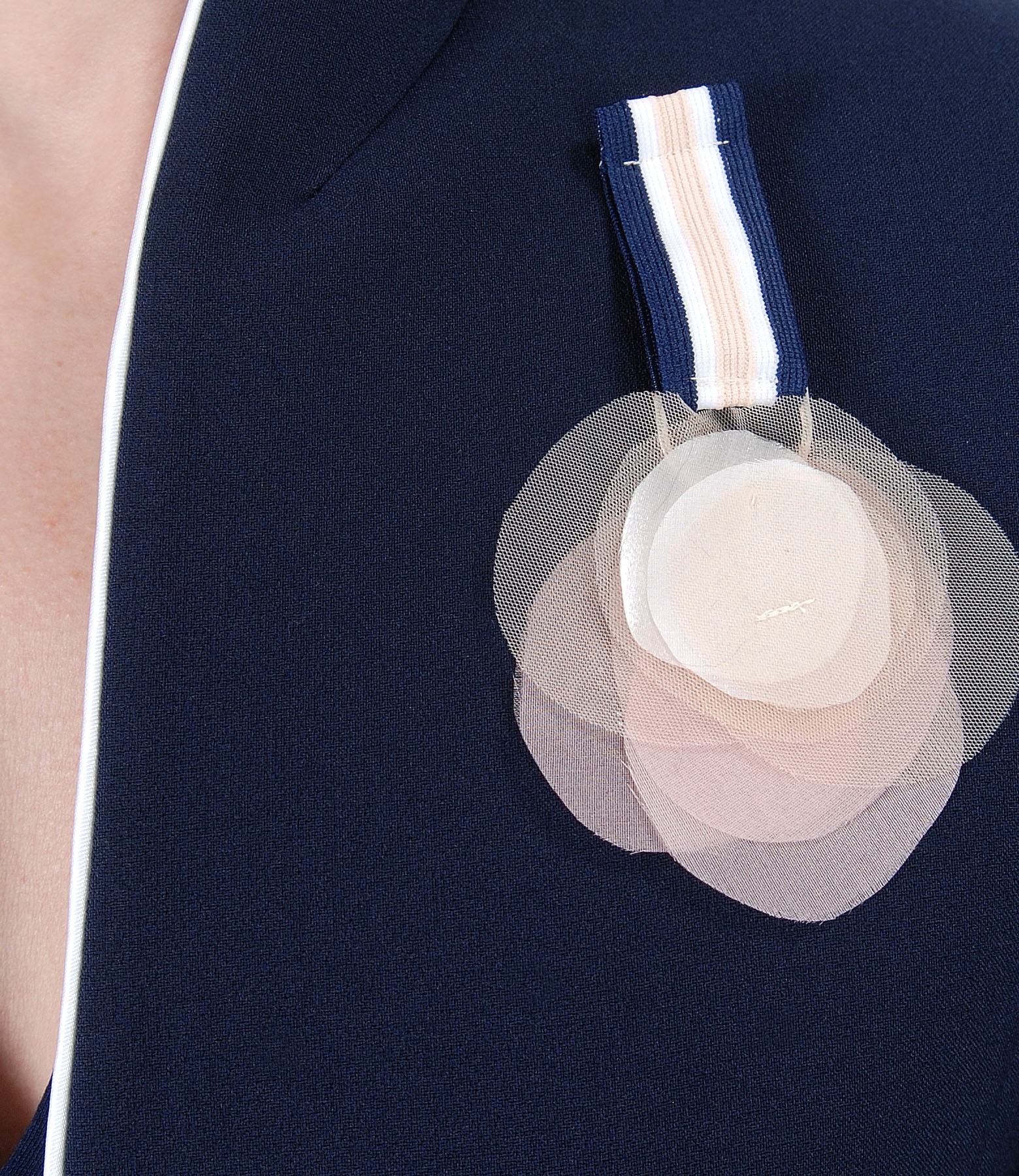 Elegant jacket, with tunic collar, round low-cut neck and accessory brooch on the collar. Closes with two front staples.