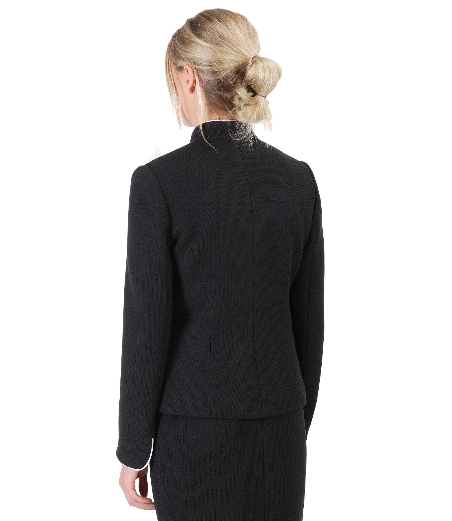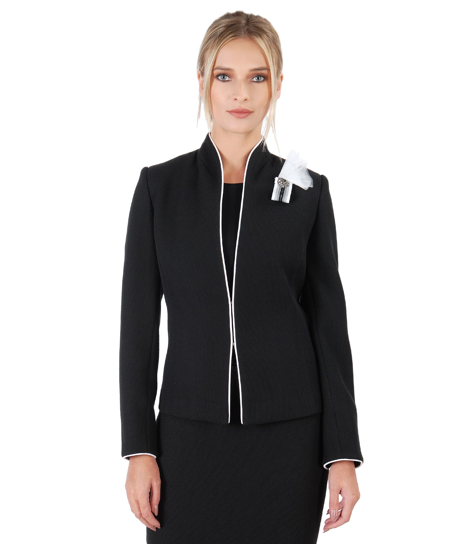 Elegant jacket made of textured fabric, with tunic collar, deep low-cut neck and accessory brooch embellished with crystals on the collar. Closes with two front staples.