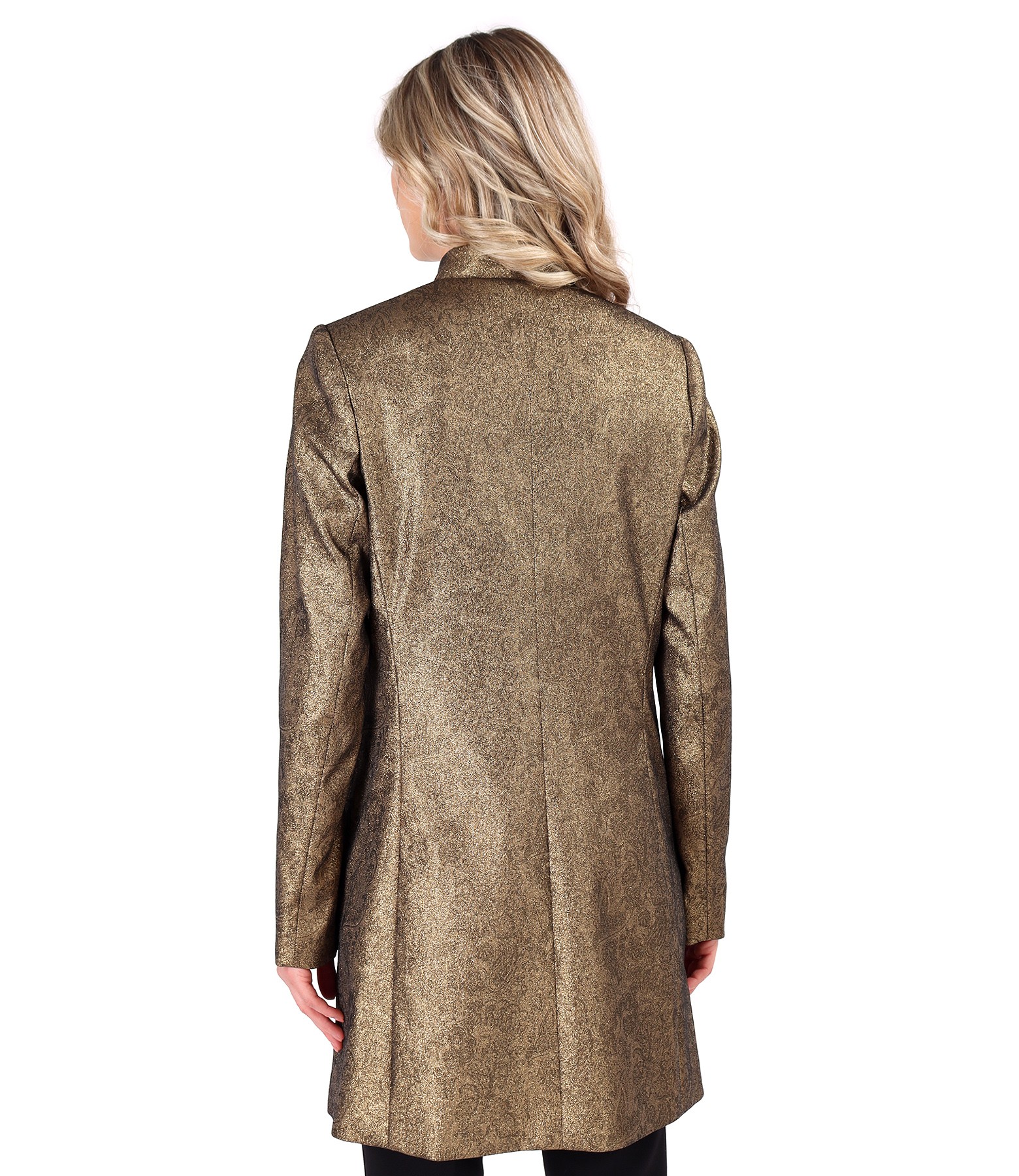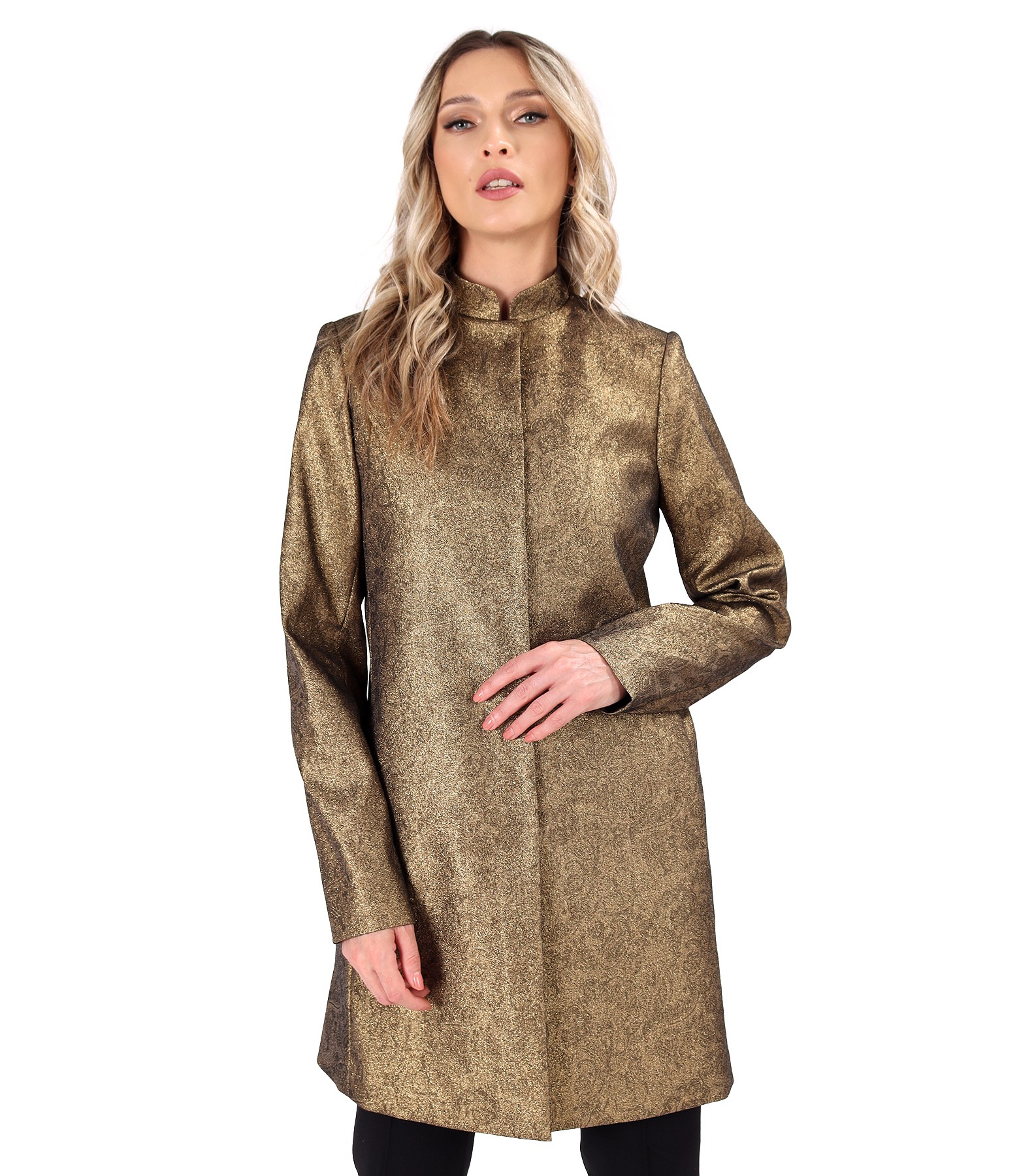 Elegant jacket with metallic elastic cotton, lined, with a tunic-like collar, with a neckline near the neck and with two side pockets. It closes on the front with 5 staples up to the base of the neck.