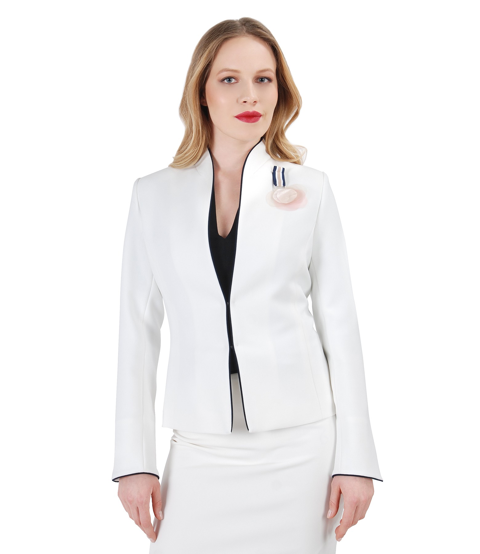 Elegant jacket, with tunic collar, round low-cut neck and accessory brooch on the collar. Closes with two front staples.